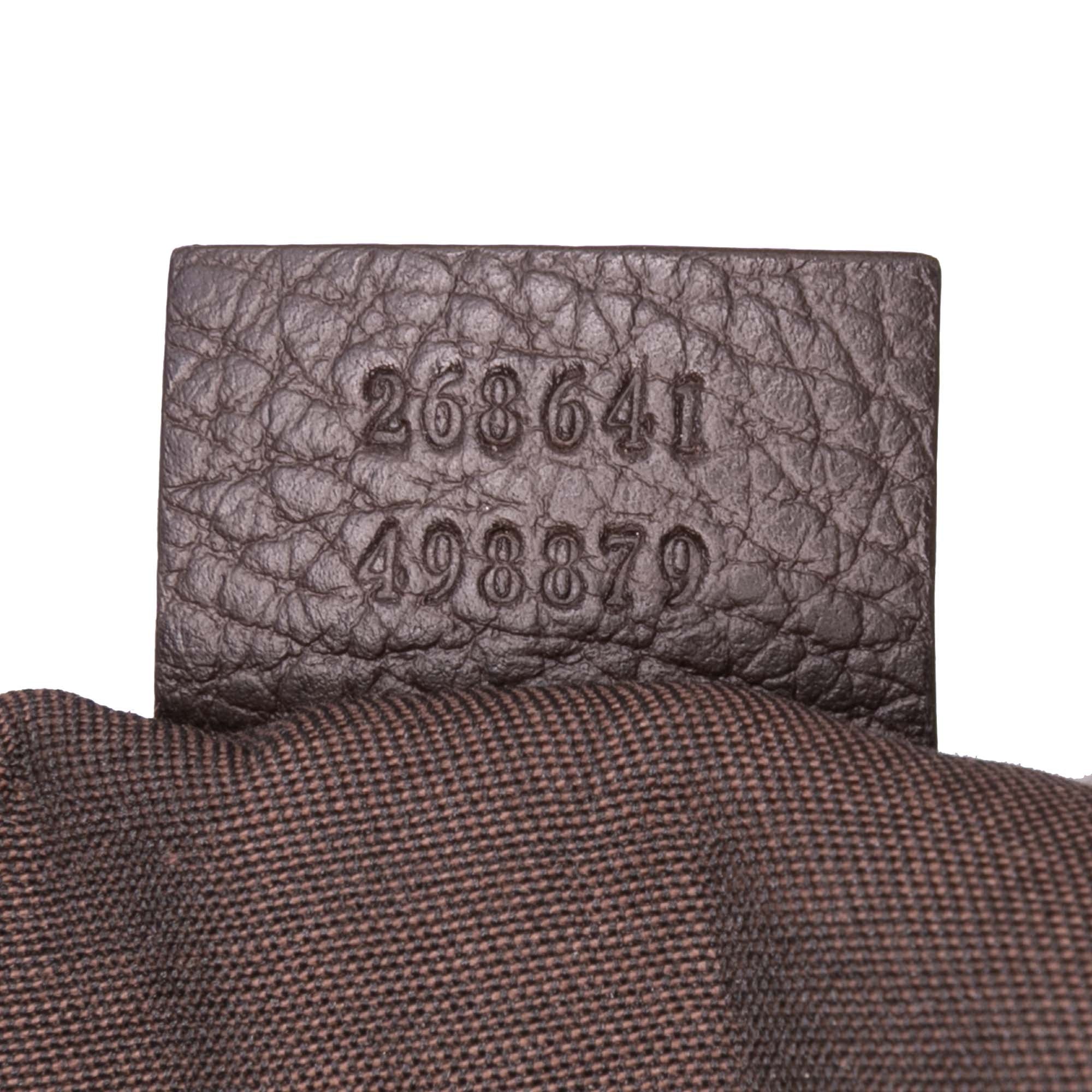 Product Details: Brown Gucci GG Crystal Abbey D Ring Convertible Tote Satchel. The Abbey satchel features a coated canvas body with leather trim, flat leather handles, detachable rolled leather strap, open top with magnetic snap closure, and interior zip and slip pockets. 13.6" L x 15.7" W x 0.8" D, 4.3" drop. Serial number 268641 498879.