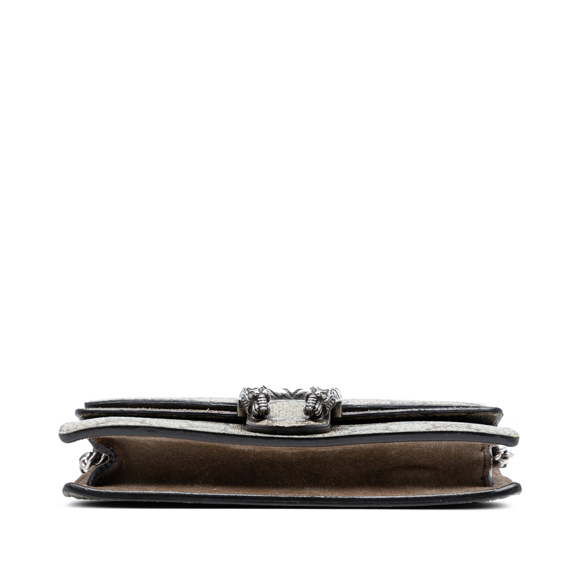 Product Details: Brown Gucci Mini GG Supreme Dionysus Crossbody. This crossbody bag features a canvas body with suede leather trim, a silver-tone chain link strap, and a top flap with magnetic snap closure. 3.9" L x 6.5" W x 1" D. Serial number 476432·496334·.