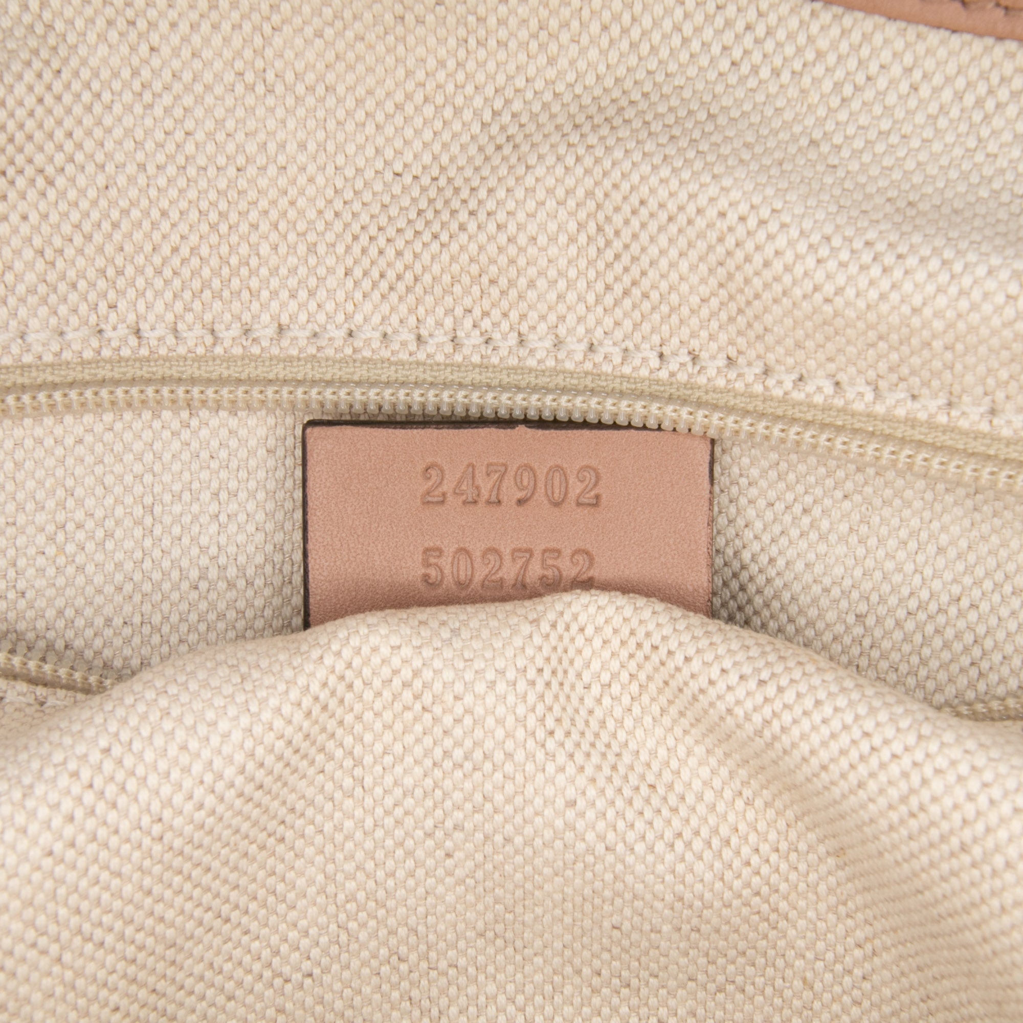 Product Details: Brown Gucci Diamante Canvas Sukey Satchel. The Sukey features a canvas body with leather trim, rolled leather handles, a detachable flat leather strap, a top zip closure, and an interior zip pocket. 9.1" L x 13.4" W x 5.5" D, 5.5" drop. Serial number 247902 502752.