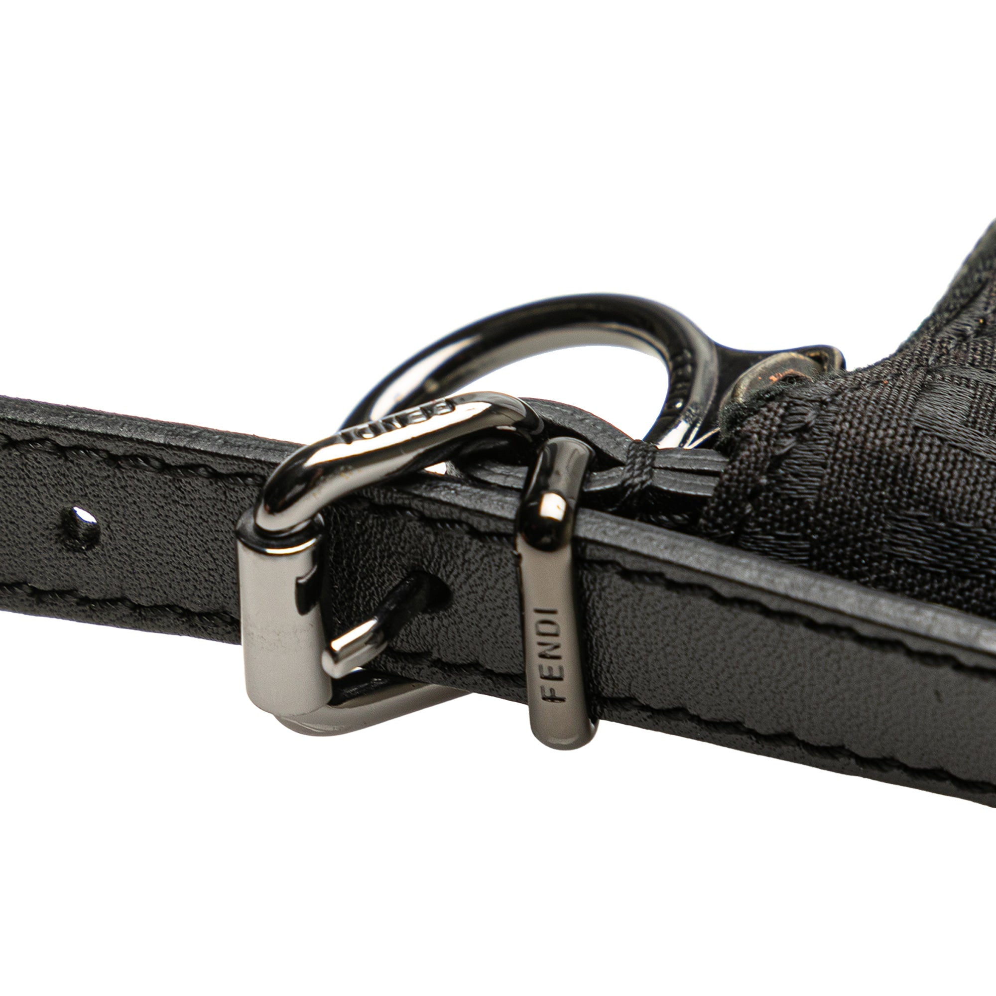 Product Details: Black Fendi Zucchino Canvas Oyster Shoulder Bag. This shoulder bag features a canvas body with leather trim, a flat leather strap, a top zip closure, and an interior slip pocket. 7.9" L x 9.3" W x 0.2" D, 8.3" drop. Serial number 2444 8BR248 038.
