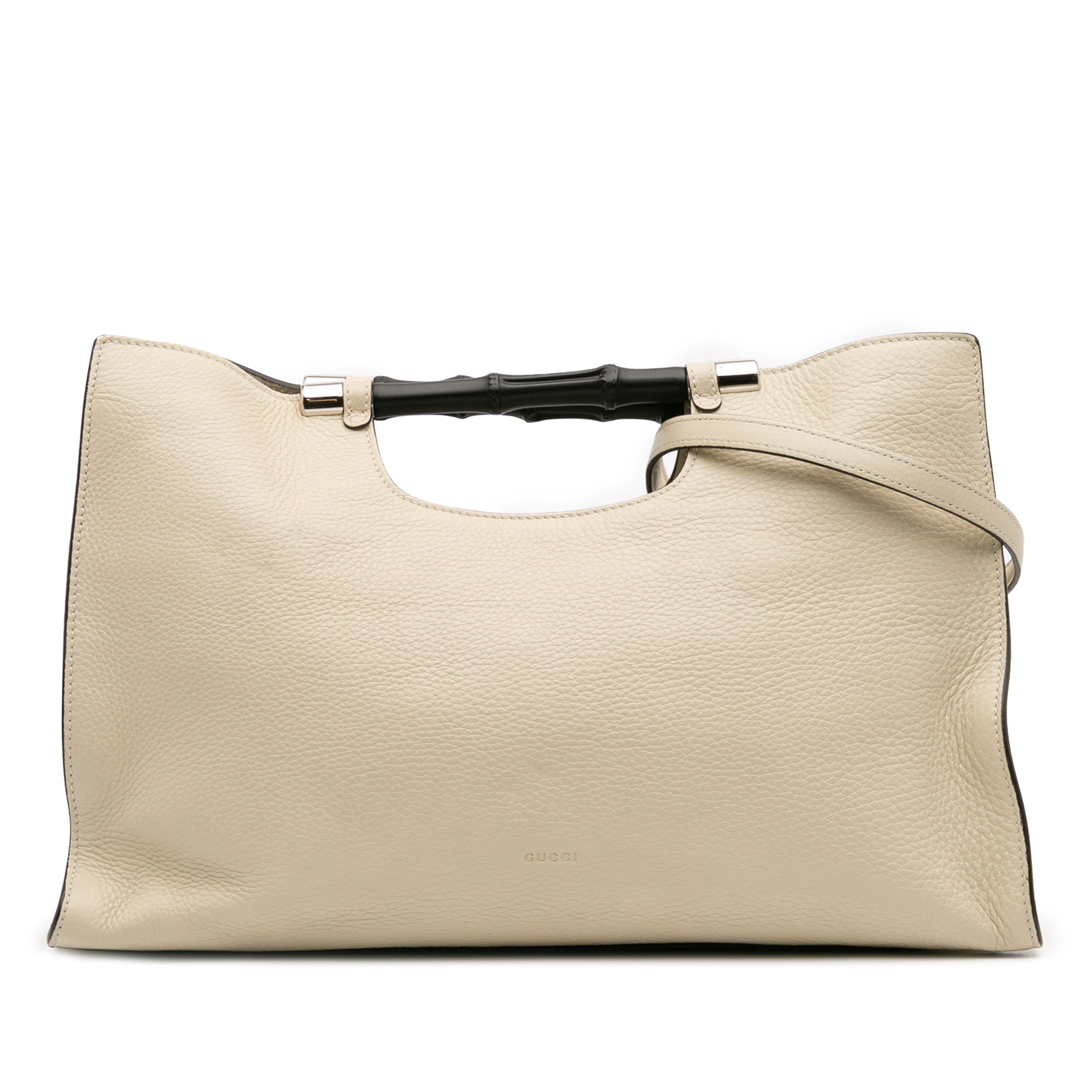 Please note this is a pre-owned item that may display signs of wear consistent with the condition listed above and shown in photos. Designer Revival guarantees this is an authentic White Gucci Medium Calfskin Bamboo Daily Shopper Satchel or 100% of your money back. Learn more about our authentication process.