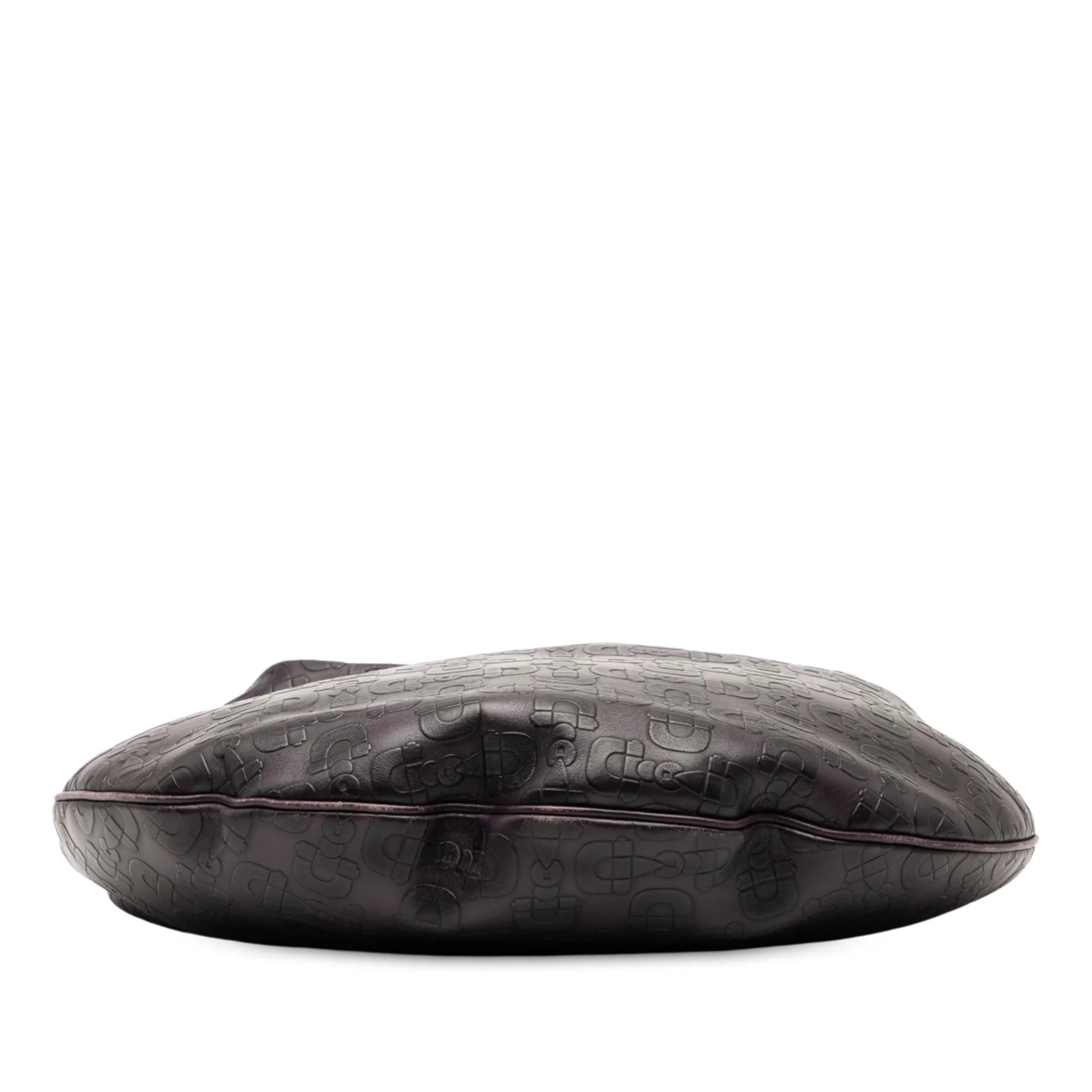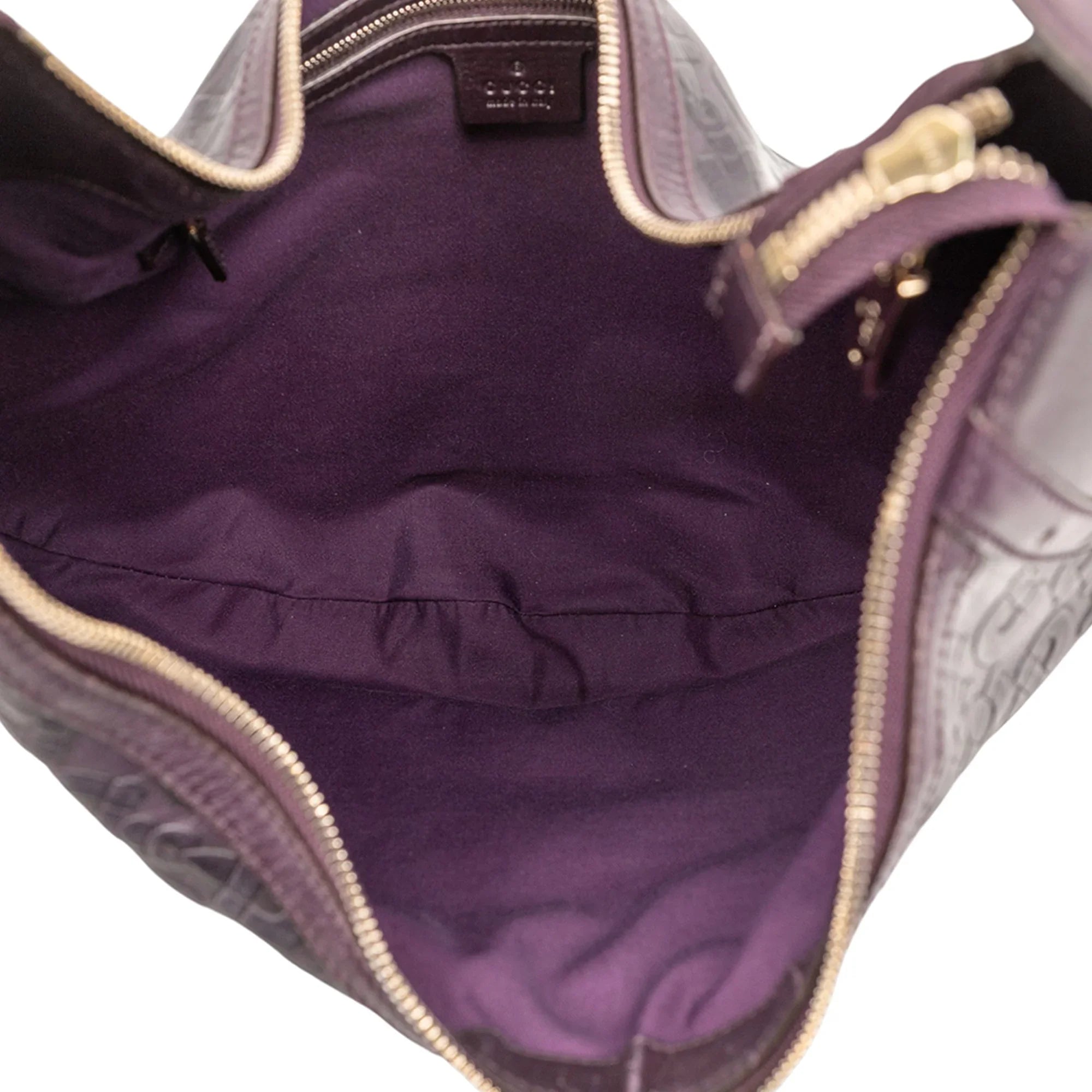 Product Details: Dark Purple Gucci Embossed Leather Horsebit Glam Hobo. This hobo features an embossed leather body, flat strap with a metal buckle, a top zip closure, and an interior zip pocket. 11.4" L x 15.4" W x 1.2" D. Serial number 145764 204046.