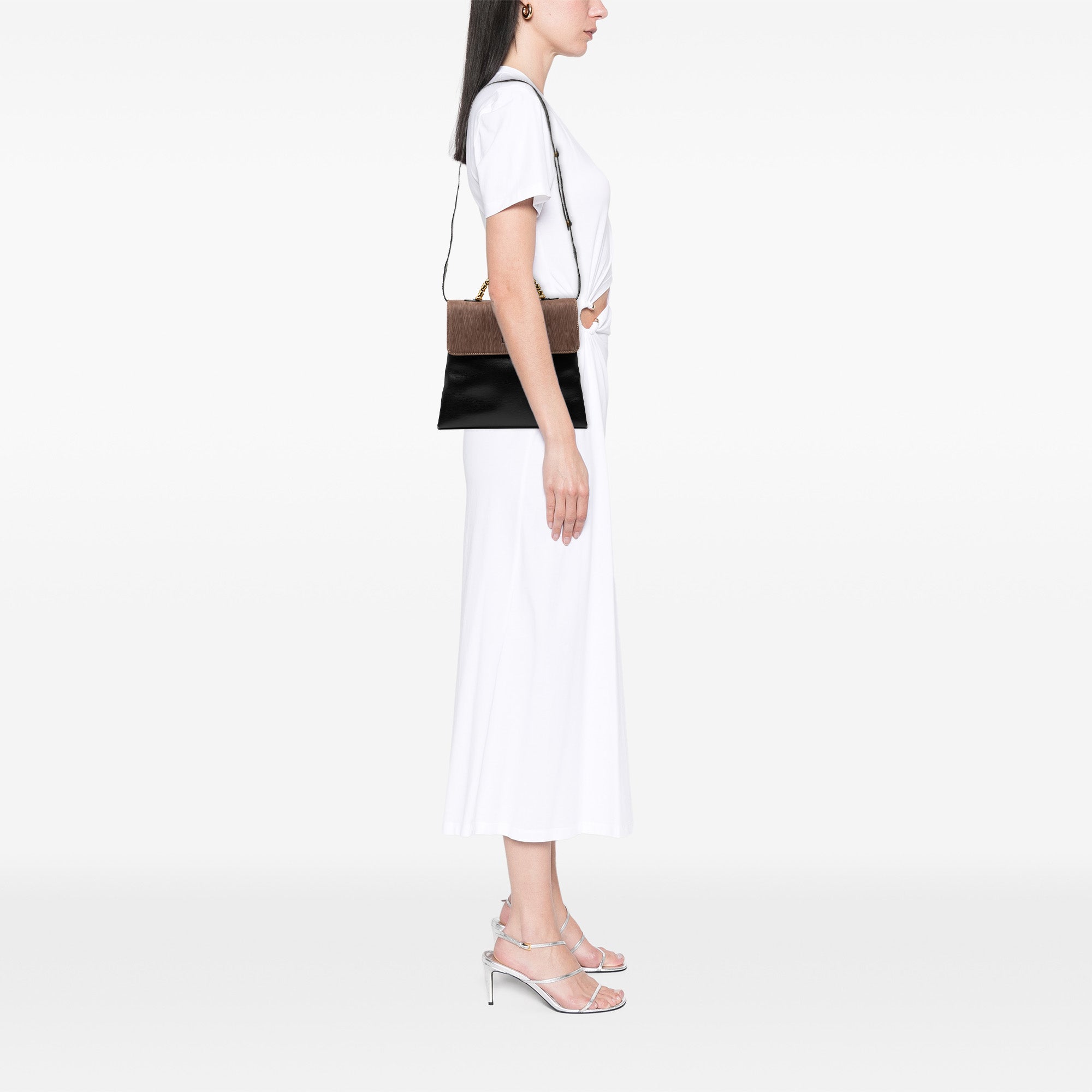 Product Details: Black LOEWE Leather Velazquez Twist Satchel. .This satchel features a leather body, a rolled leather handle with gold-tone hardware, a front flap with magnetic snap closure, and an interior zip pocket. 8.7" L x 10.2" W x 3.5" D, 2" drop. Serial number L24.