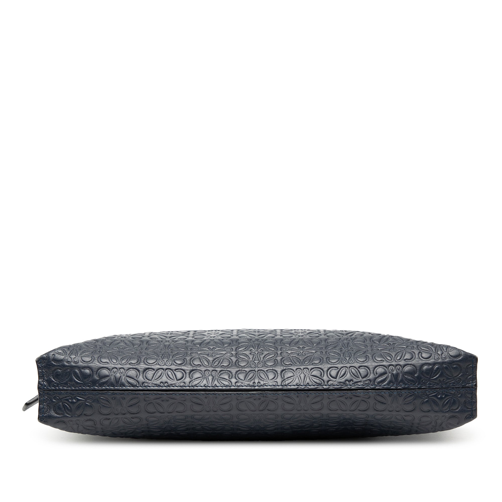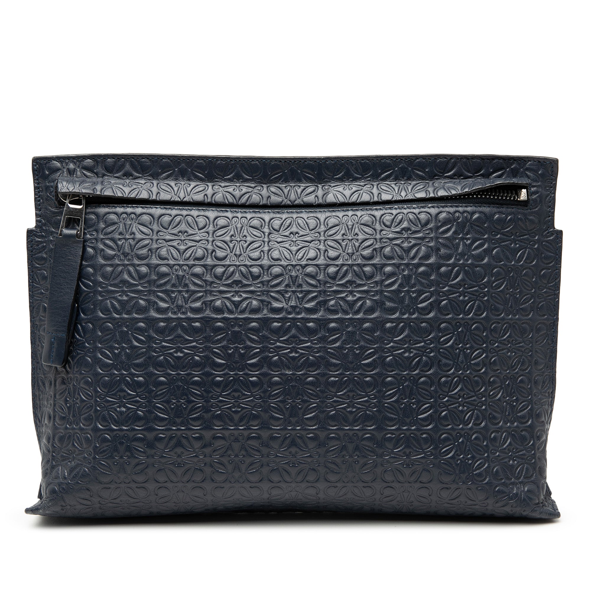 Product Details: Blue LOEWE Embossed Anagram Leather Repeat T Clutch. This clutch bag features an embossed leather body, a front zip closure, and an interior slip pocket. 7.5" L x 11.8" W x 1.6" D. Serial number 261506.