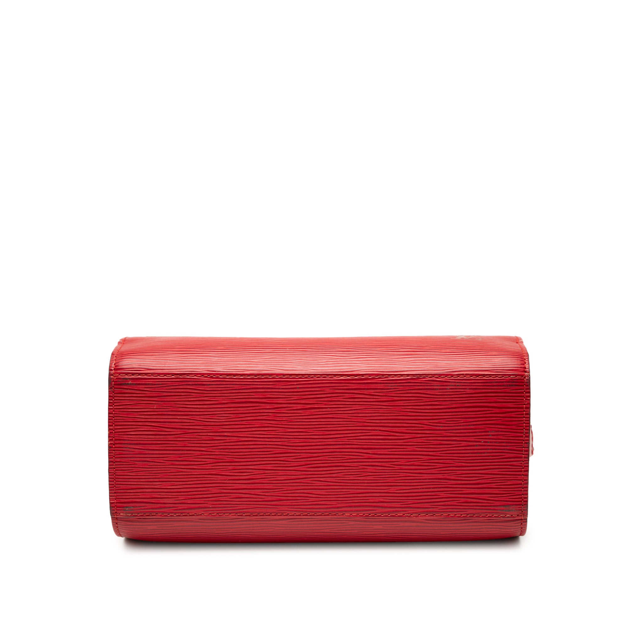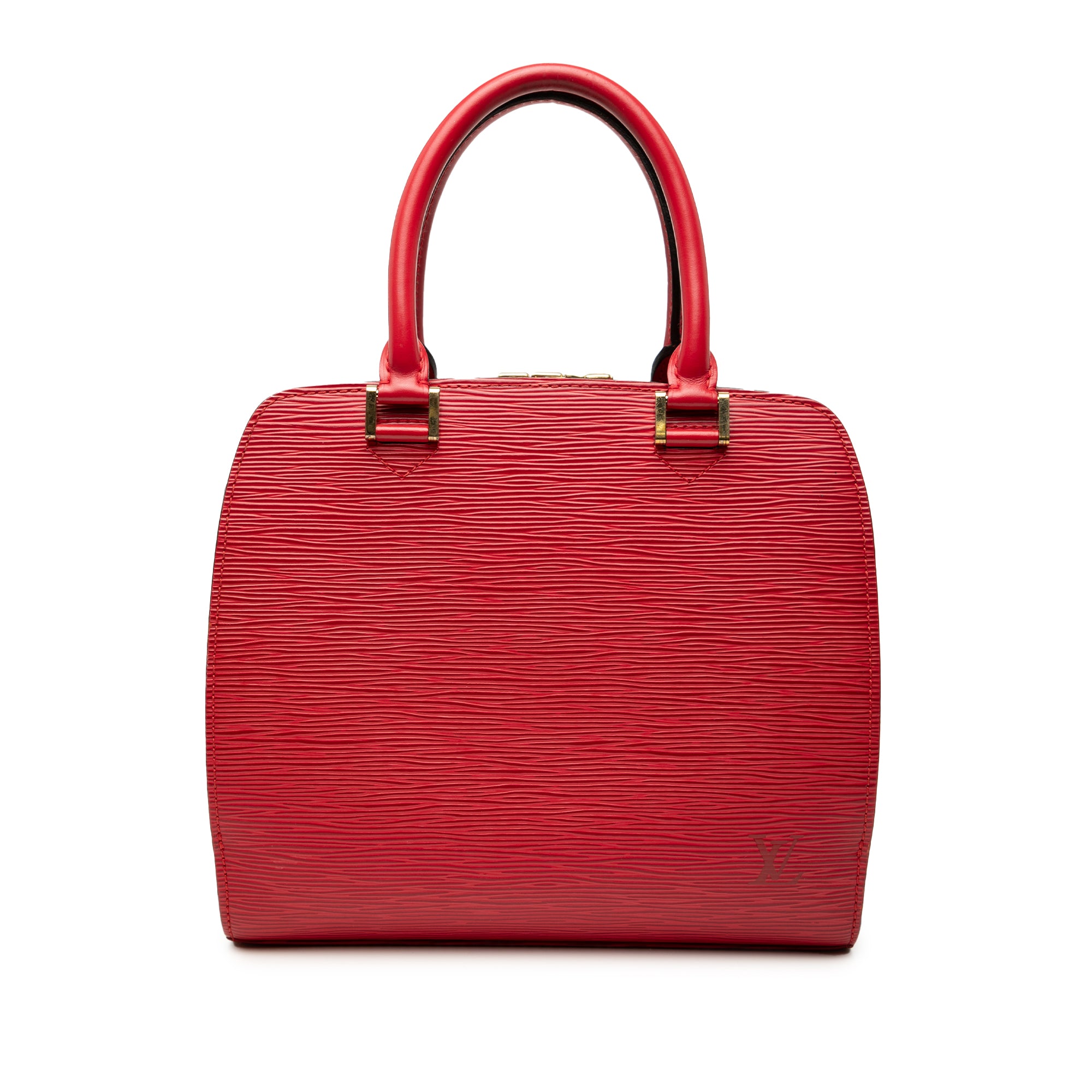 Product Details: Red Louis Vuitton Epi Pont Neuf Handbag. The Pont Neuf features an epi leather body, rolled leather handles, a 2-way top zip closure, and an interior slip pocket. 8.3" L x 9.6" W x 4.3" D, 4.5" drop. Serial number MI0969.