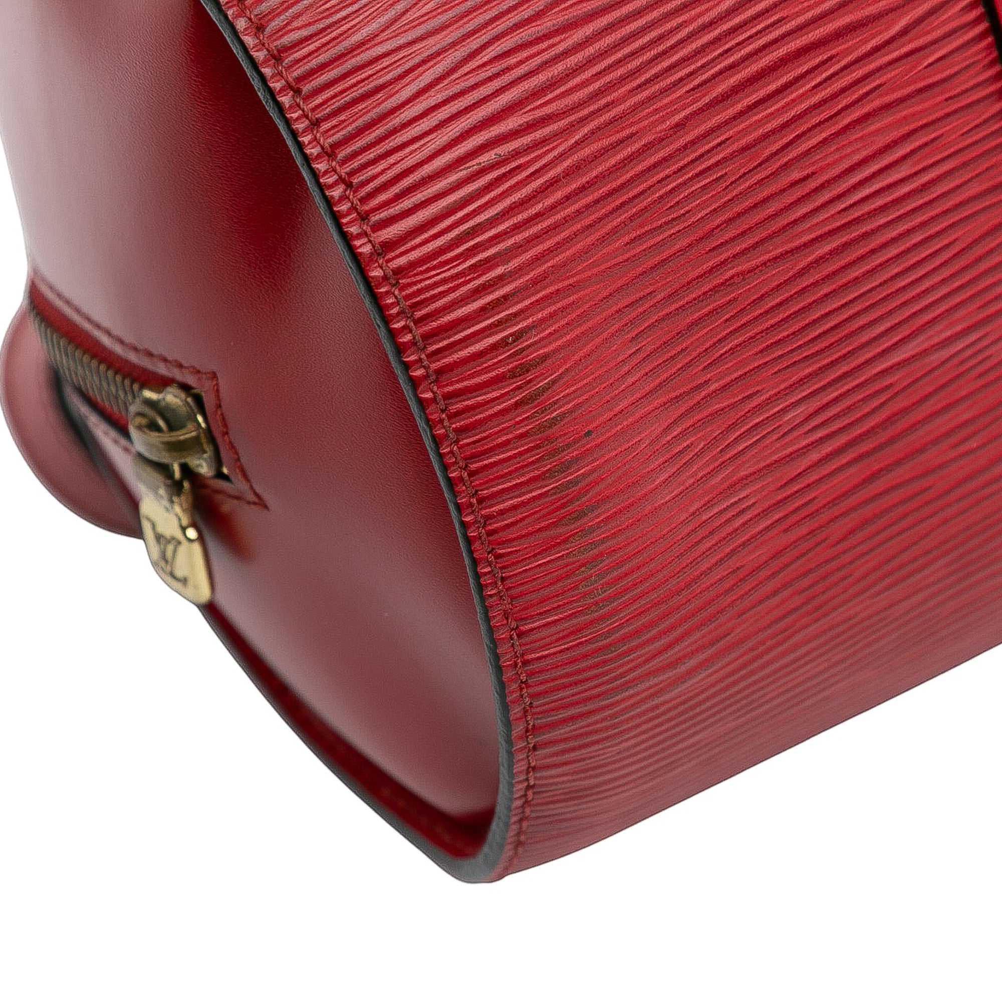 Product Details: Red Louis Vuitton Epi Soufflot Handbag. The Epi Soufflot features an epi leather body, flat leather handles, a top zip closure, and an interior slip pocket. 6.1" L x 12" W x 5.3" D. Serial number AR0948.