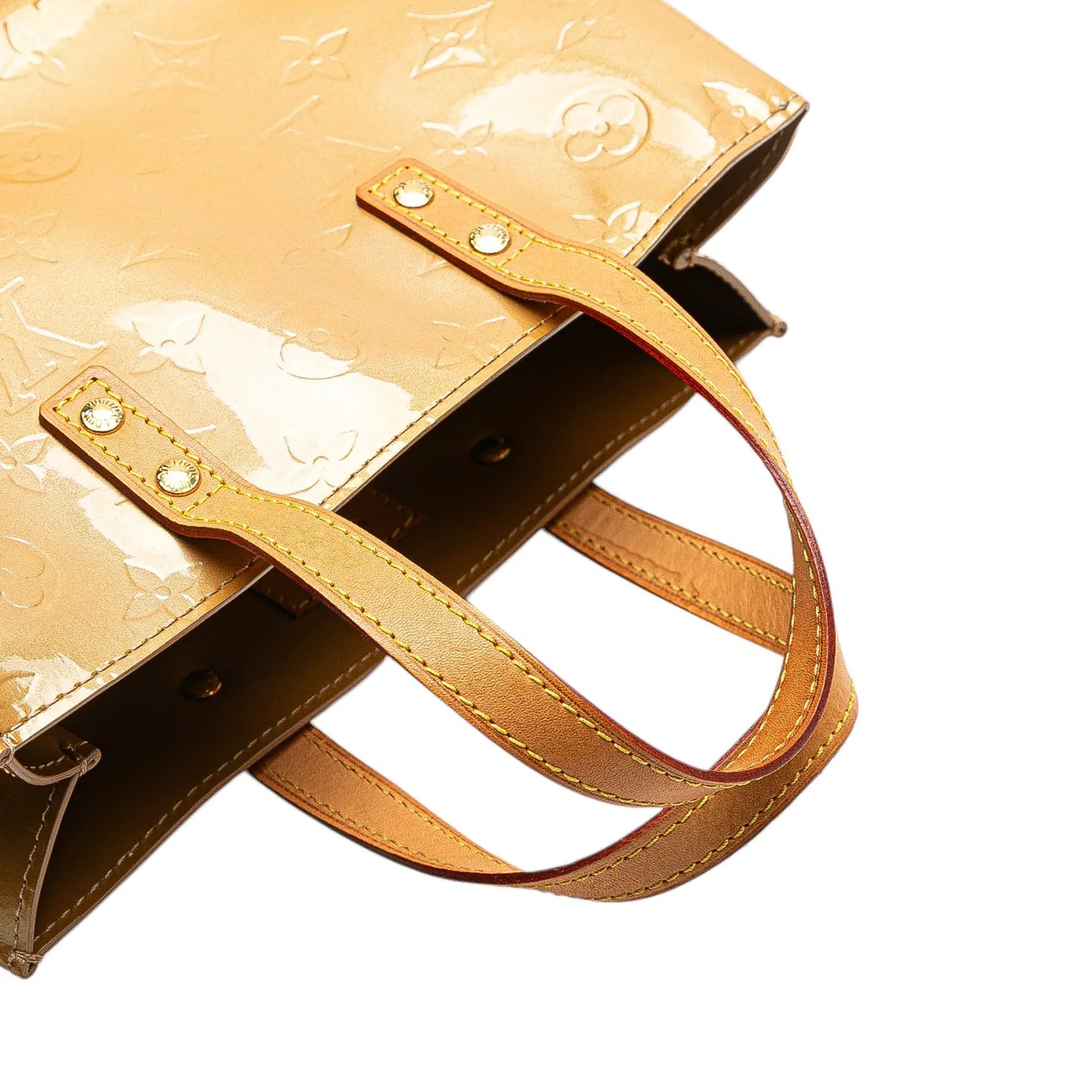 Product Details: Tan Louis Vuitton Monogram Vernis Reade PM Handbag. The Reade PM features a monogram vernis leather body, flat vachetta leather handles, an open top, and an interior zip pocket. 7.1" L x 8.7" W x 3.9" D, 3.9" drop. Serial number TH0016.