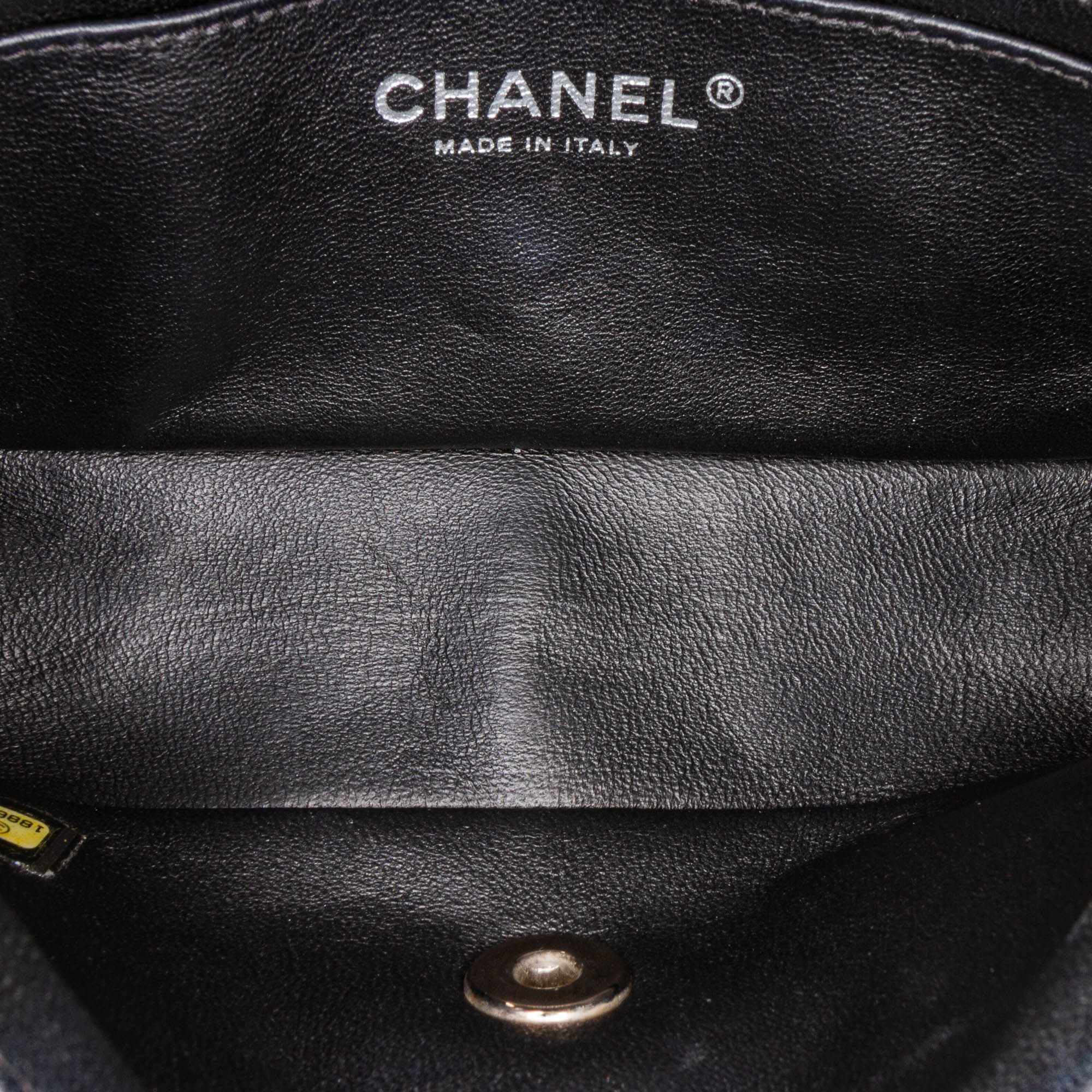 Product Details: Black Chanel Mini Rectangular Classic Patent Single Flap Crossbody Bag. This crossbody bag features a quilted patent leather body, a leather woven chain shoulder strap, a front flap with a twist lock closure, an exterior back slip pocket, and interior zip and slip pockets. 3.9" L x 7.5" W x 2.6" D. Serial number 18866077.