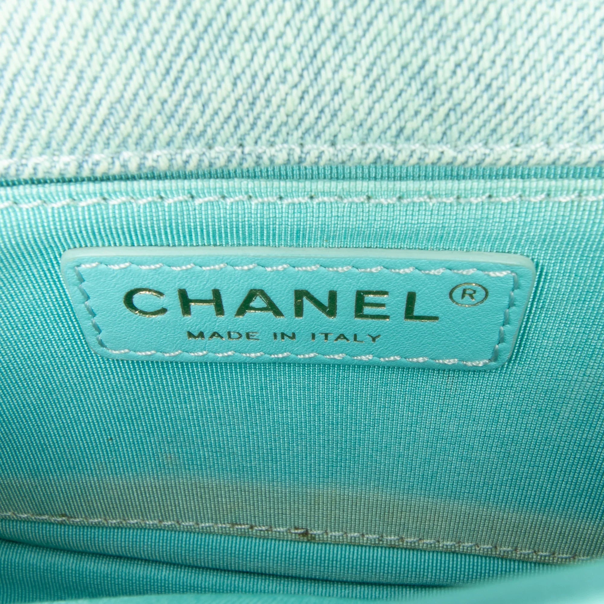 Product Details: Blue Chanel Mini CC Quilted Denim Messenger Flap Crossbody Bag. This crossbody features a quilted denim body with leather trim, a denim woven chain link strap with leather guard, a front flap with CC twist-lock closure, an exterior back slip pocket, and an under flap slip pocket. 4.9" L x 6.5" W x 1.8" D. Serial number 31424796.