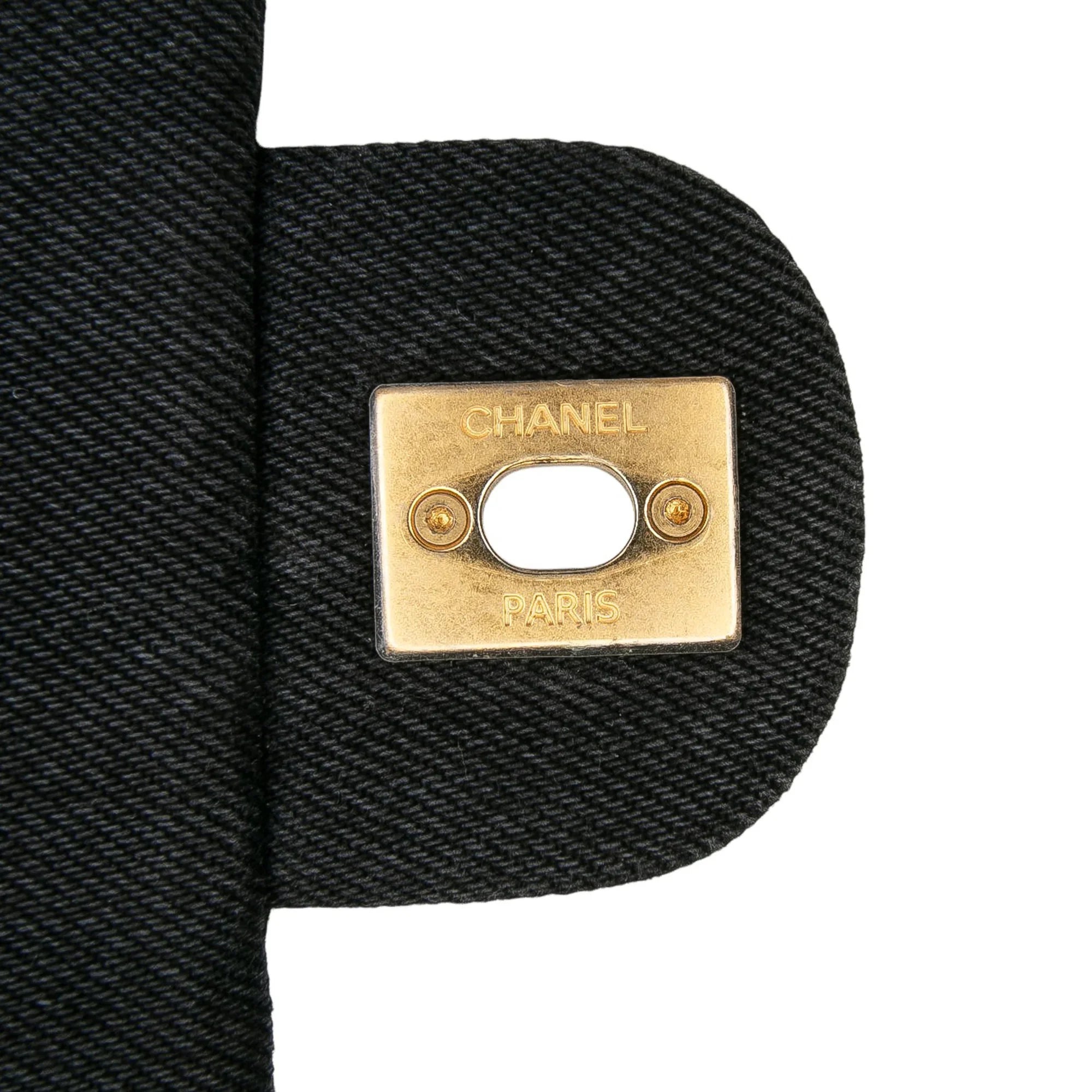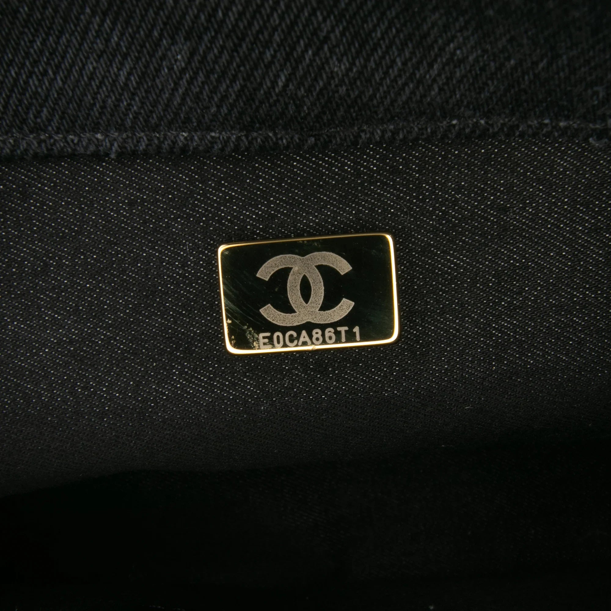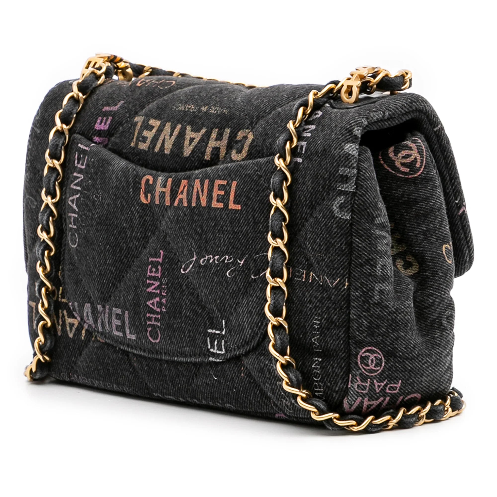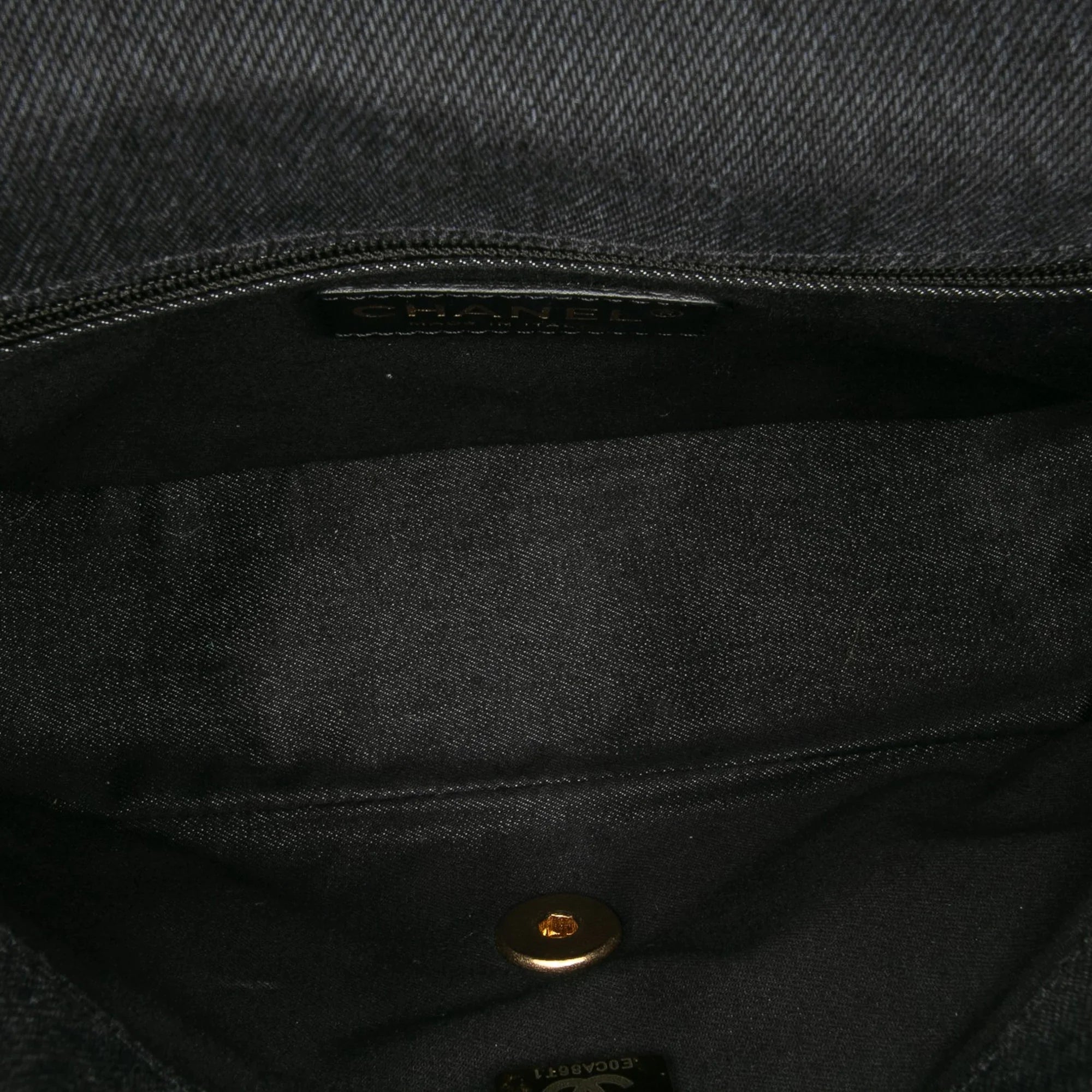 Product Details: Gray Chanel Mini Rectangular Quilted Denim Mood Flap Crossbody Bag. This crossbody bag features a quilted denim body, denim woven chain strap with denim shoulder guard, a front flap with twist lock closure, an exterior back slip pocket, and an interior zip pocket. 5.9" L x 8.1" W x 2.8" D. Serial number E0CA86T1.