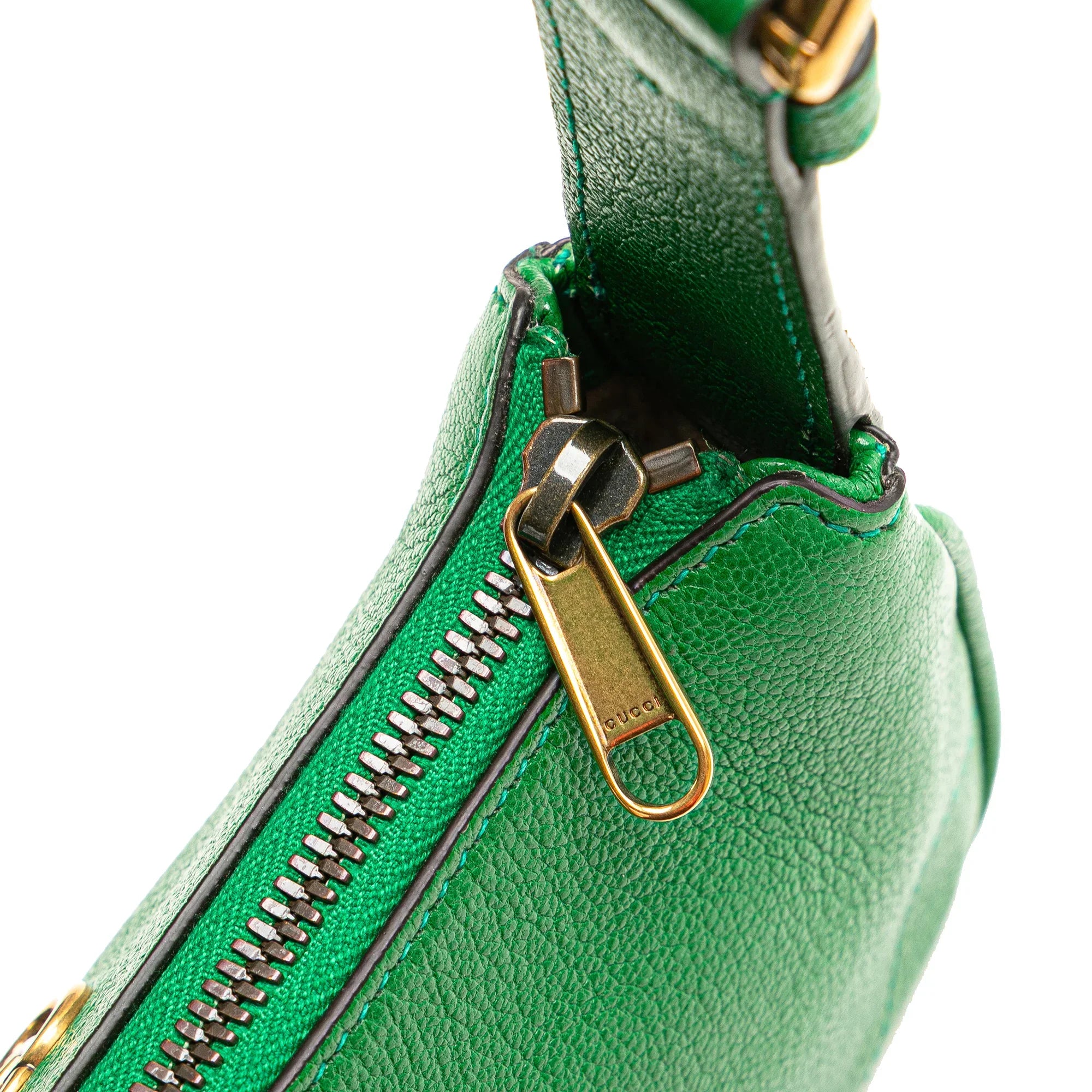 Product Details: Green Gucci Mini Leather Aphrodite Shoulder Bag. The Aphrodite bag features a leather body, a flat leather strap, and a top zip closure. 4.3" L x 8.3" W x 1.4" D. Serial number 739076 498879.
