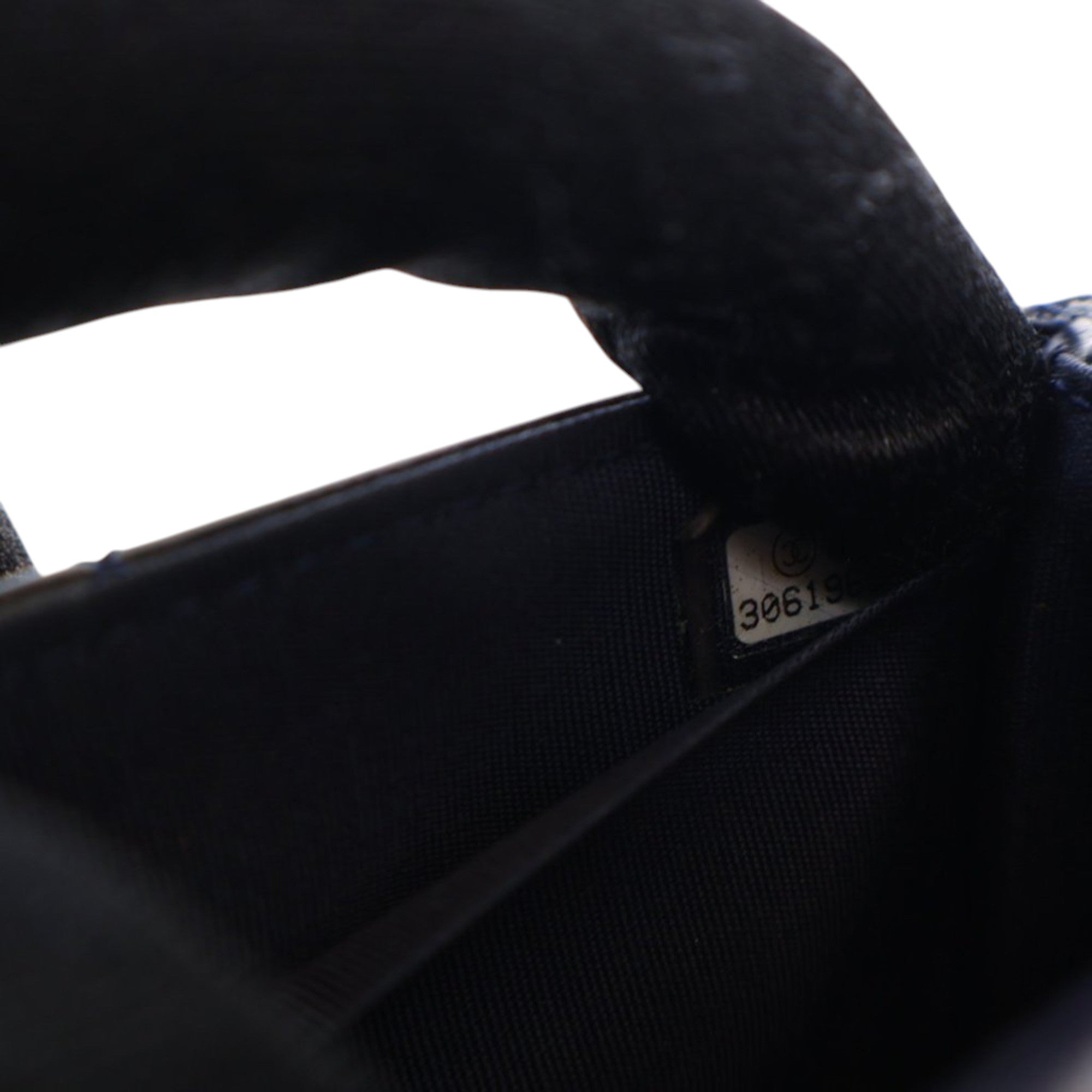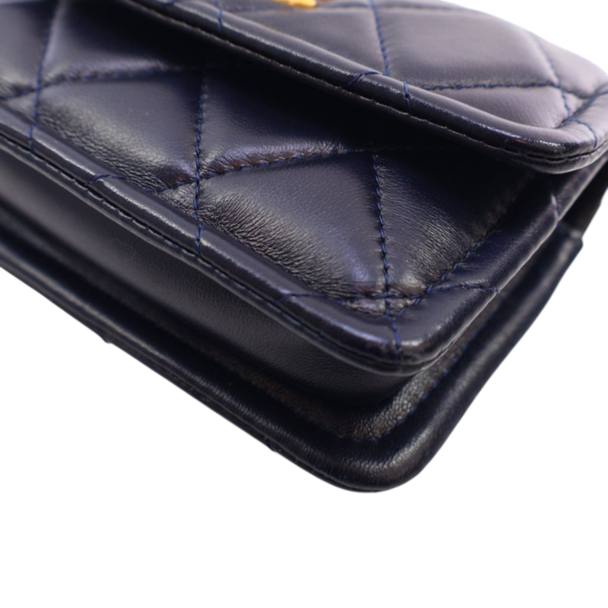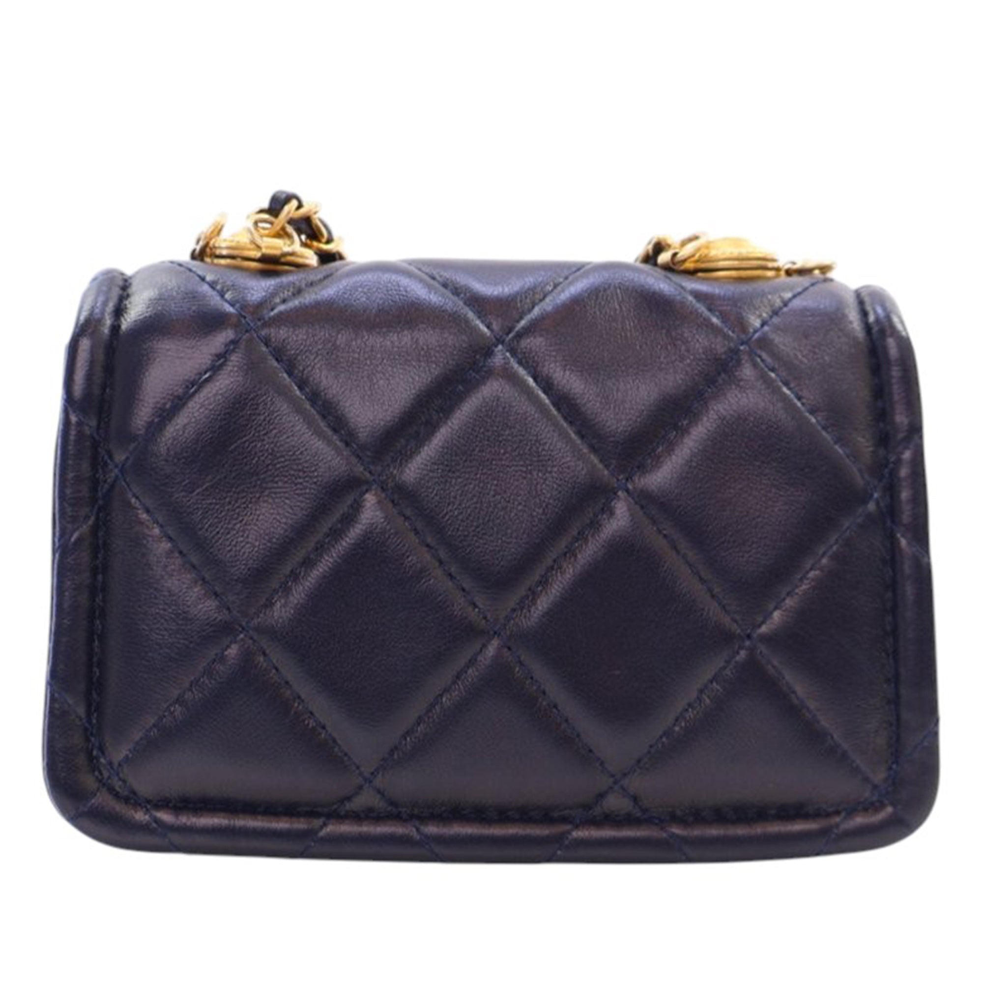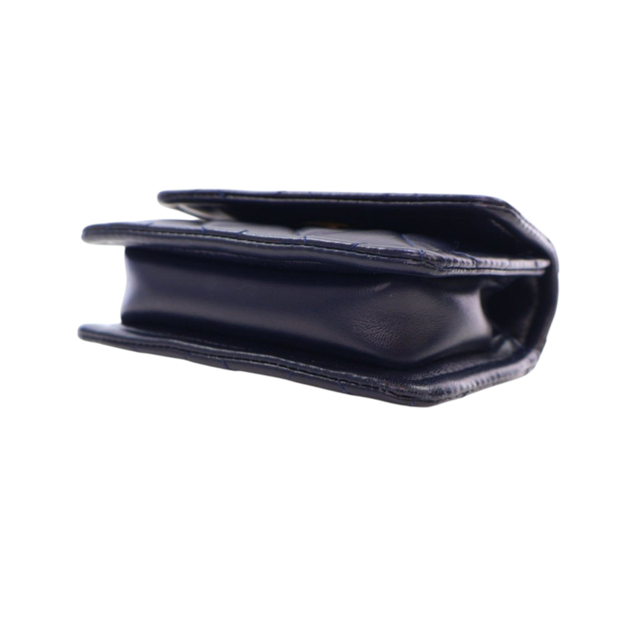 Product Details: Navy Chanel Mini Quilted Shiny Lambskin Button On Top Flap Satchel. This flap bag features a quilted lambskin body, a leather-woven chain handle, a leather-woven chain strap, a front flap with CC turn lock closure, and interior slip pockets. 3.5" L x 4.9" W x 1.6" D, 3.9" drop.
