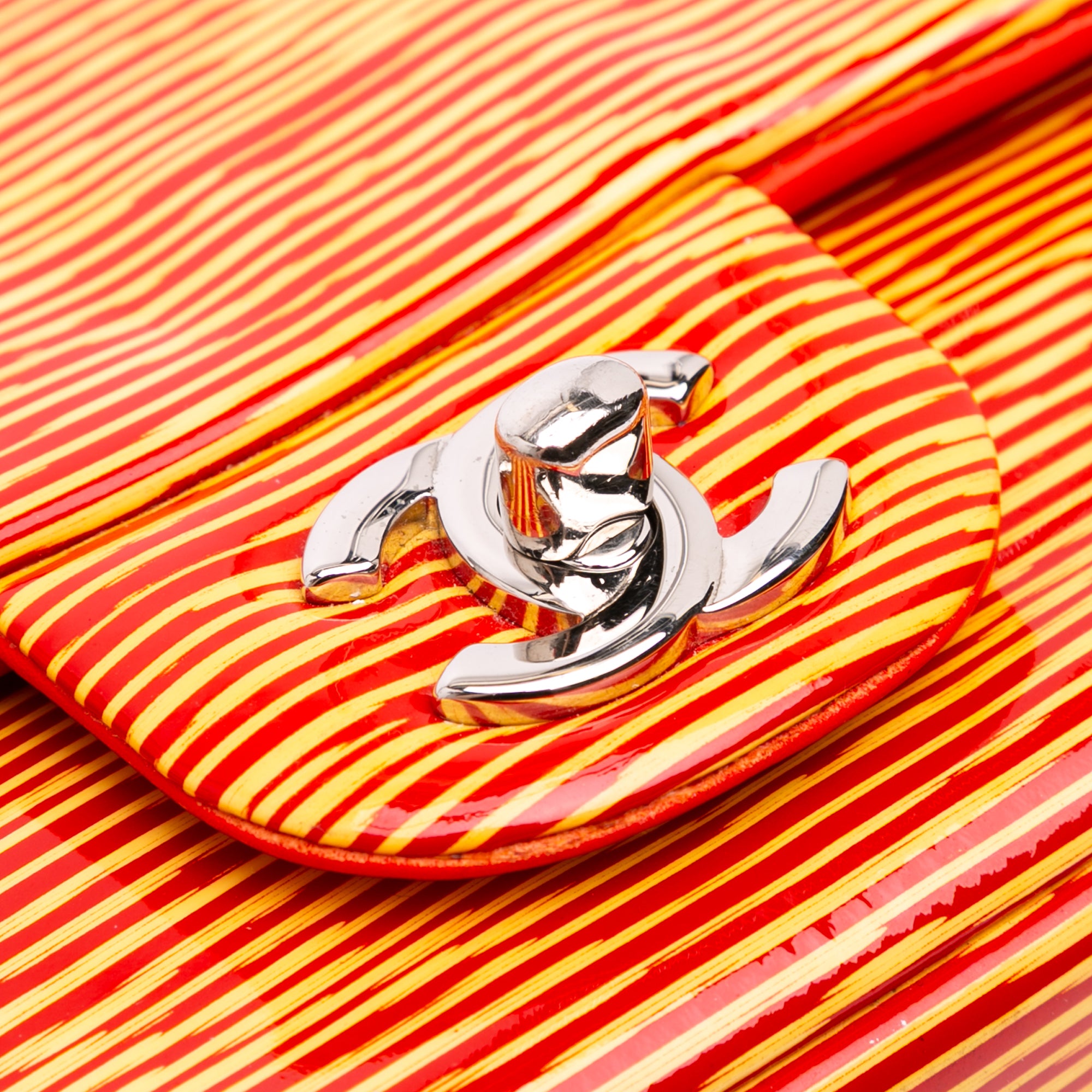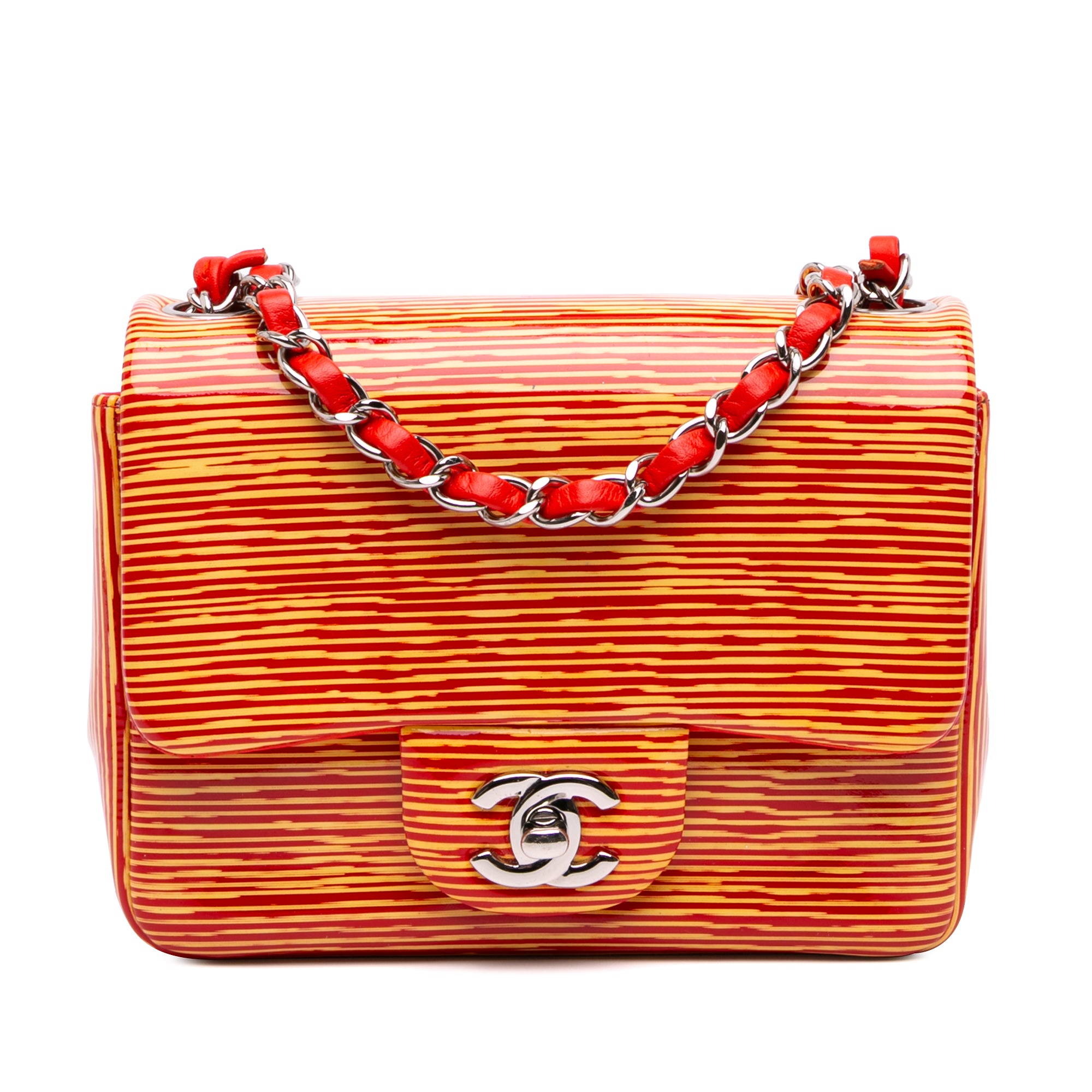 Please note this is a pre-owned item that may display signs of wear consistent with the condition listed above and shown in photos. Designer Revival guarantees this is an authentic Orange Chanel Mini Square Classic Patent Striped Single Flap Crossbody Bag or 100% of your money back. Learn more about our authentication process.