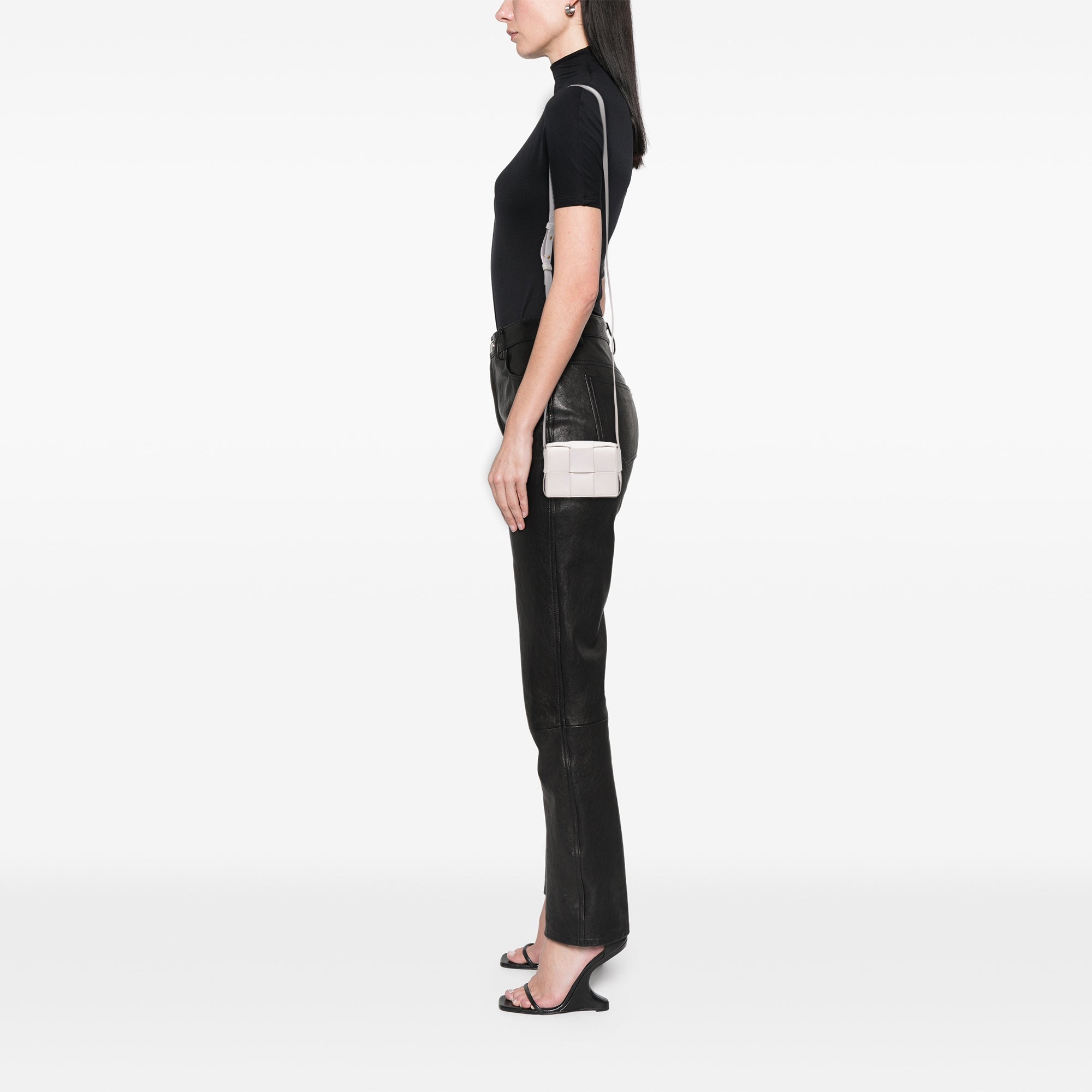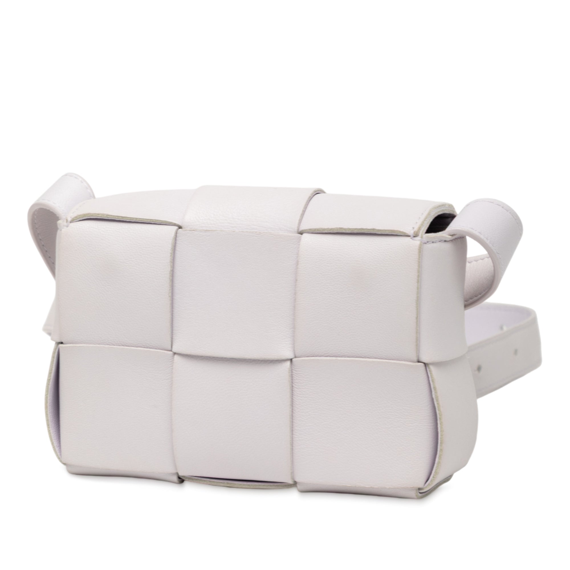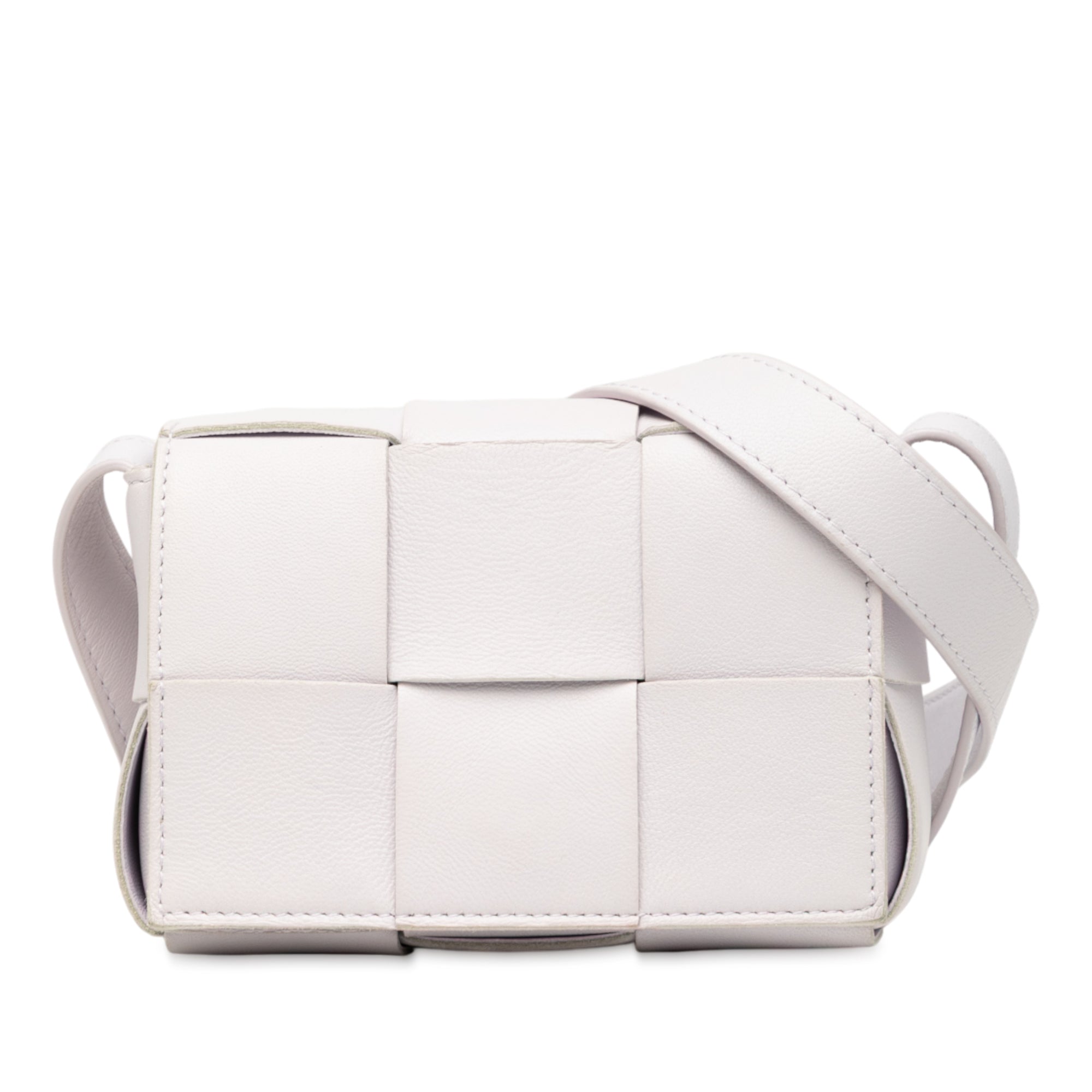Product Details: White Bottega Veneta Extra Mini Nappa Maxi Intrecciato Cassette Crossbody. This crossbody features a woven nappa leather body, a flat leather strap, a front flap with magnetic snap button closure, and an interior slip pocket. 3.3" L x 4.7" W x 1.6" D.
