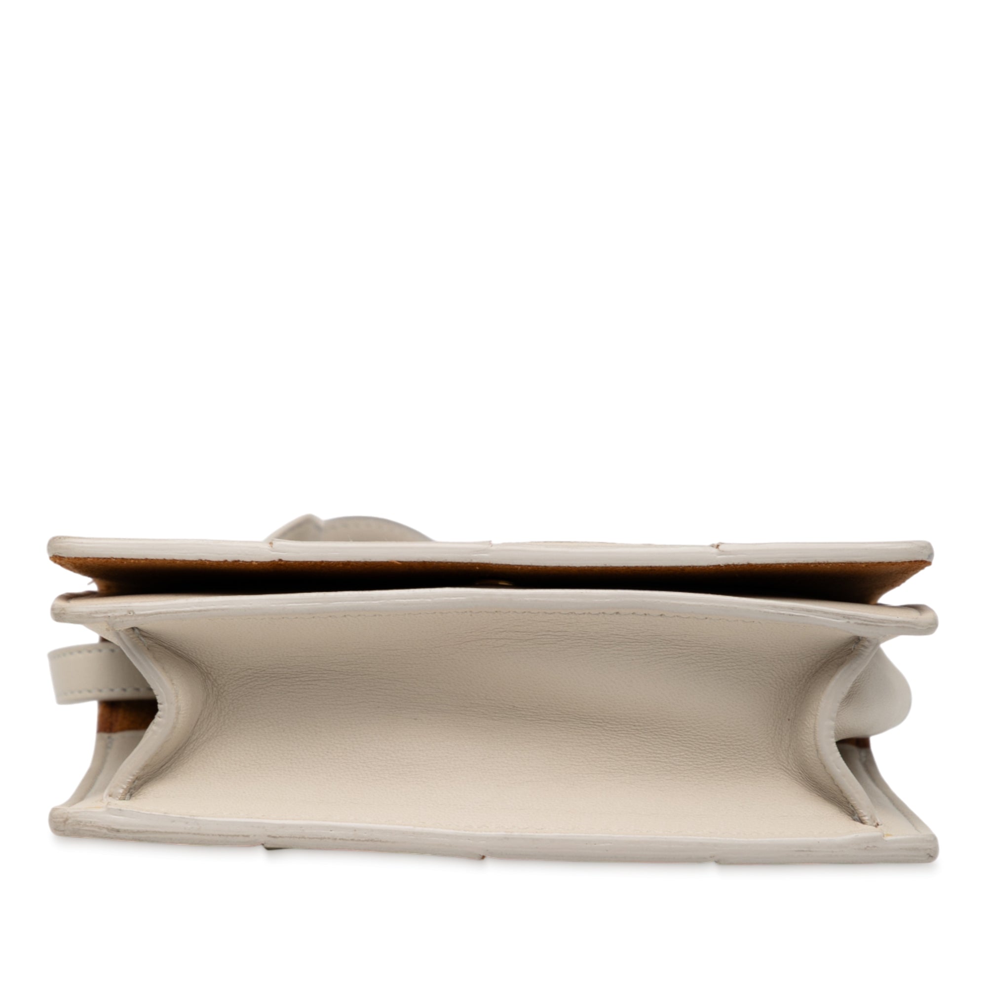 Product Details: White Bottega Veneta Mini Nappa Maxi Intrecciato Cassette Crossbody. The Cassette features a woven nappa leather body, a flat leather strap, a front flap with magnetic snap button closure, and interior slip pockets. 5.7" L x 6.3" W x 1.2" D.