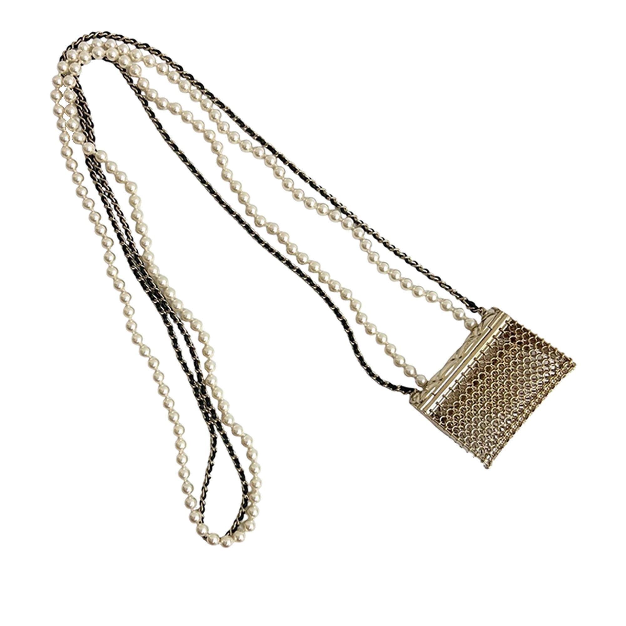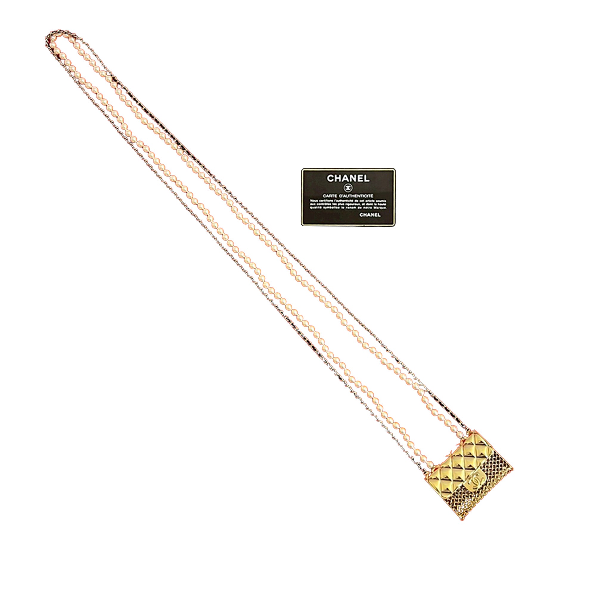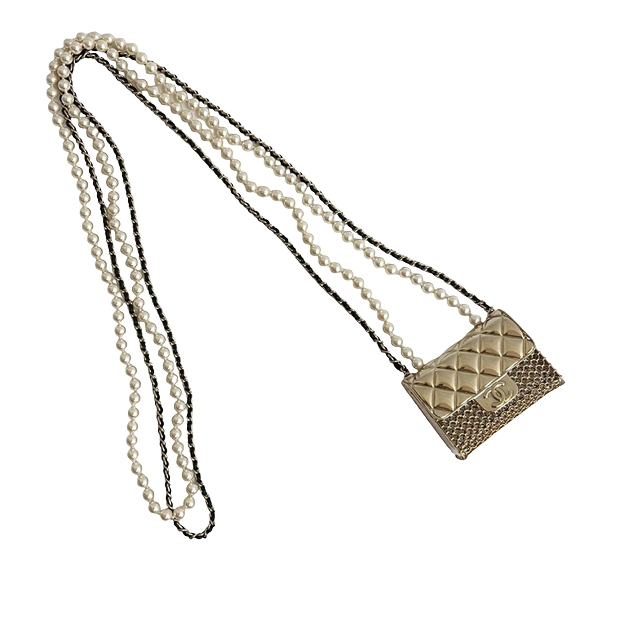 Gold Chanel CC Gold Plated Leather and Faux Pearl Classic Flap Bag Necklace