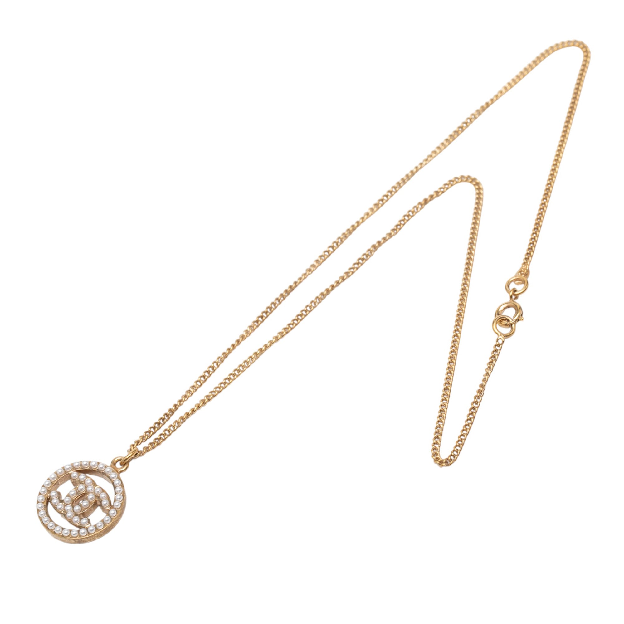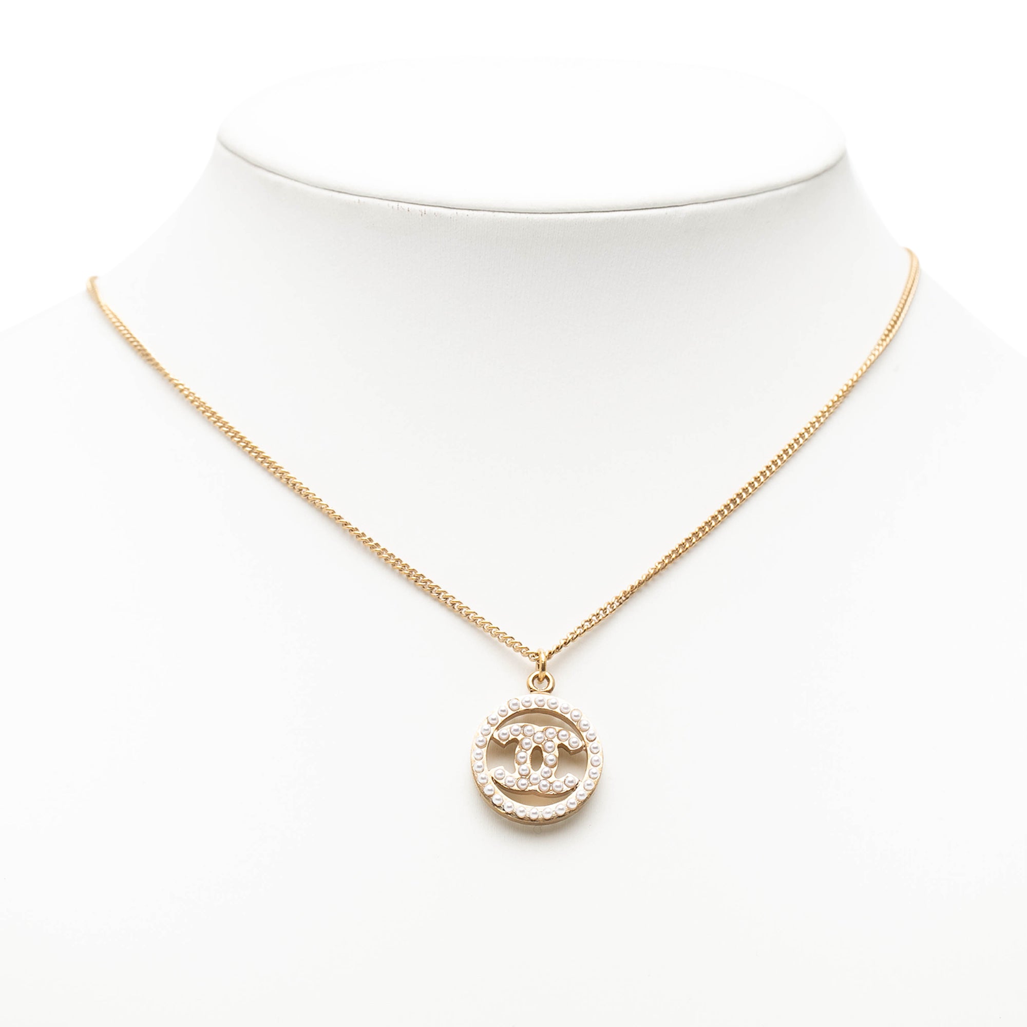 Product Details: Gold Chanel Gold Plated CC Faux Pearl Pendant Necklace. This necklace features a gold plated body, faux pearl embellishments, and a spring ring closure. 16.3" L x 0.9" W x 0" D. Serial number 04A.