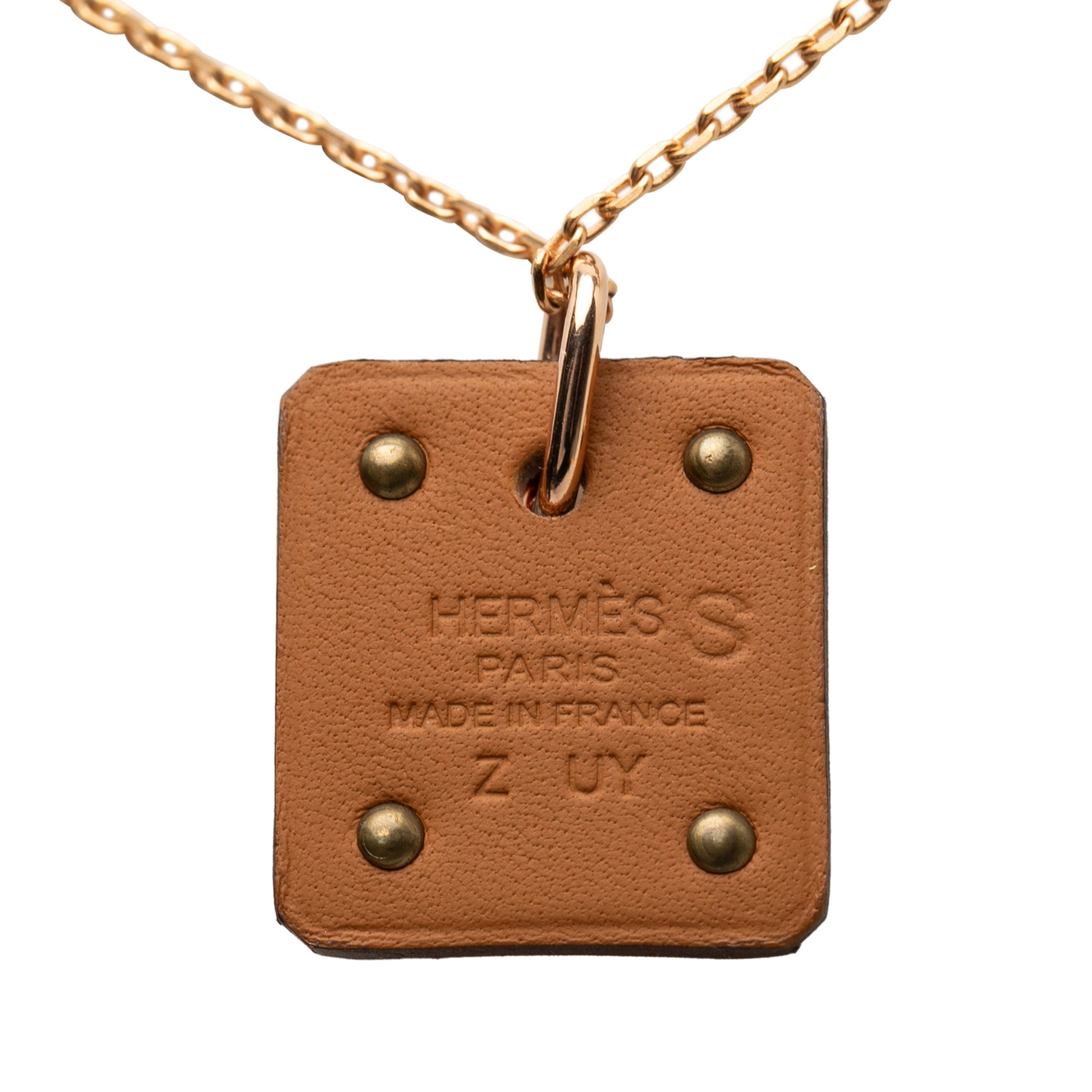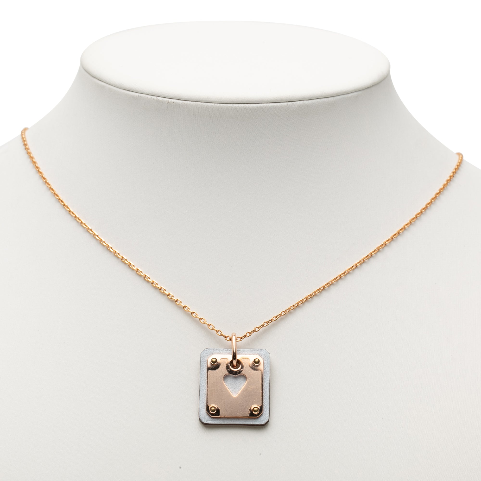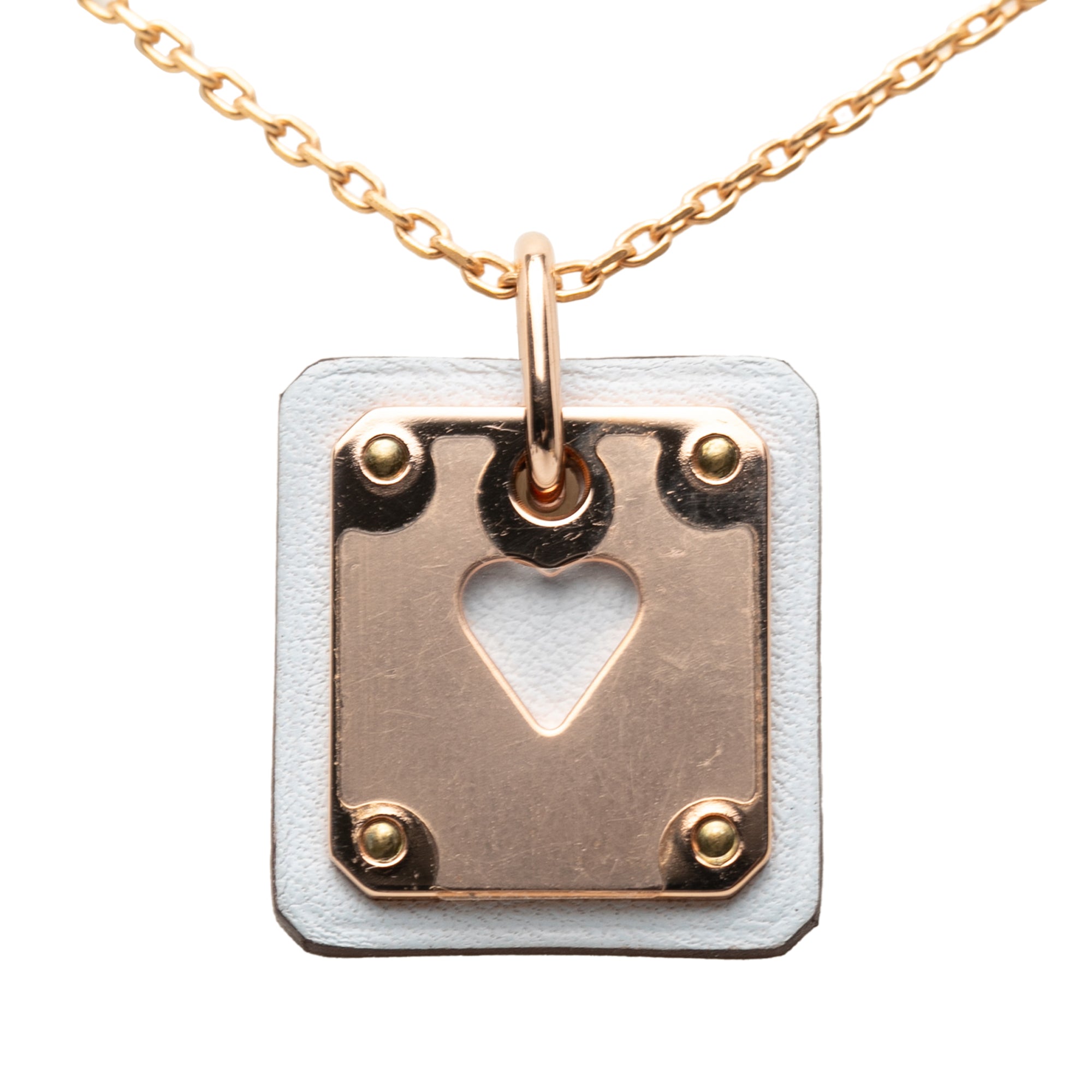 Product Details: Pink Hermès Small Gold Plated and Swift As de Coeur Pendant Necklace. This necklace features a gold-plated chain, a plaque and swift leather pendant, and a lobster claw closure. 19.7" L x 0.8" W x 0" D. Serial number Z.