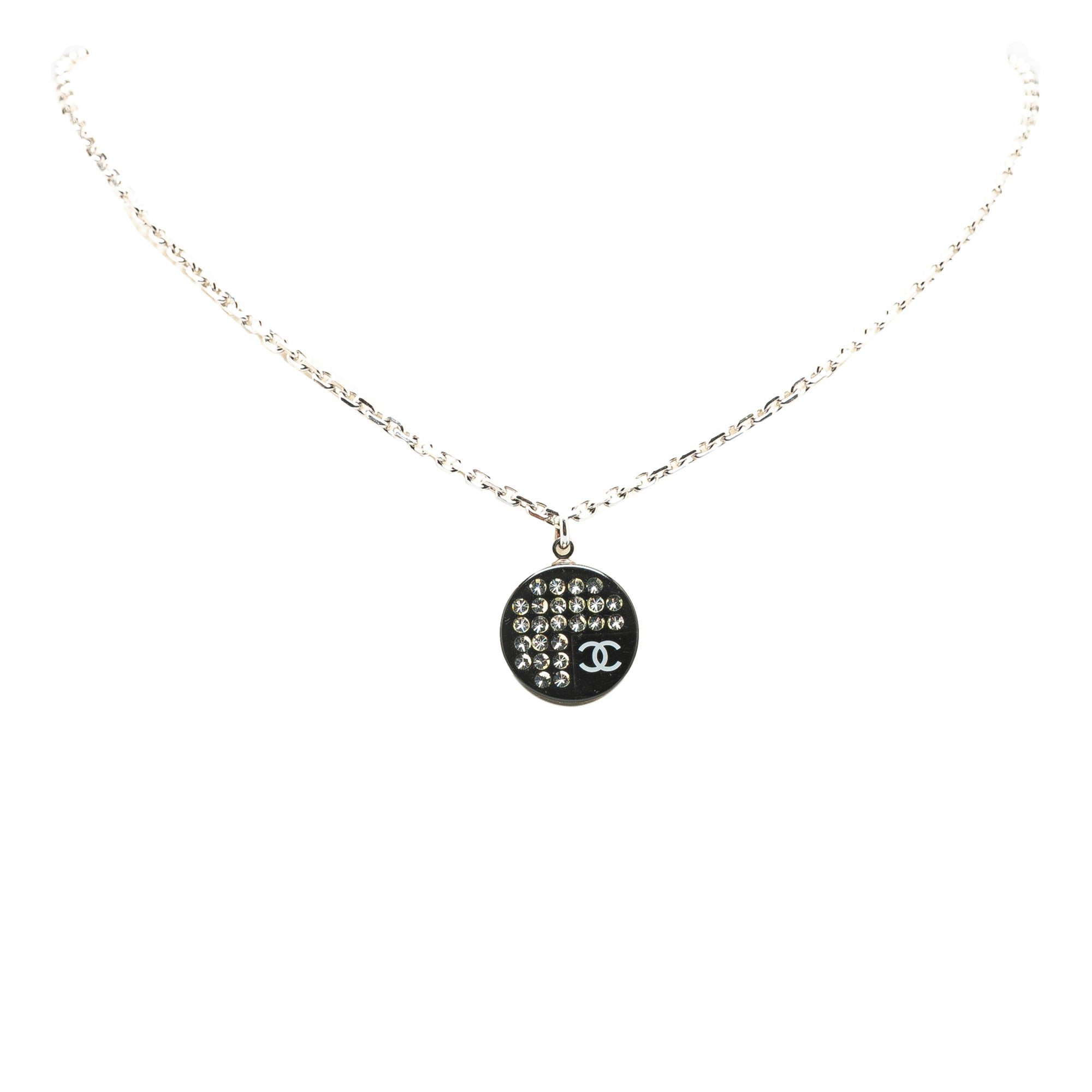 Product Details: Silver Chanel Silver Plated CC Resin and Rhinestone Pendant Necklace. This necklace features a silver-tone chain, a round resin pendant with CC logo and rhinestone embellishment, and a lobster claw clasp closure. 18.5" L x 0.8" W x 0" D. Serial number 05P.