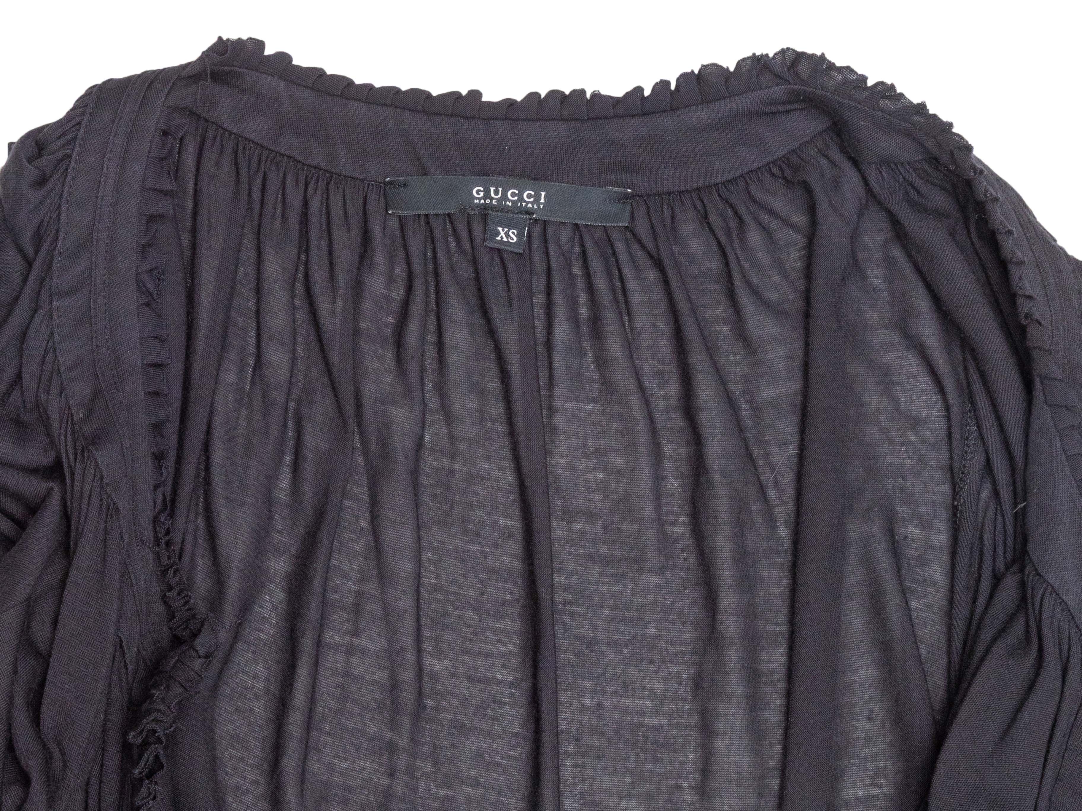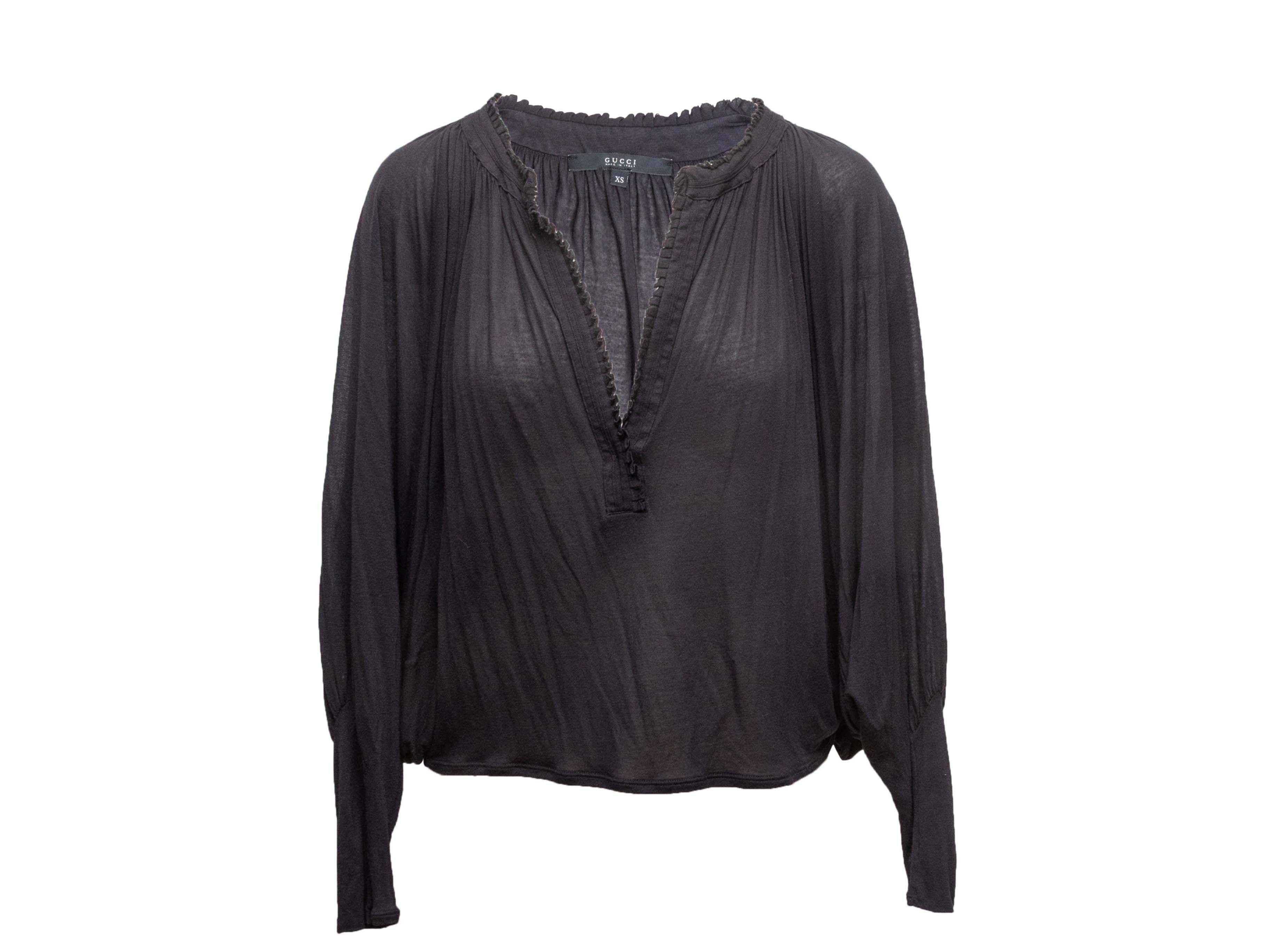 Product Details: Black V-neck blouses by Gucci. Long mutton sleeves. 36" bust, 16.5" shoulder width, 22.75" length.