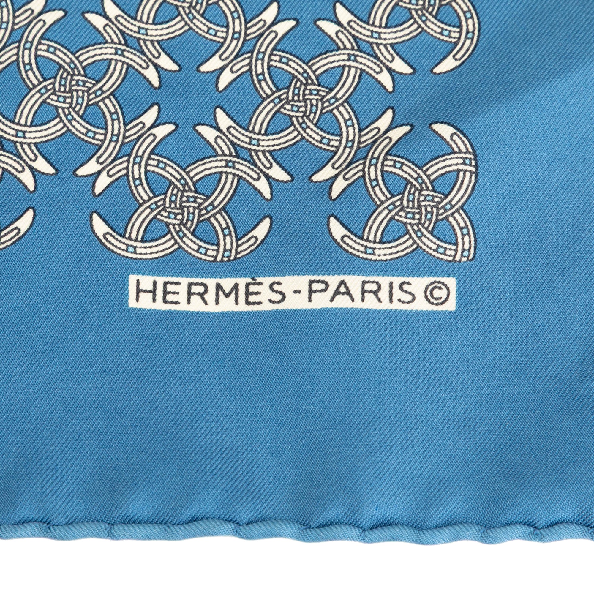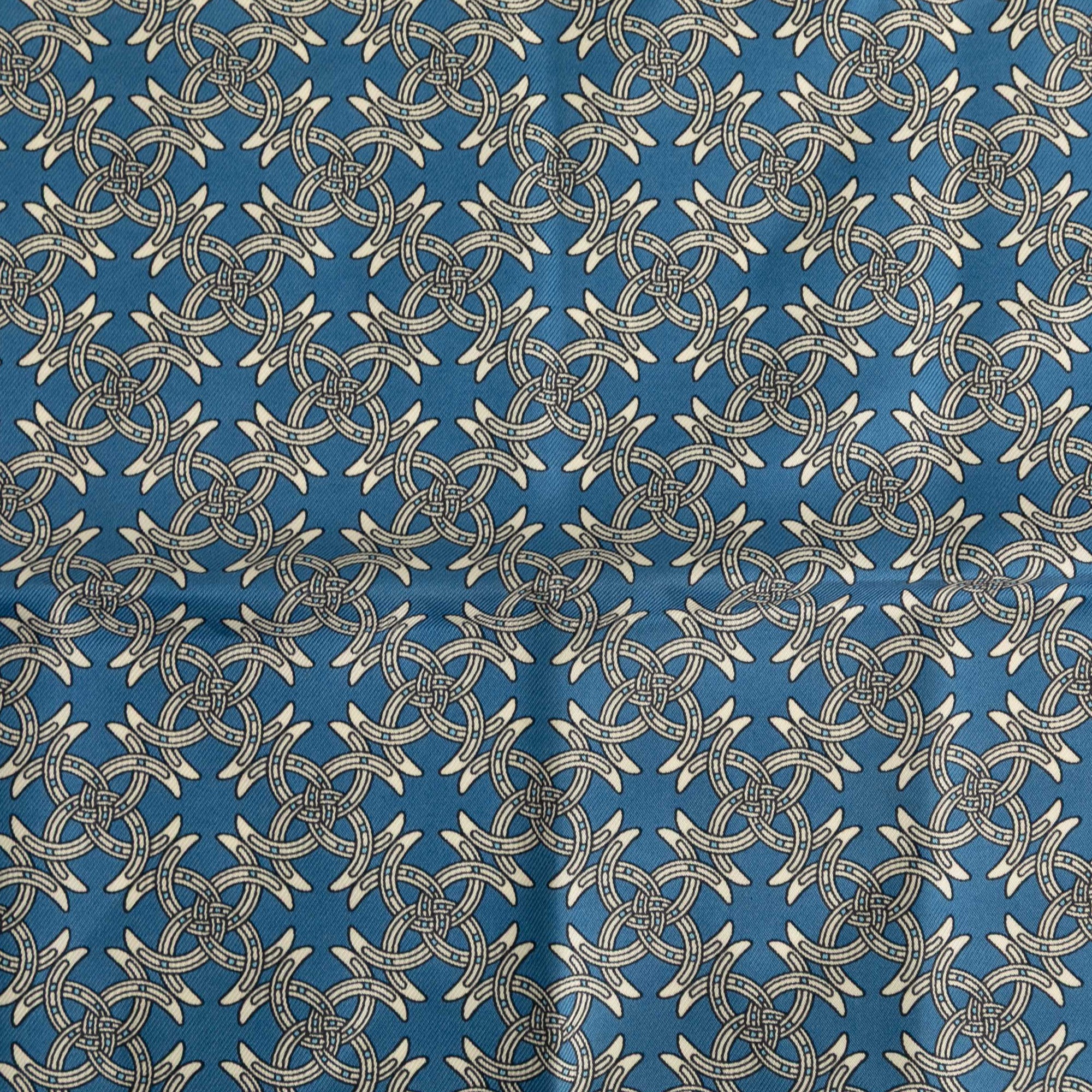 Product Details: Blue Hermès Printed Silk Handkerchief. This handkerchief features a 100% silk. 16.5" L x 16.5" W x 0" D.