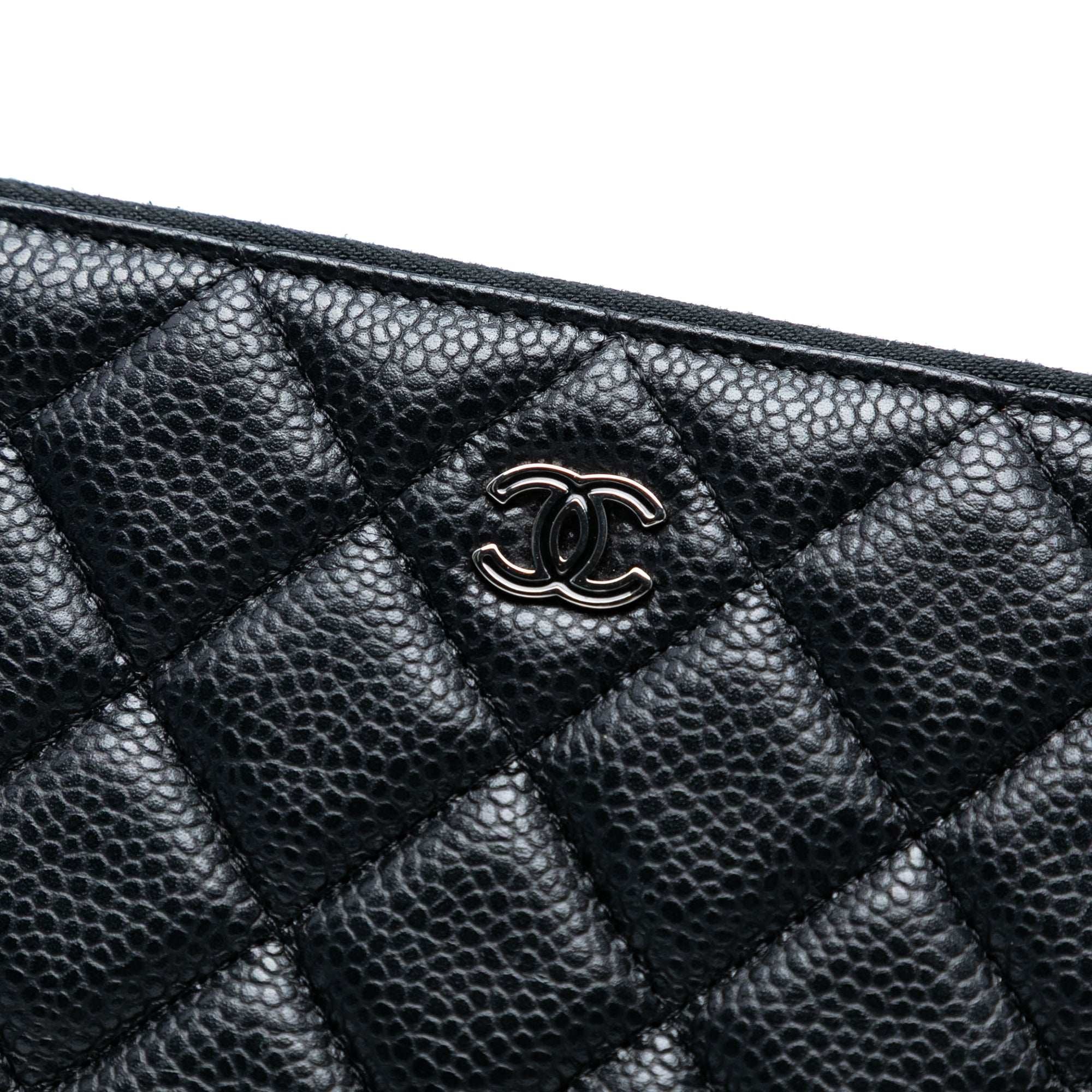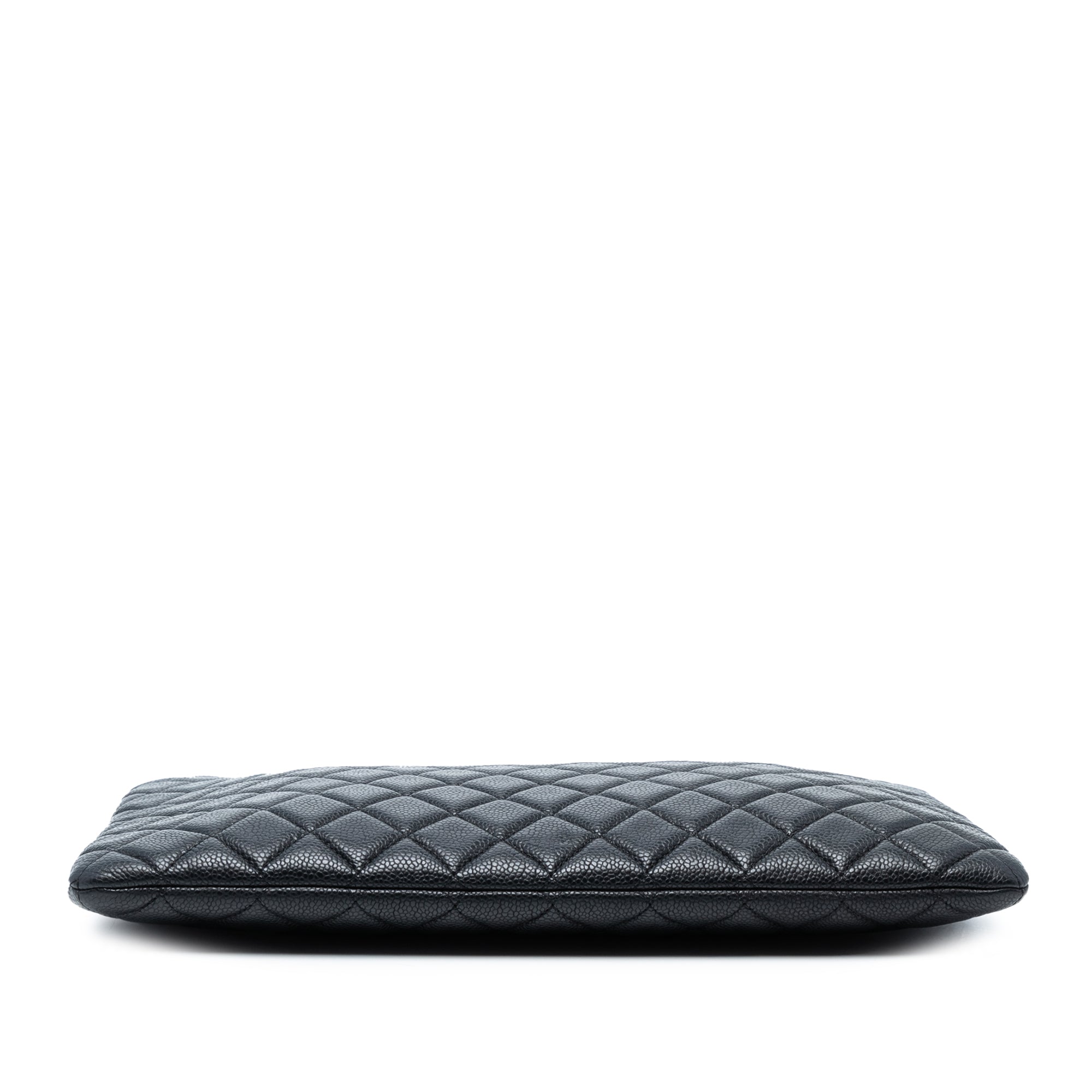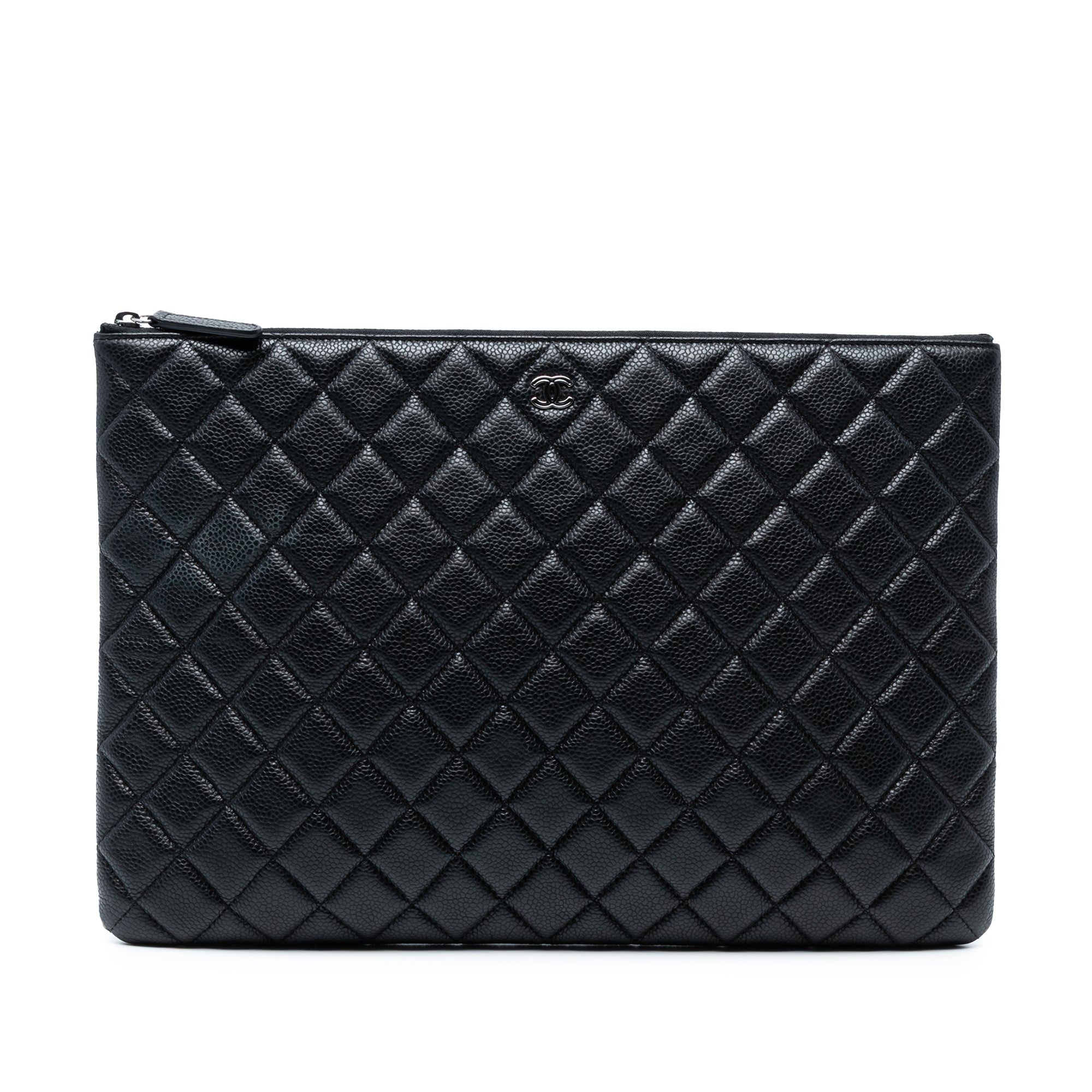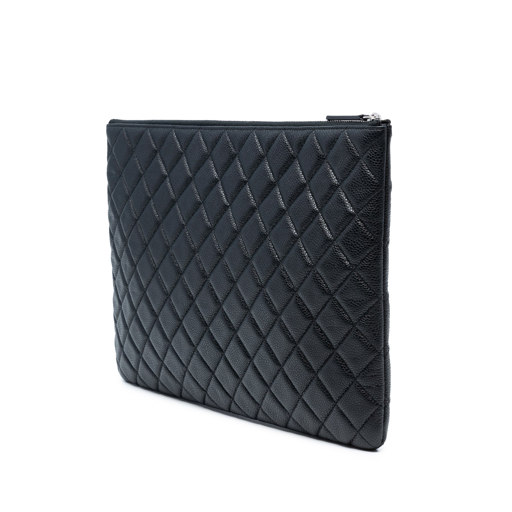 Product Details: Black Chanel Large Quilted Caviar O Case Clutch. This clutch bag features a quilted caviar leather body and a top zip closure. 9.4" L x 13.8" W x 0.8" D. Serial number 20903848.