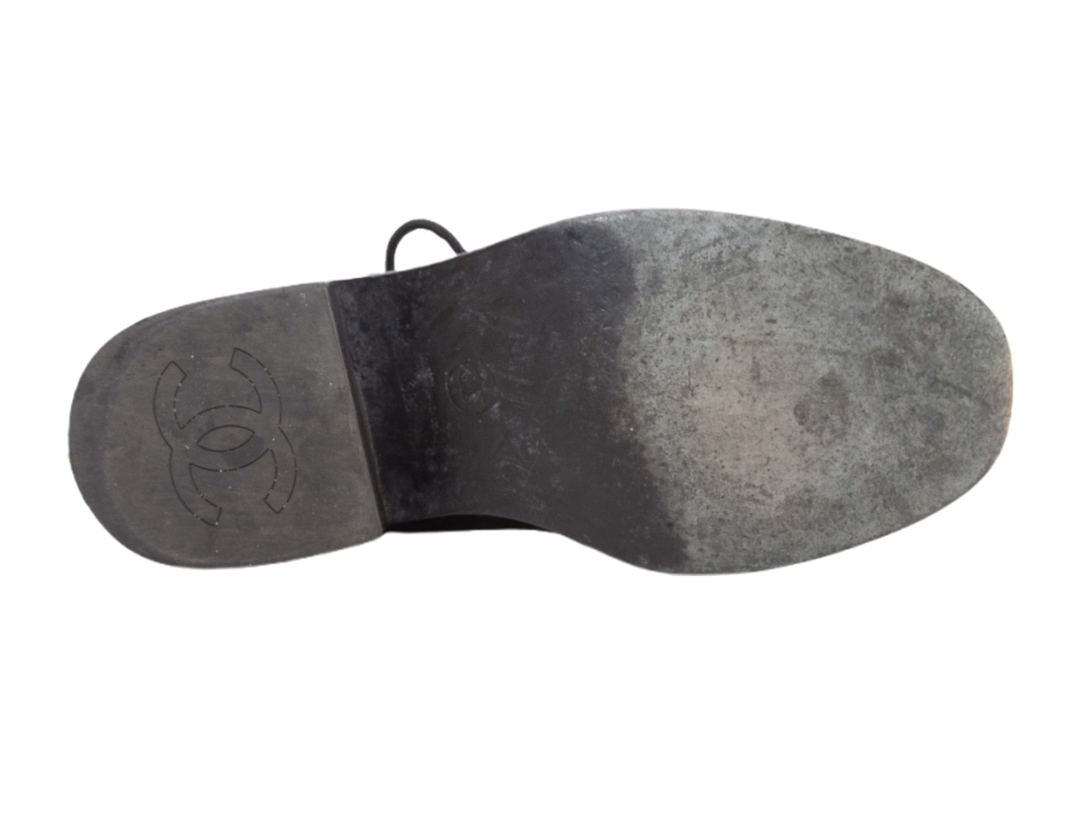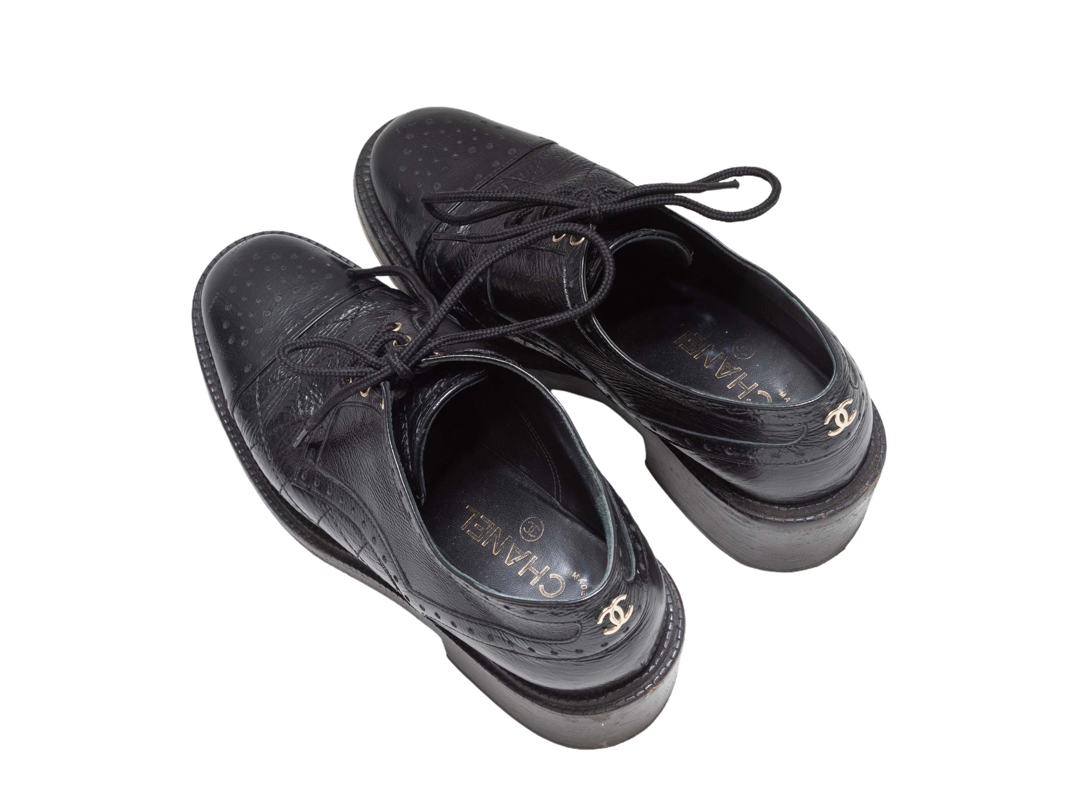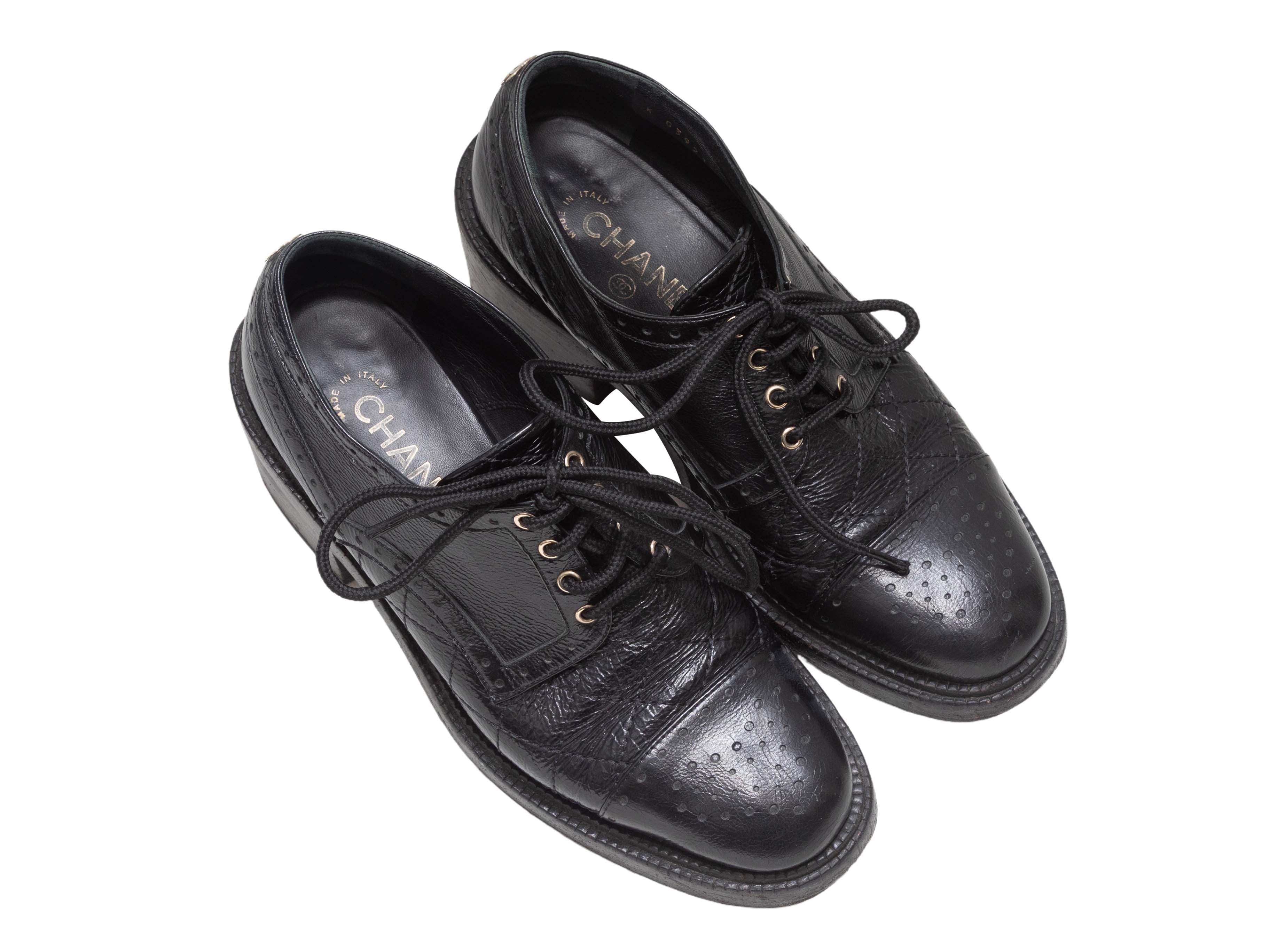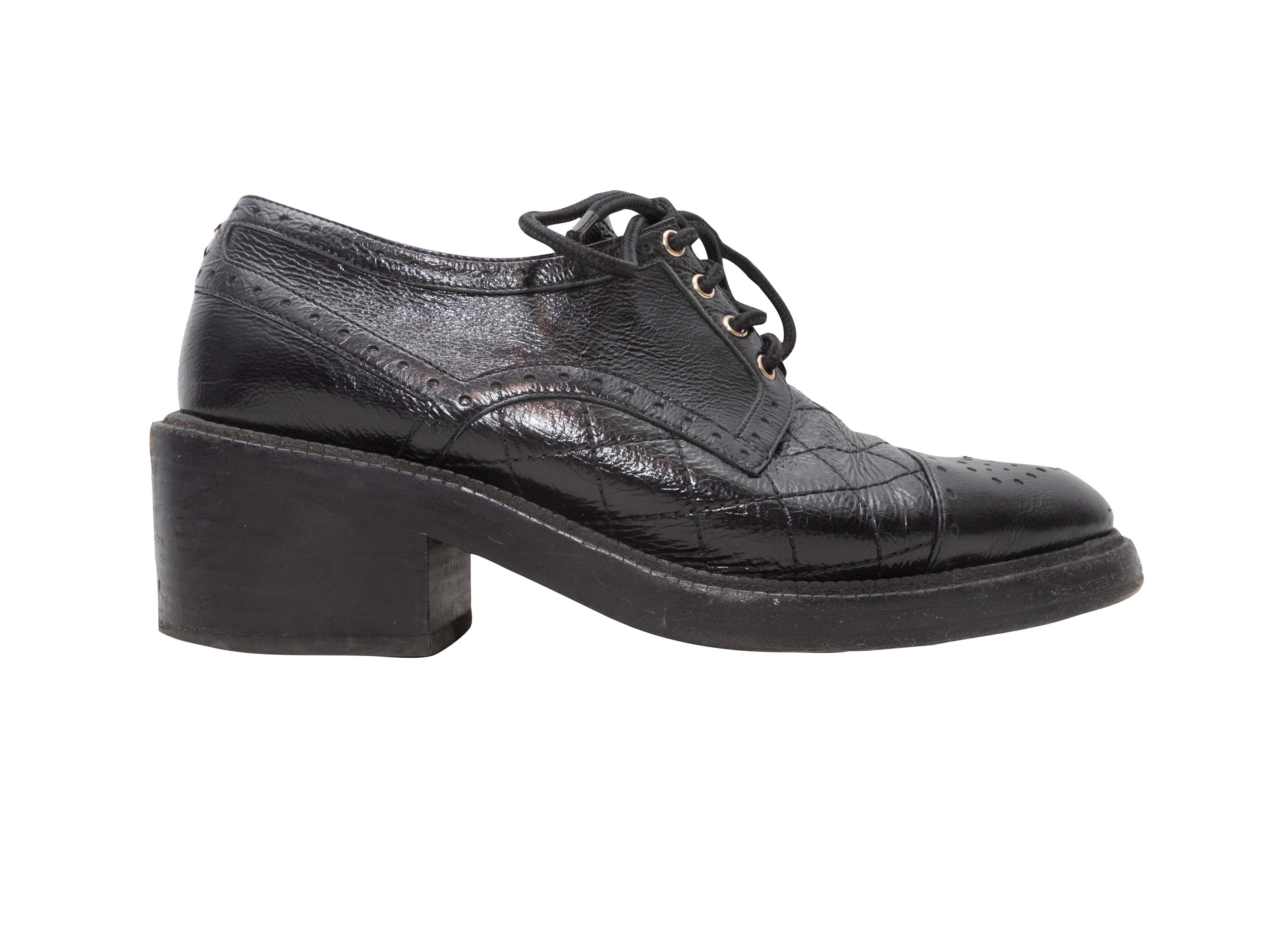 Product Details: Black patent quilted oxfords by Chanel. Stacked heels. Lace-up tie closures at tops. 2" heel height.