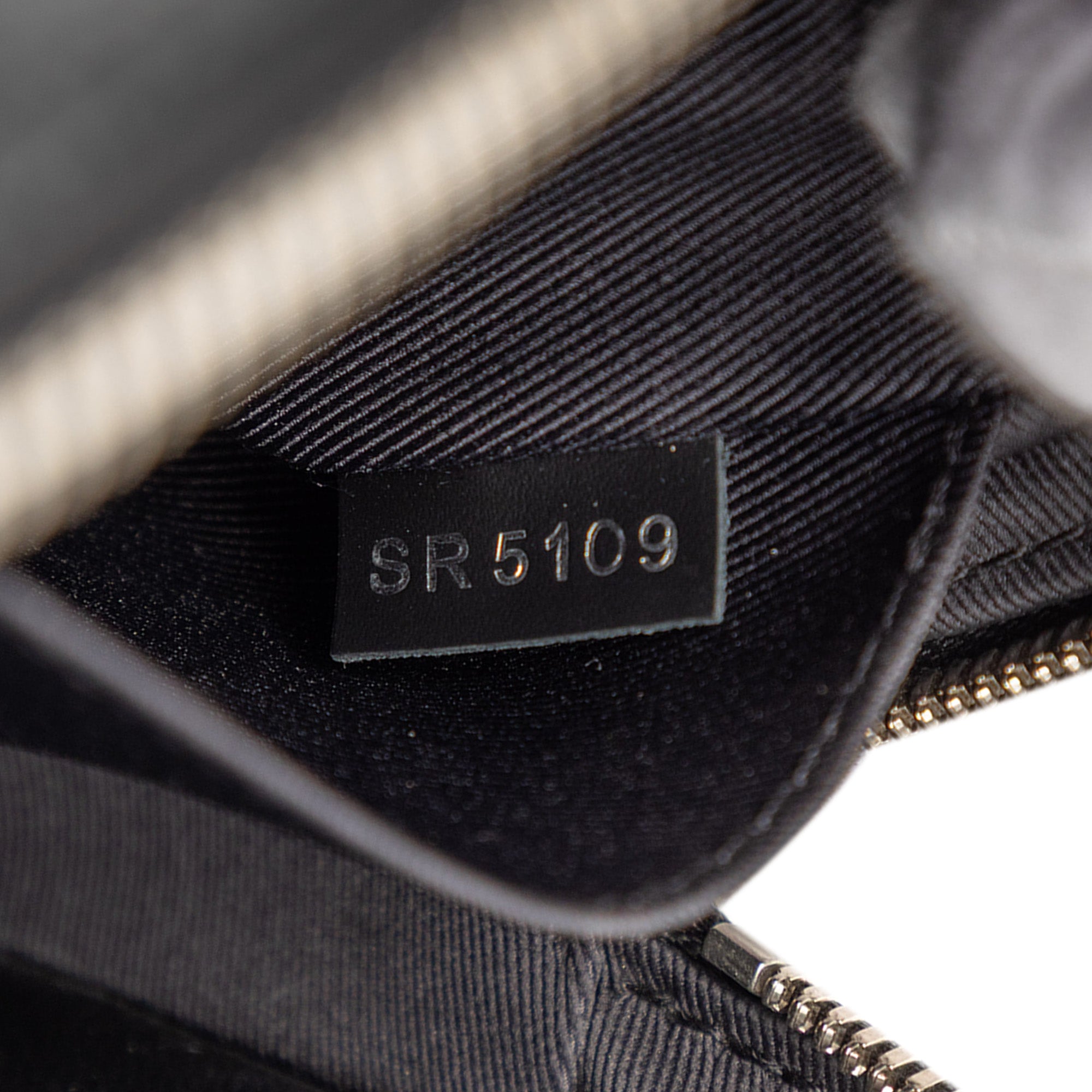 Product Details: Black Louis Vuitton Damier Graphite Kasai Clutch Bag. The Kasai features a damier graphite canvas body with leather trim, a flat leather wrist strap, a top zip closure, an exterior zip pocket, and interior slip pockets. 5.9" L x 9.4" W x 2" D, 8.3" drop. Serial number SR5109.