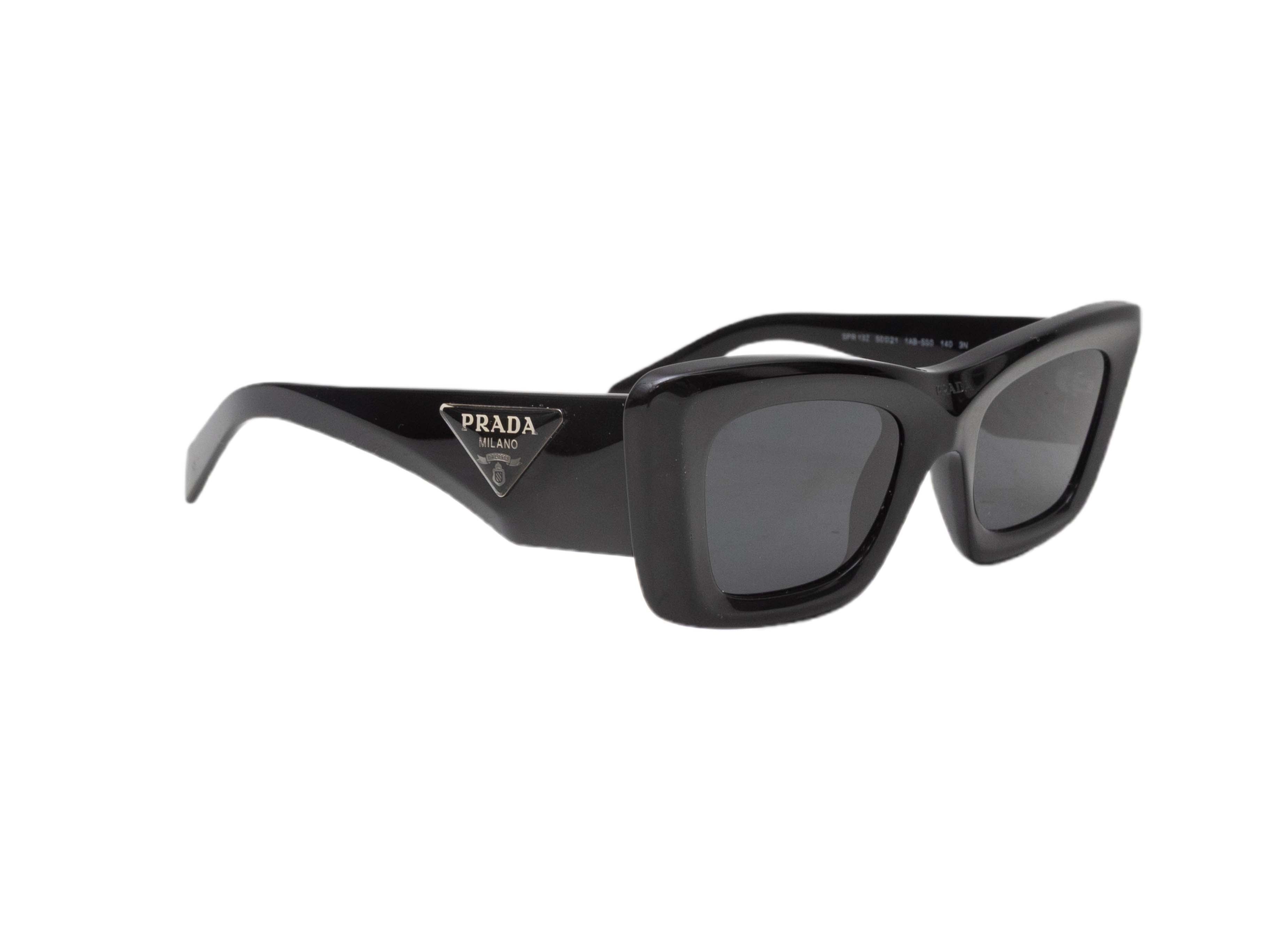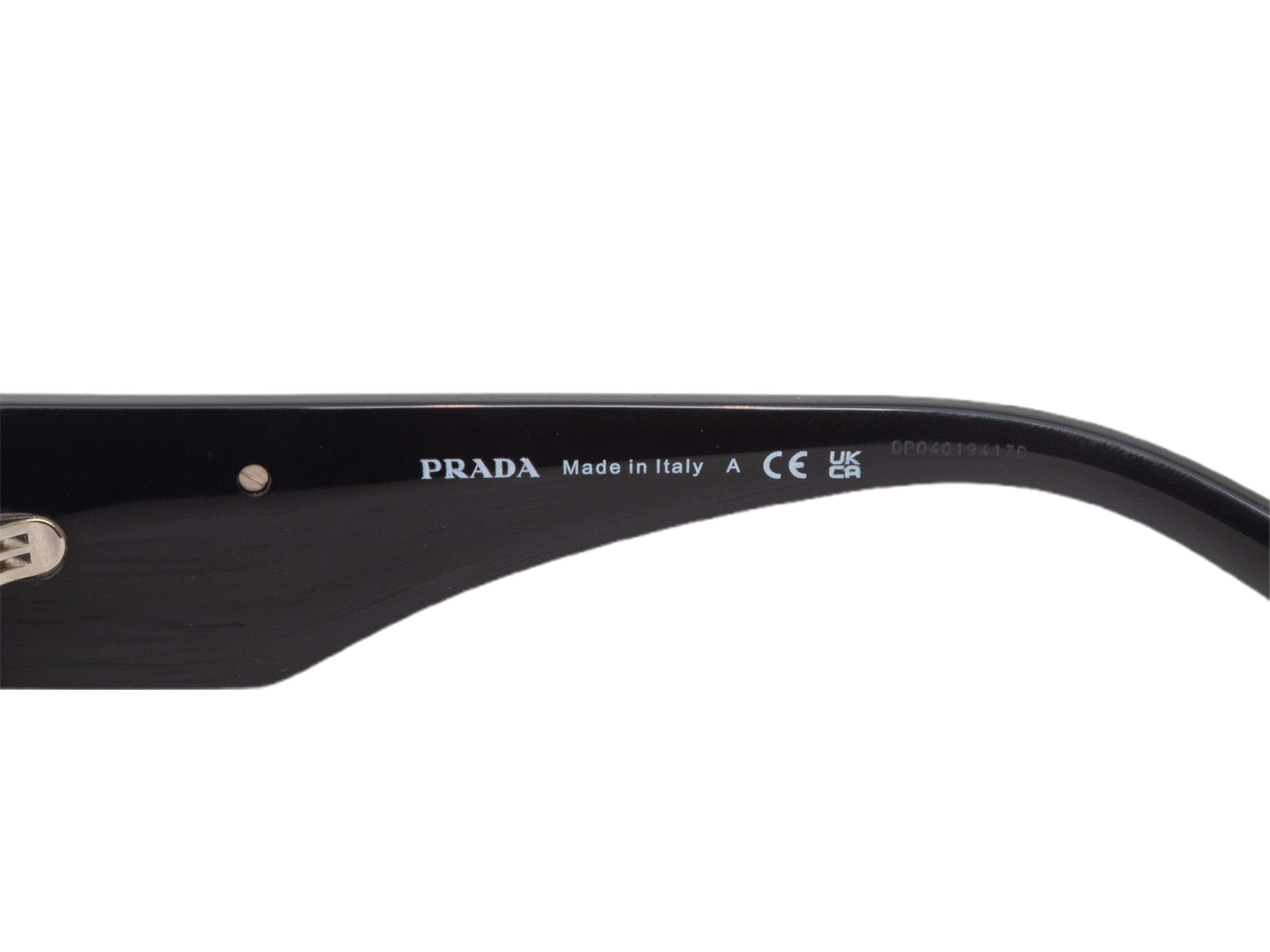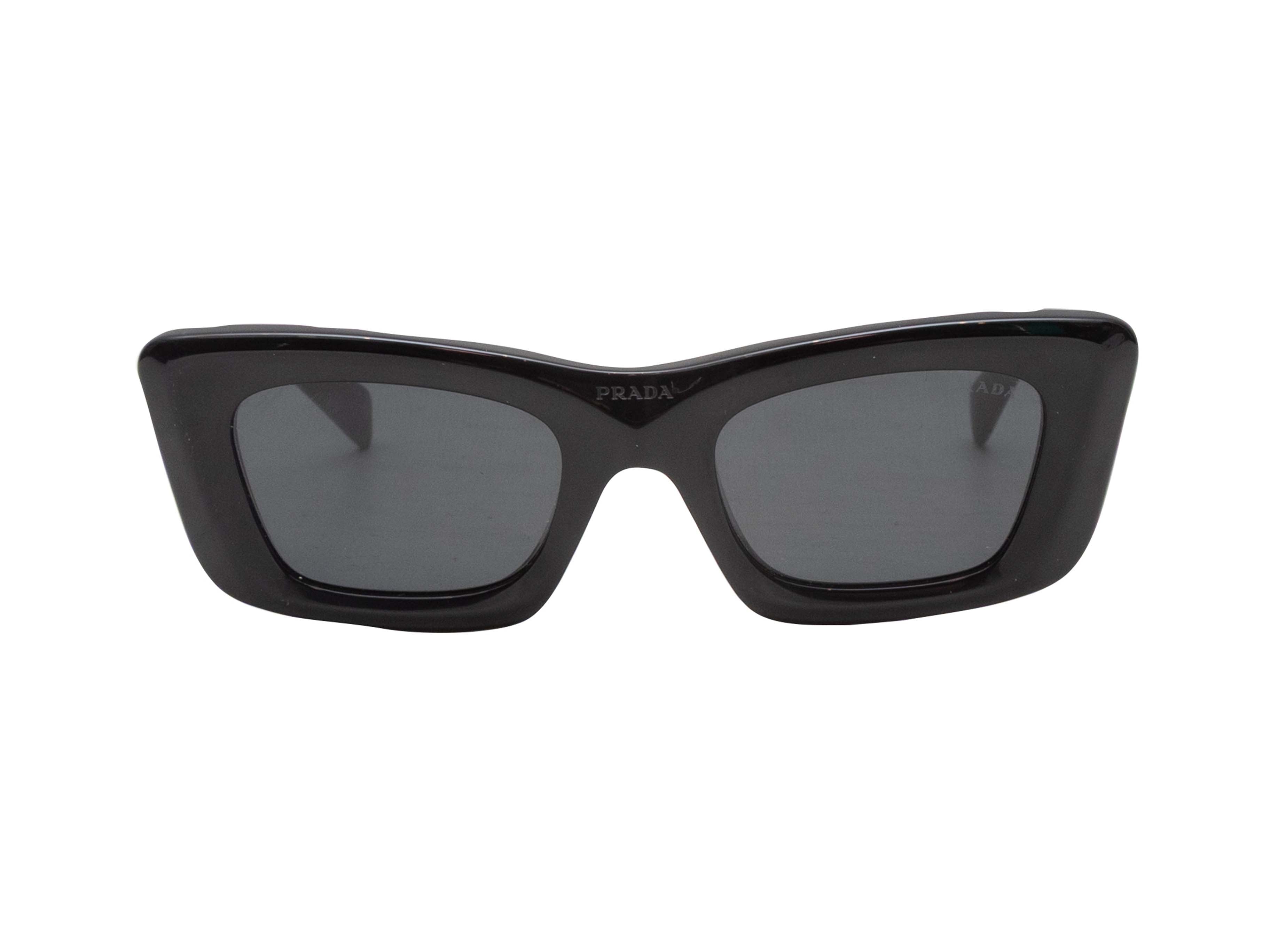 Product Details: Black acetate rectangular sunglasses by Prada. Grey tinted lenses. Logo adornments at arms. 1.75" height, 5.5" width, 5.5" length.