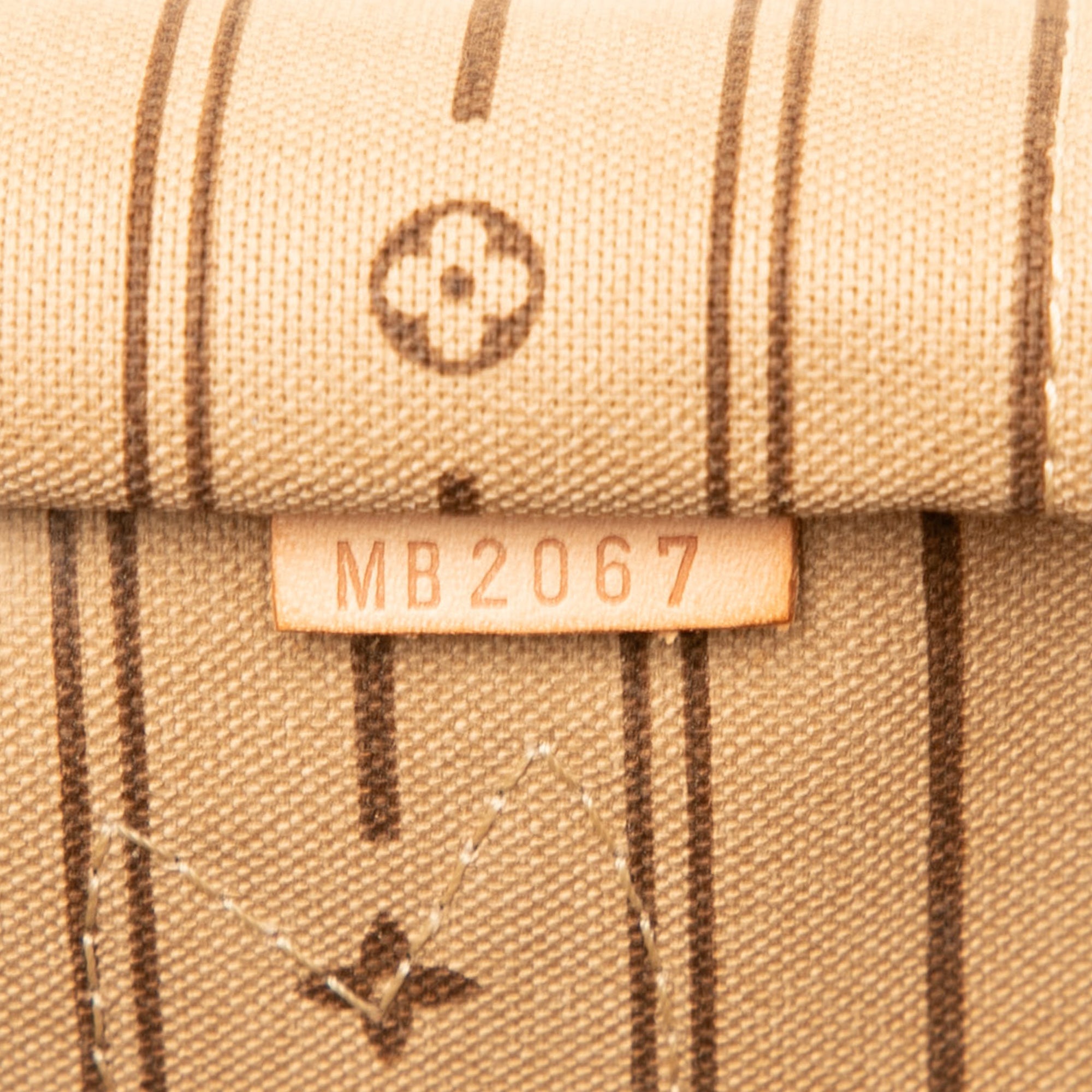 Product Details: Brown Louis Vuitton Monogram Neverfull PM Tote Bag. The Neverfull PM features a monogram canvas body with vachetta leather trim, flat vachetta leather handles, an open top with a lobster clasp closure, and an interior zip pocket. 8.7" L x 11.2" W x 5.1" D, 6.5" drop. Serial number MB2067.