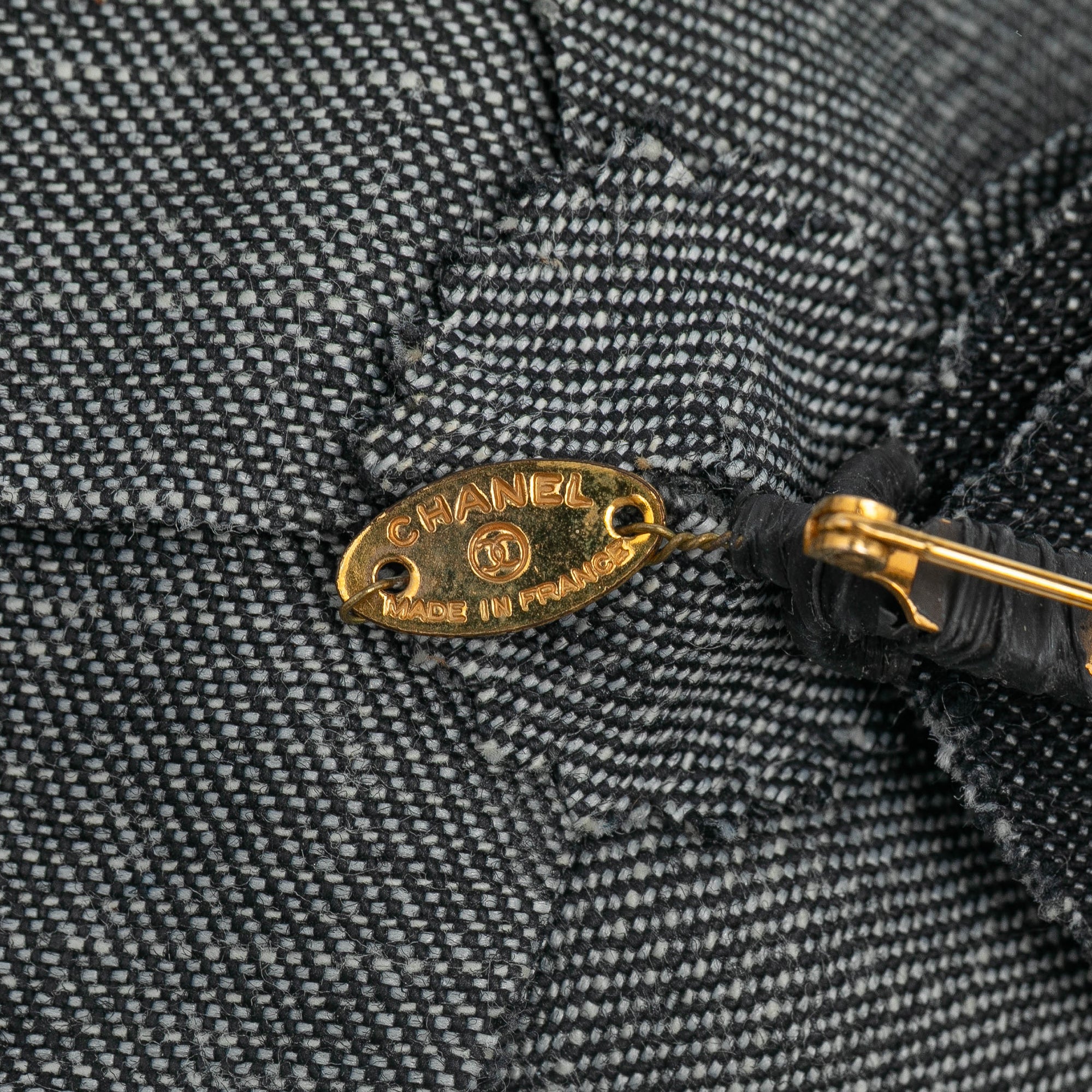 Product Details: Gray Chanel Denim Camellia Brooch. This brooch features a denim body and a back pin closure. 3.3" L x 4.1" W x 0" D.