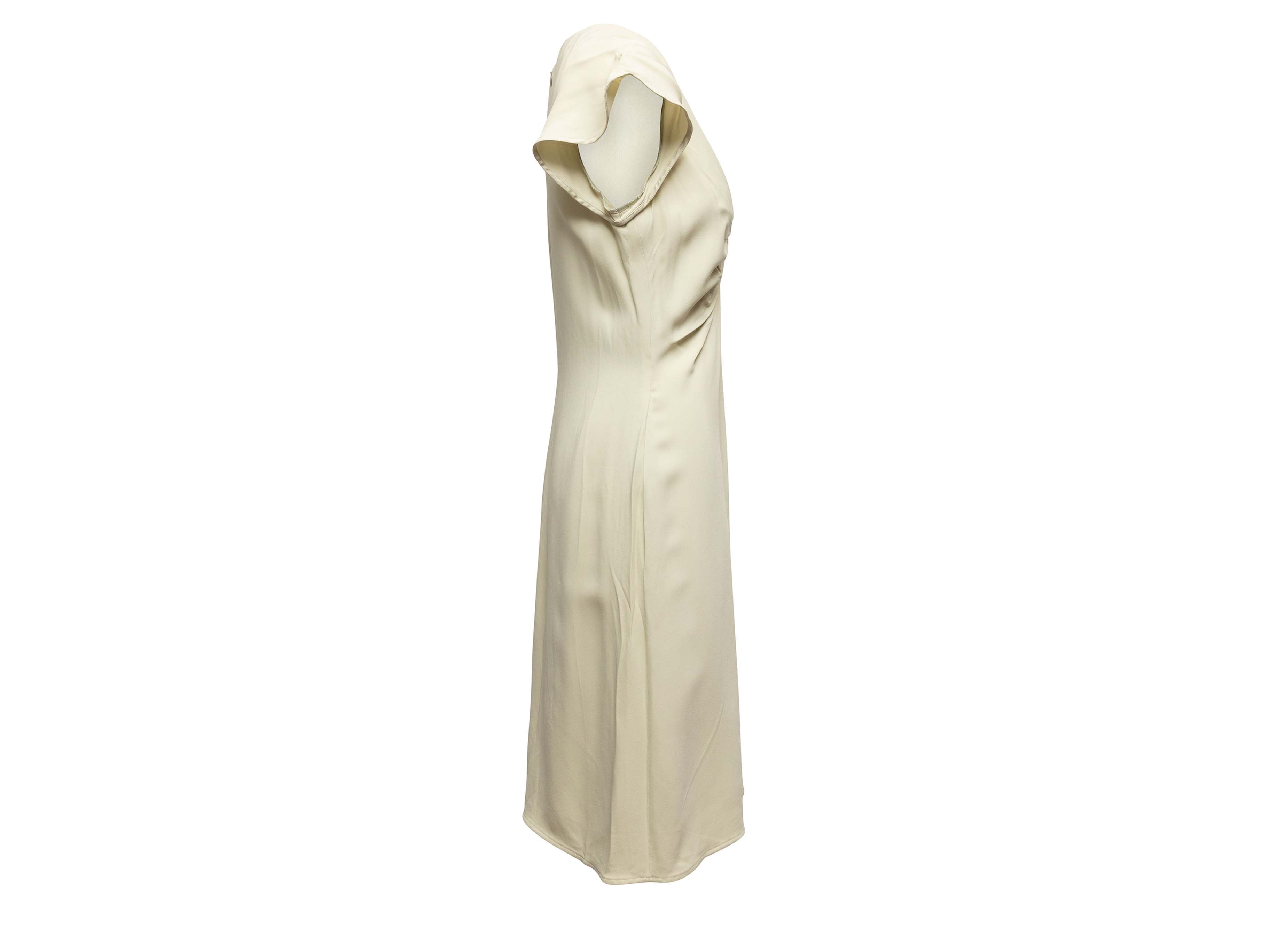 Product Details: Pale chartreuse short sleeve knee-length dress by Valentino. V-neck. Zip closure at back. 32" bust, 25" waist, 39.75" length, 11.5" shoulder width.