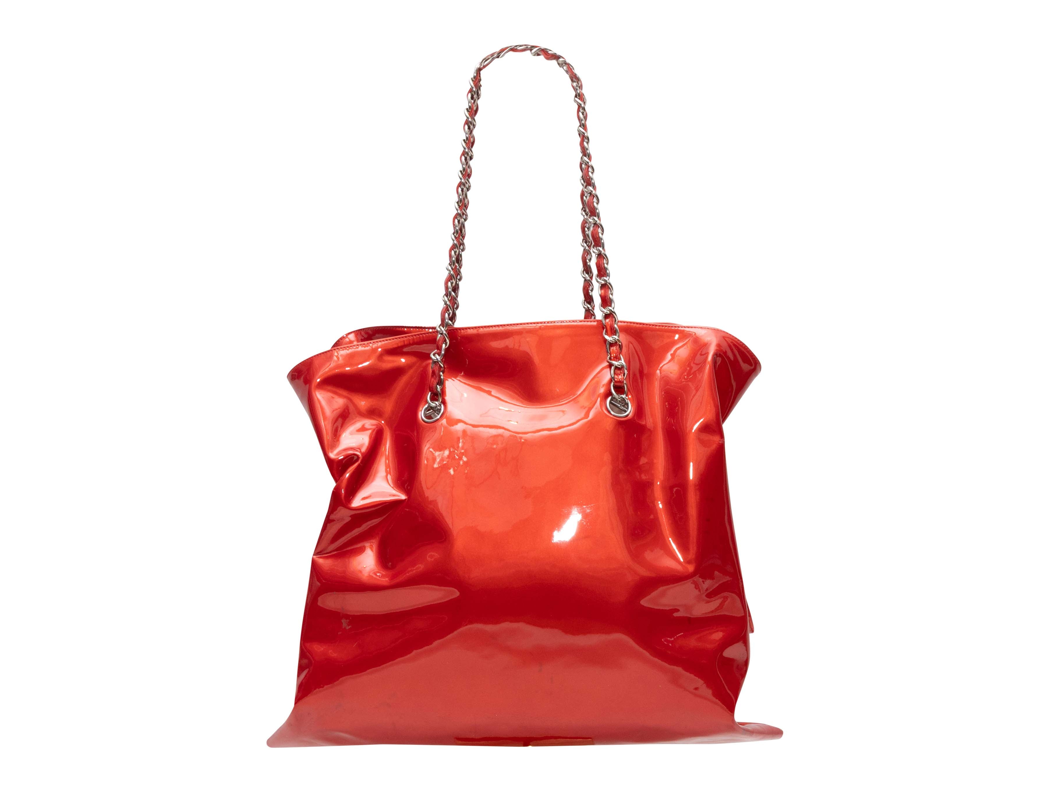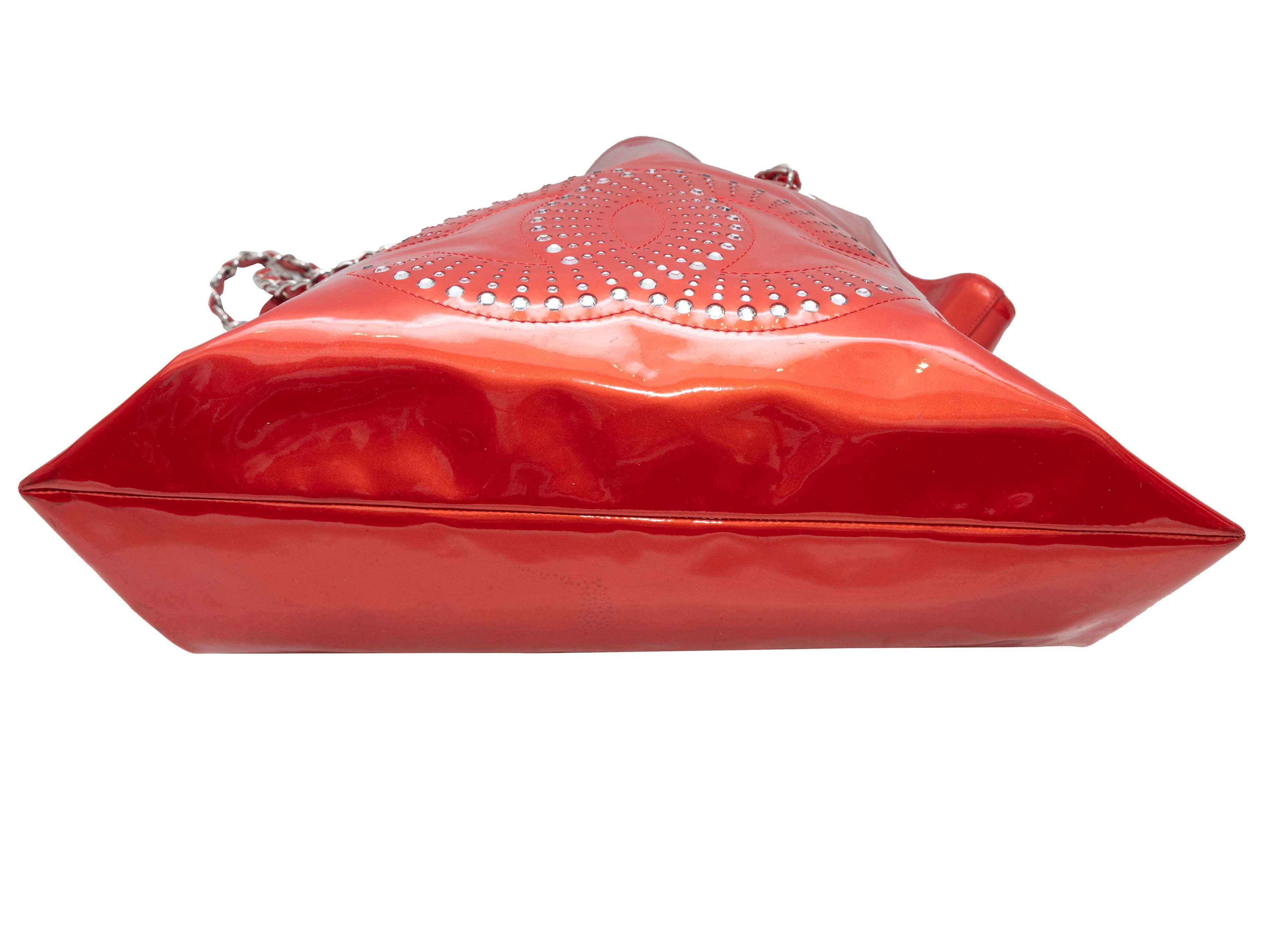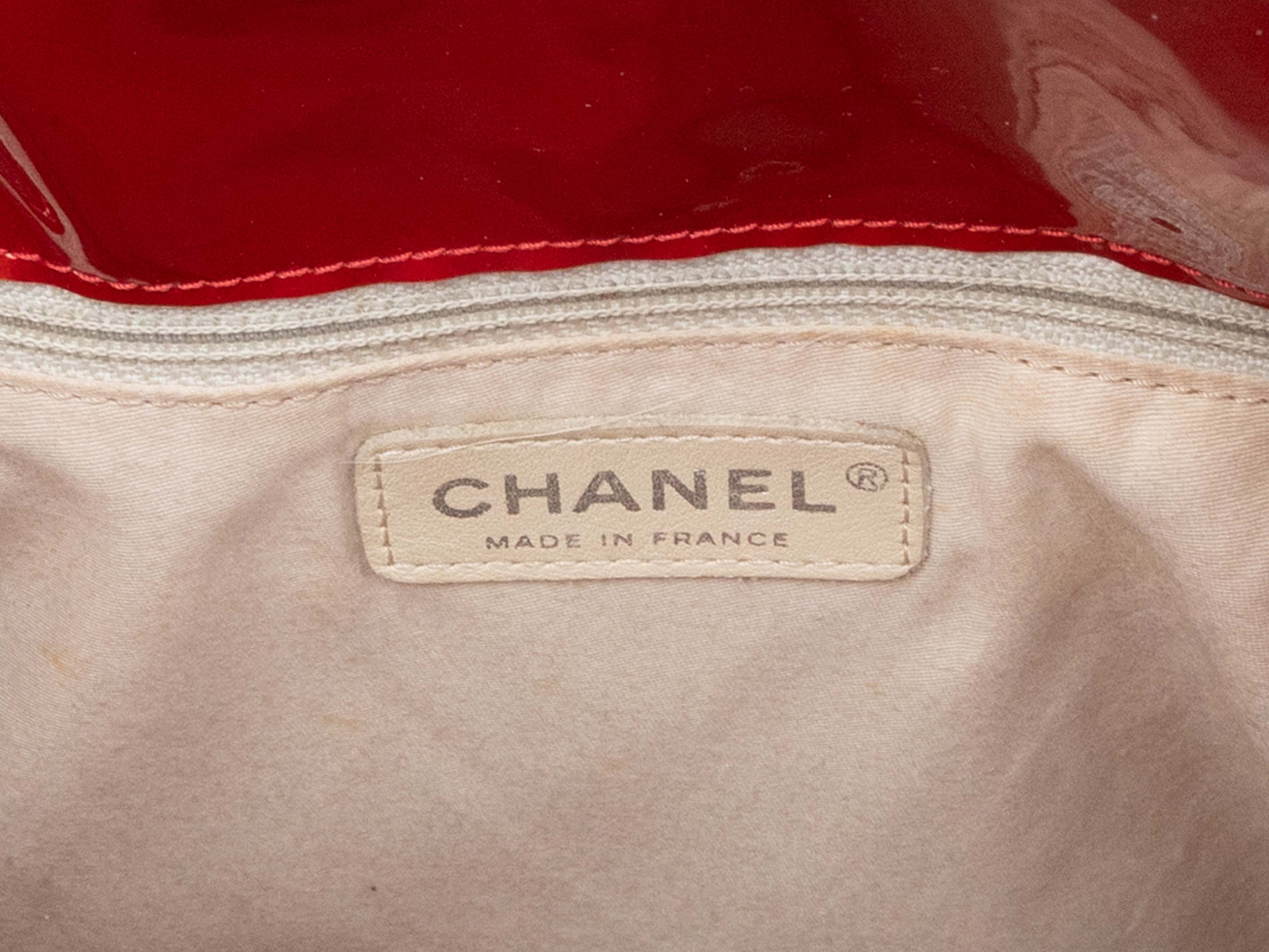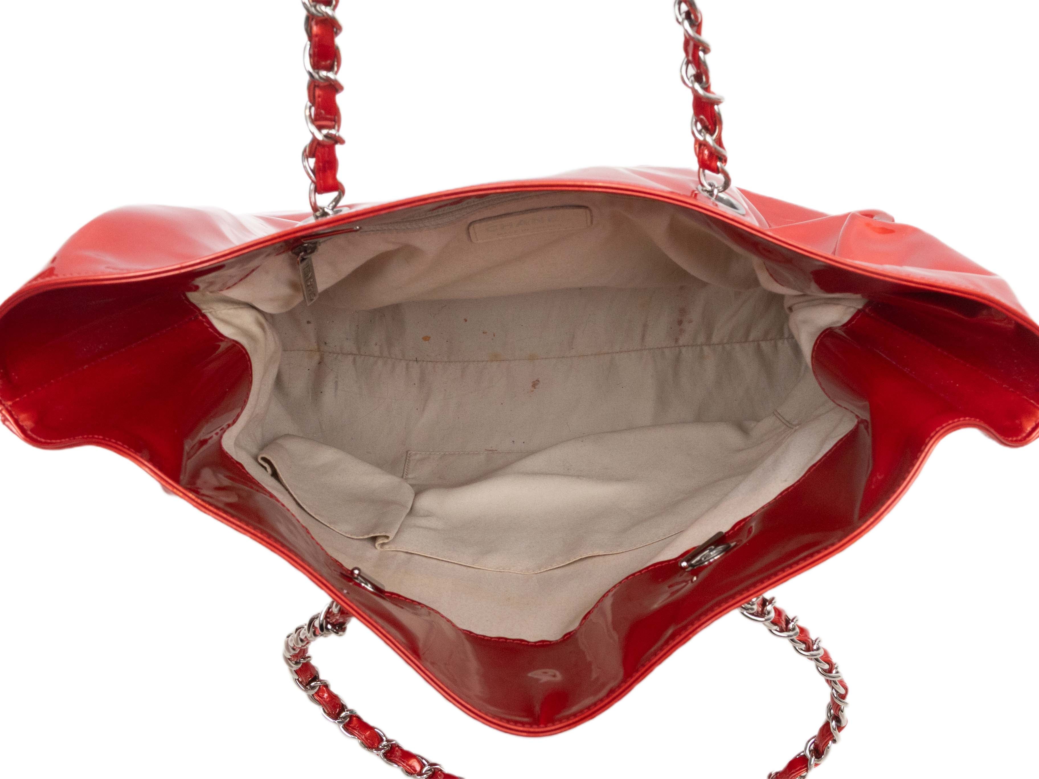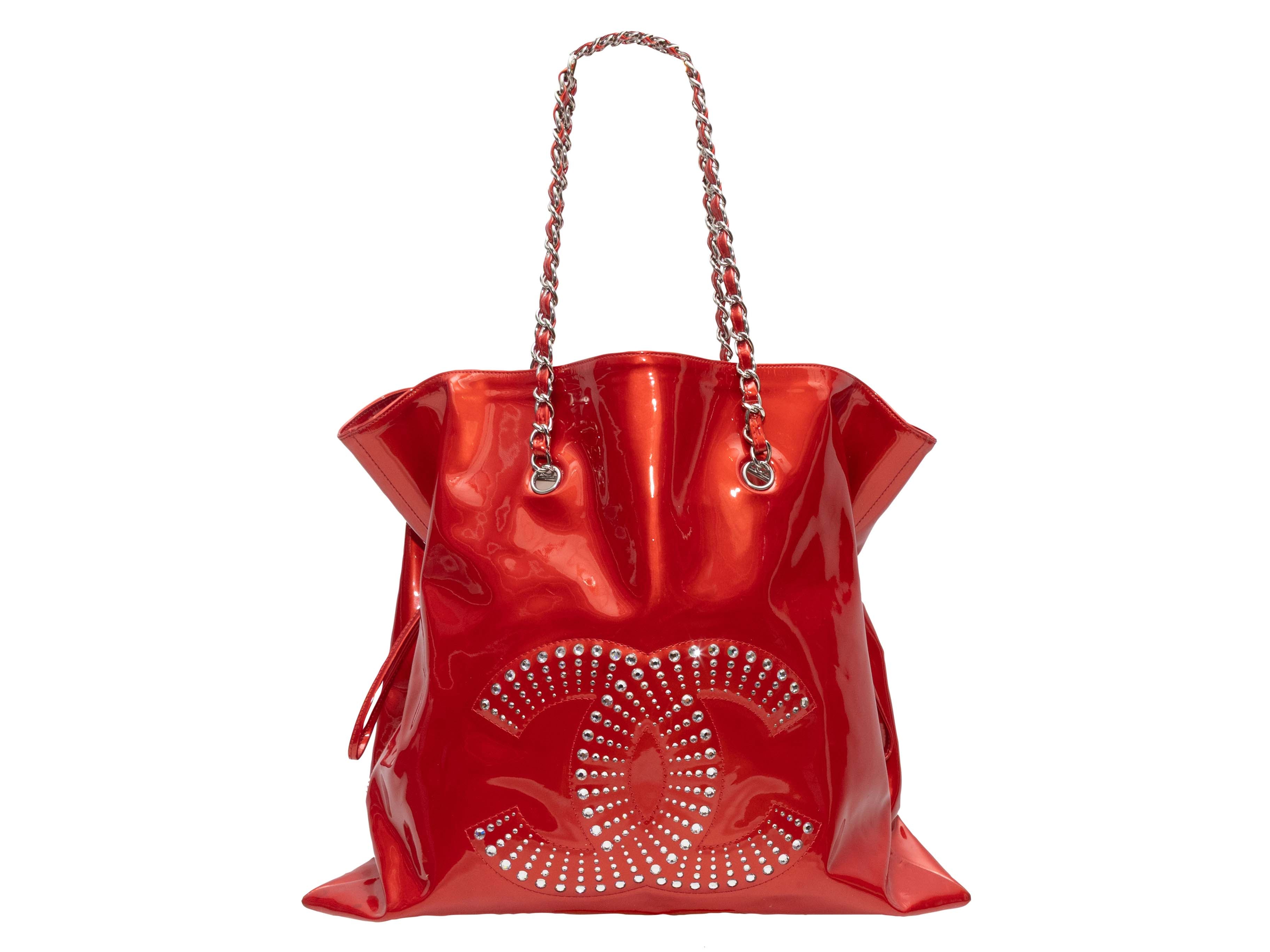 Product Details: Red Chanel Patent Bon Bon Tote Bag. The Bon Bon Tote Bag features a patent leather body, silver-tone hardware, crystal-embellished CC detailing at front, and dual chain-link and patent leather straps. 17.5" L x 13.5" H x 5" D, 8.5" shoulder strap drop. Serial number 13461619.