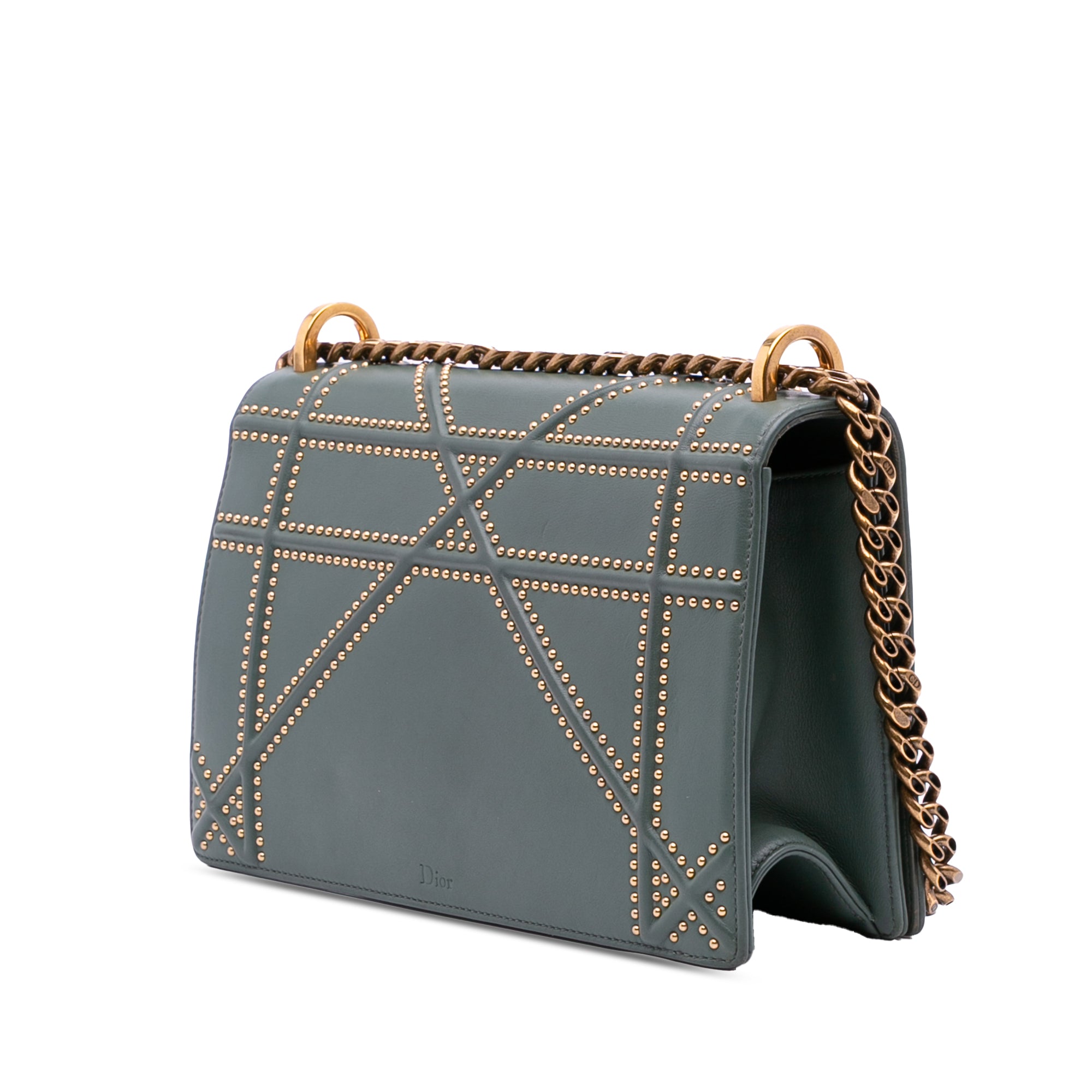 Product Details: Seafoam Green Dior Medium Studded Lambskin Diorama Flap Crossbody Bag. The Diorama Flap bag features a studded leather body, a chain and leather shoulder strap, a front flap with a push lock closure, and interior zip and slip pockets. 6.7" L x 9.8" W x 3.5" D. Serial number 01-BO-0139.
