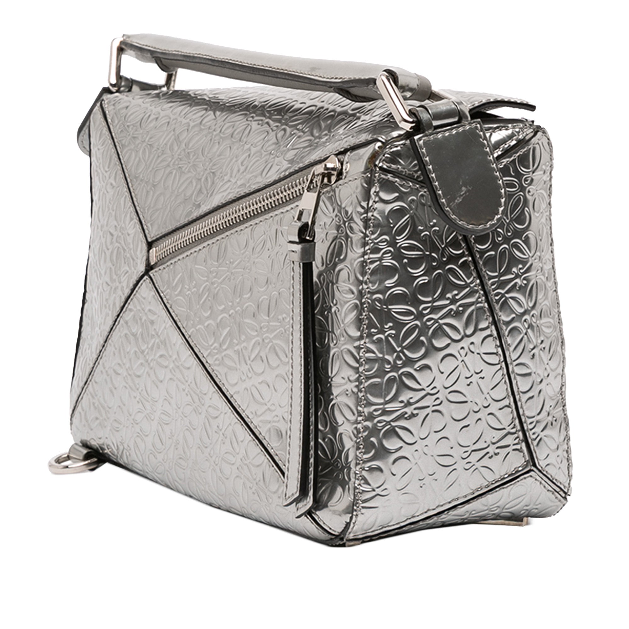 Silver LOEWE Small Anagram Embossed Patent Puzzle Satchel