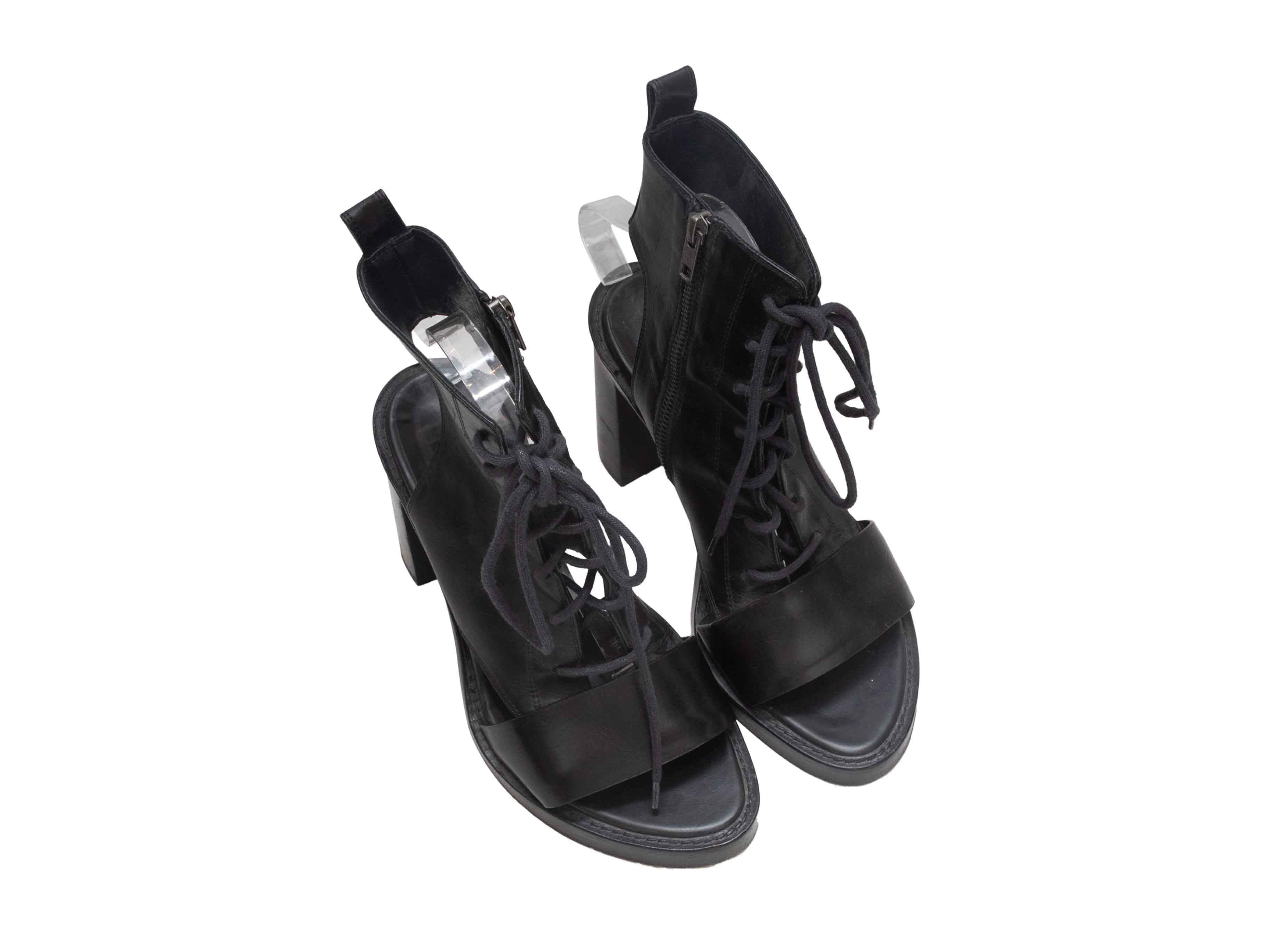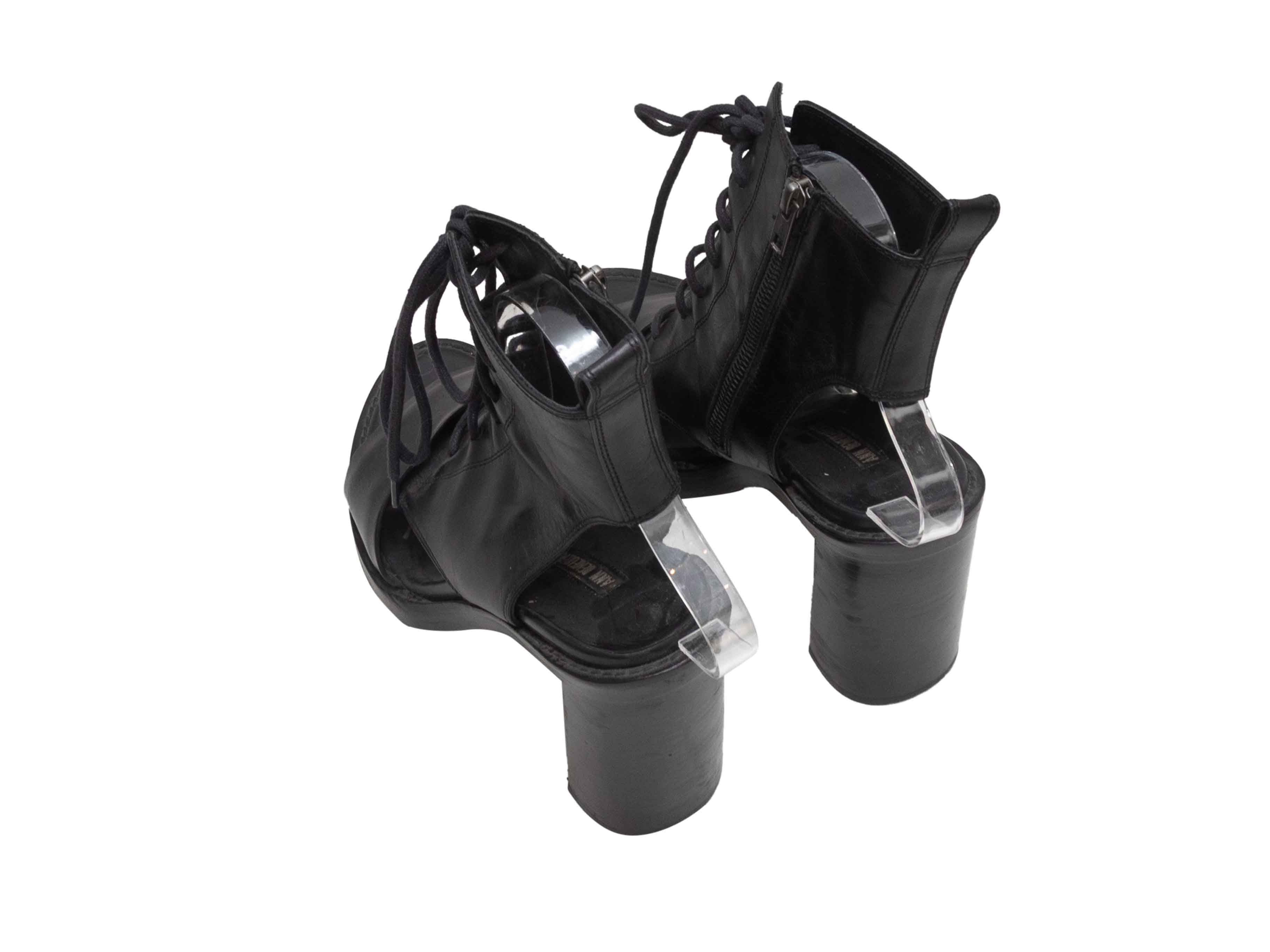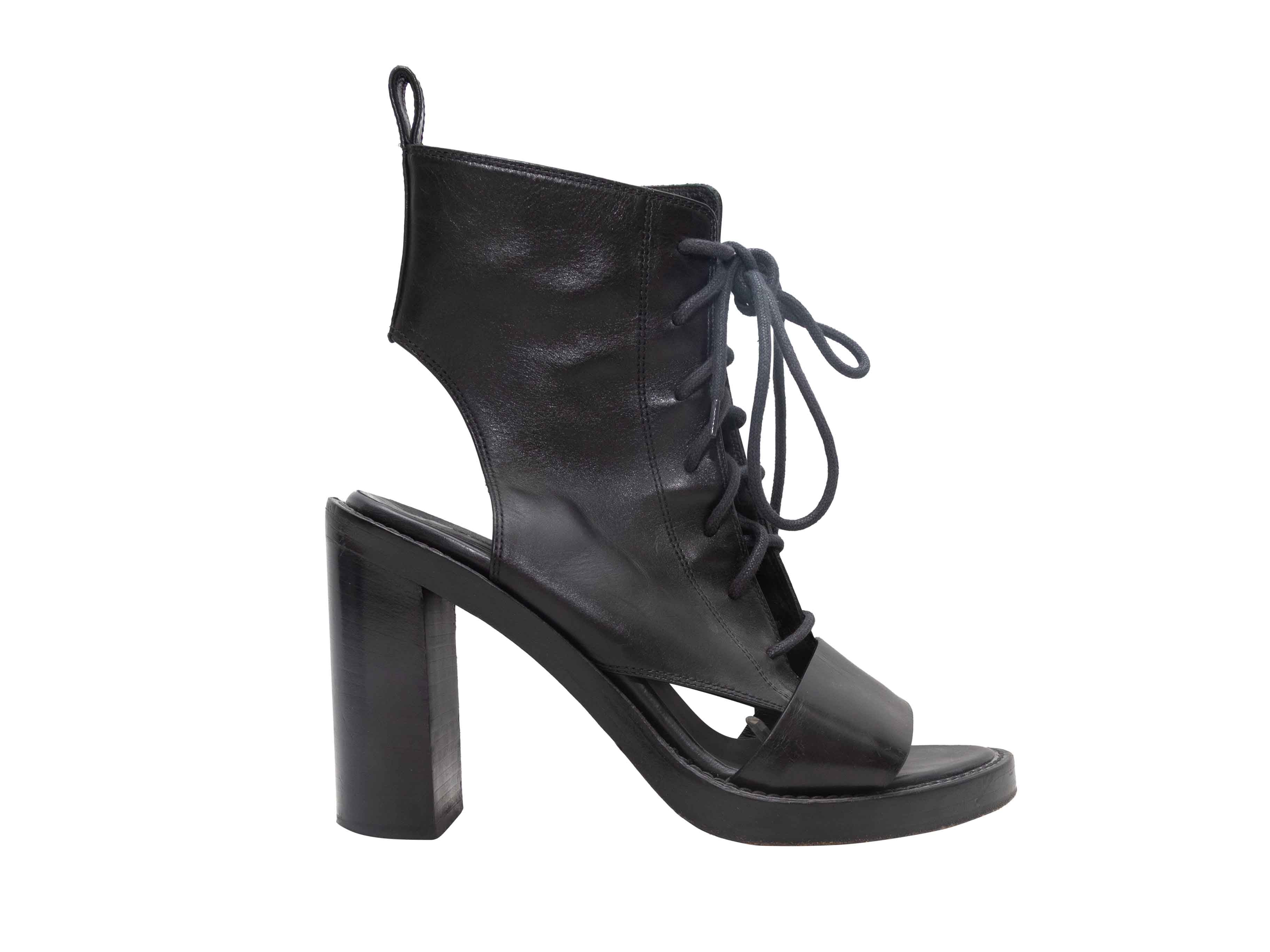 Product Details: Black leather heeled lace-up cutout sandals by Ann Demeulemeester. Stacked heels. Lace-up tie closures at tops. 5" shaft height, 0.75" platform height, 4.25" heel height.