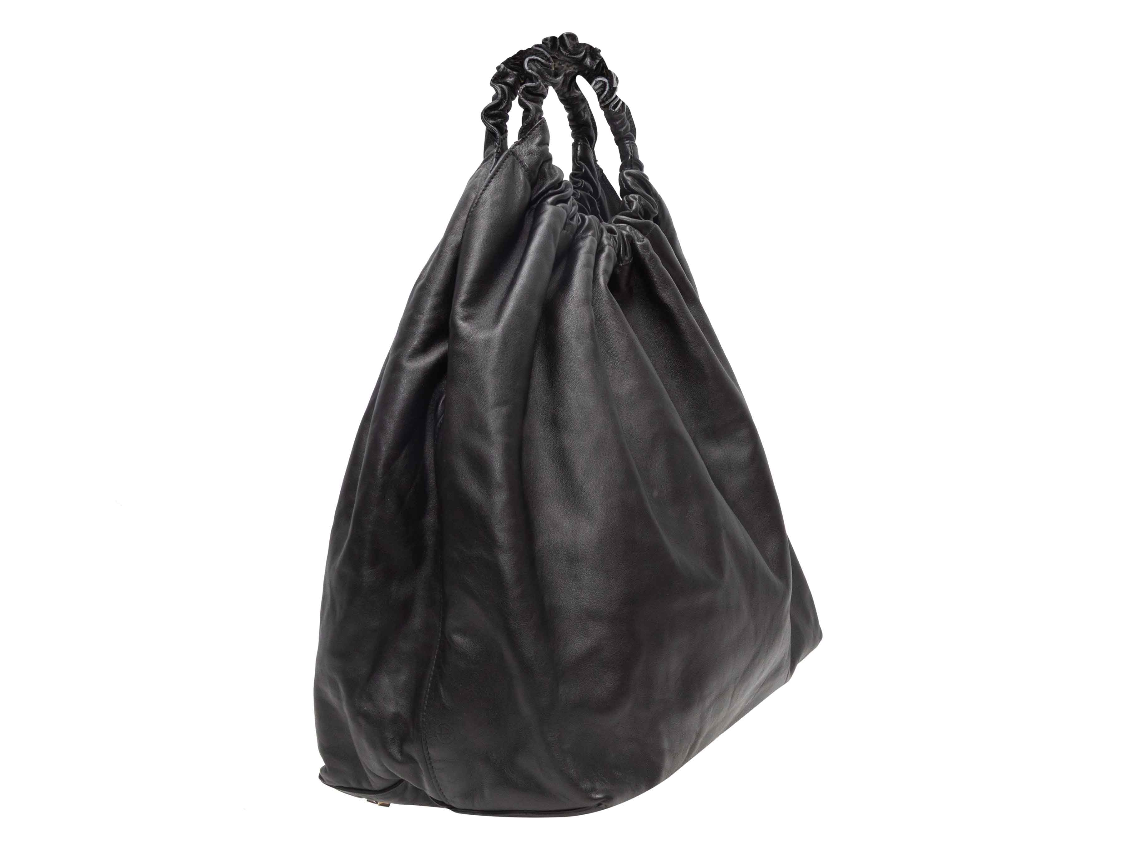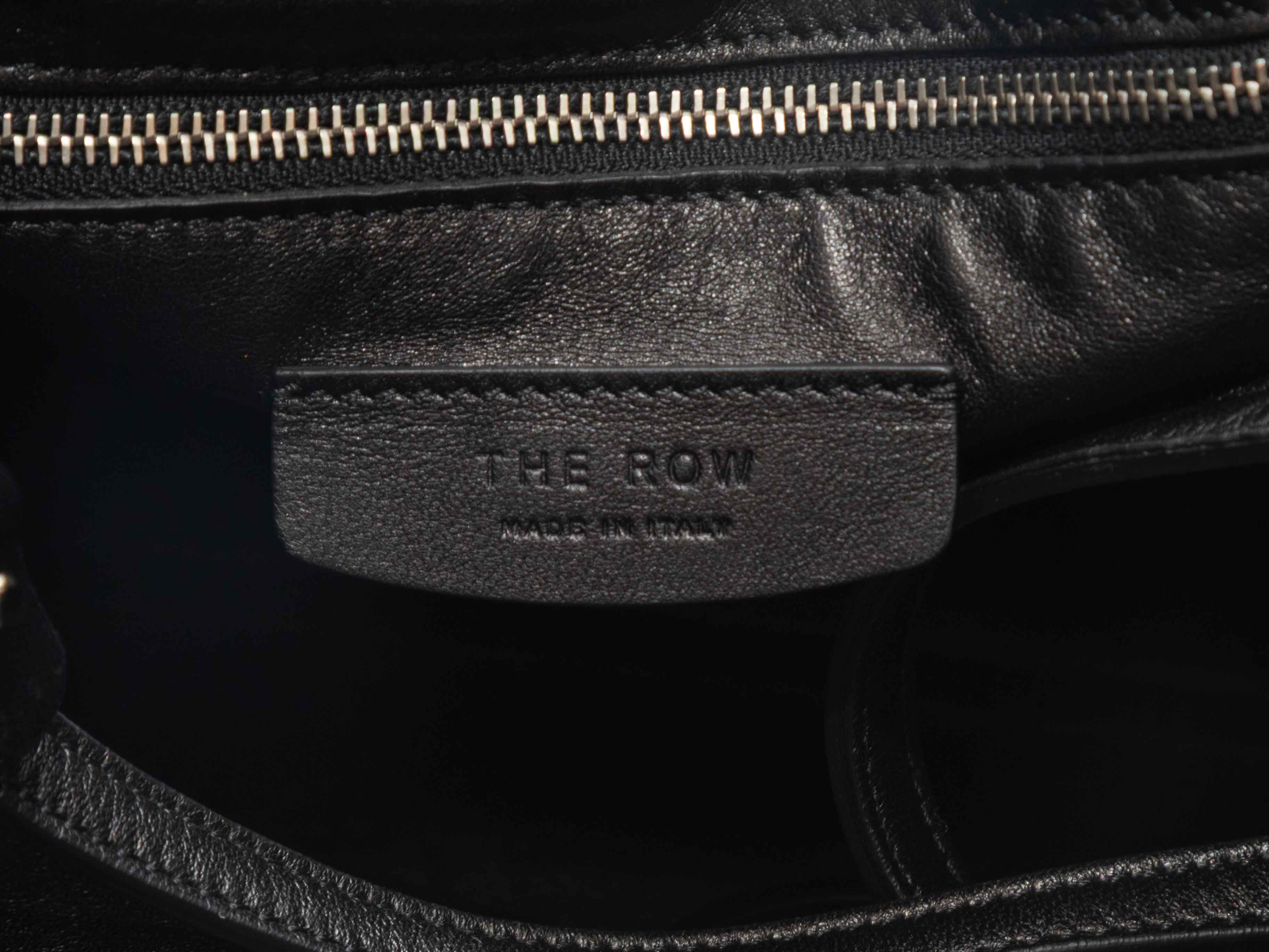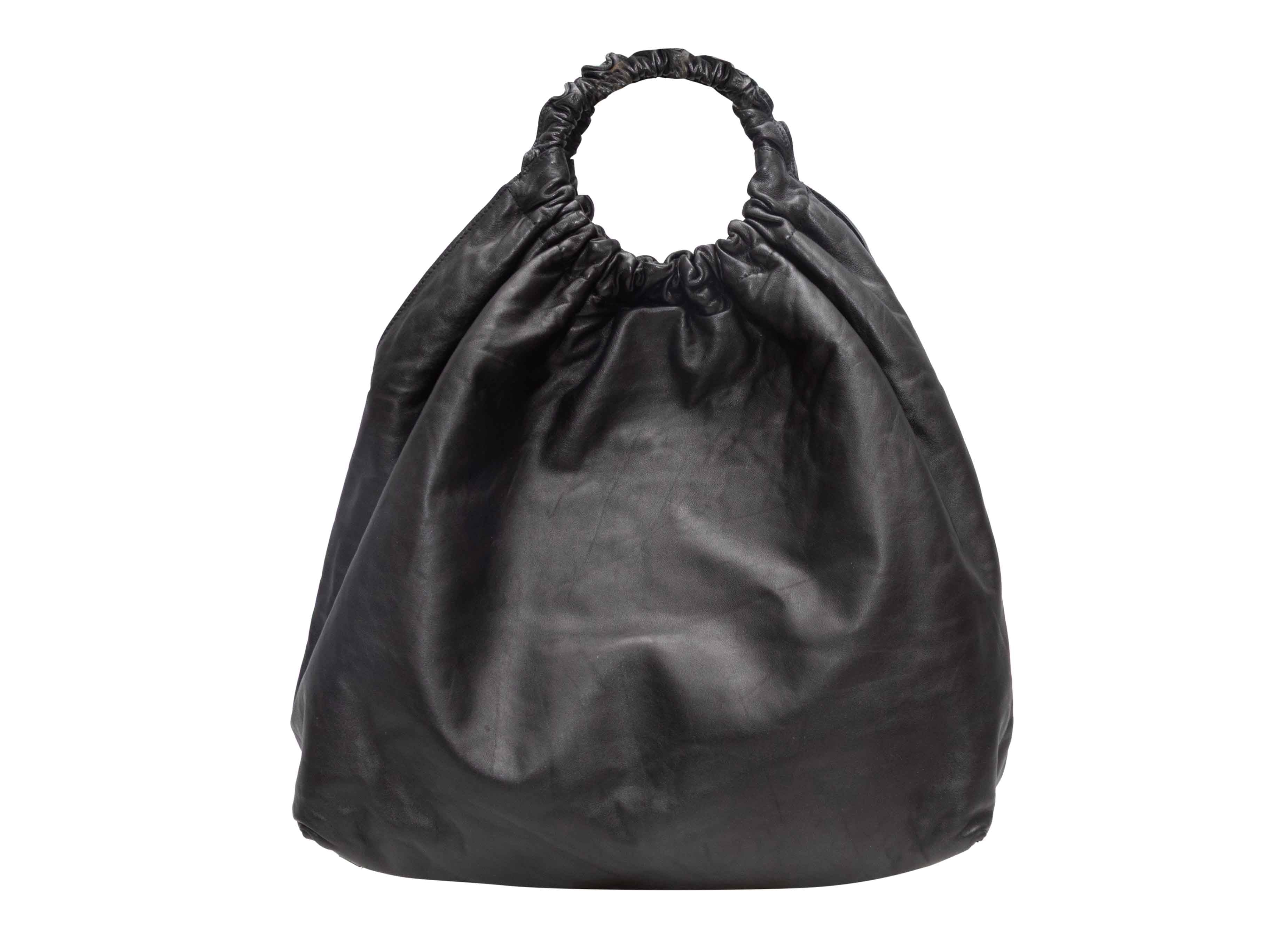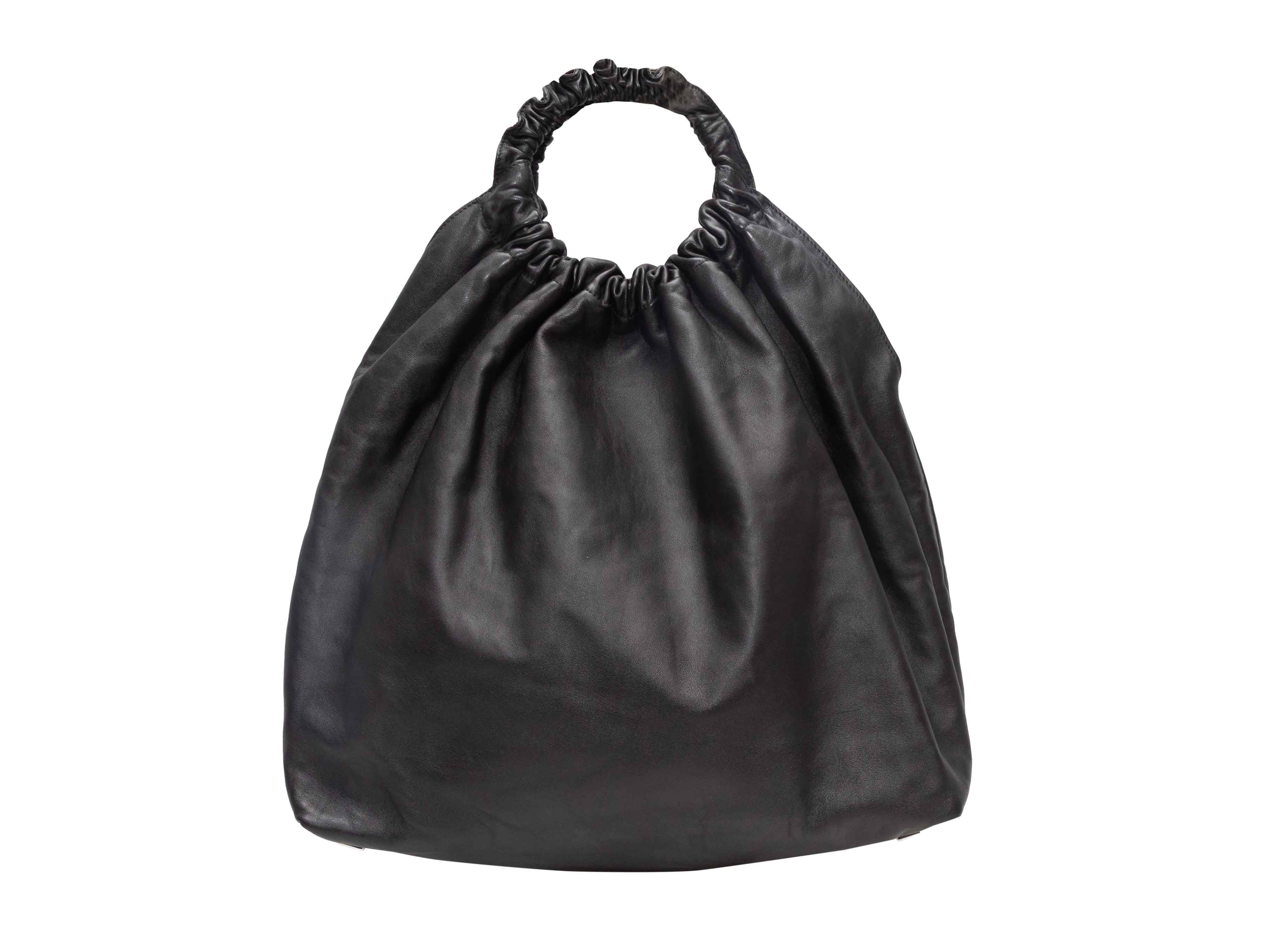 Product Details: Black The Row Leather Double Circle Handbag. The Double Circle Handbag features a leather body and dual circular top handles. 16" L x 11.5" H x 9" D, 4" handle drop, 23" shoulder strap drop.