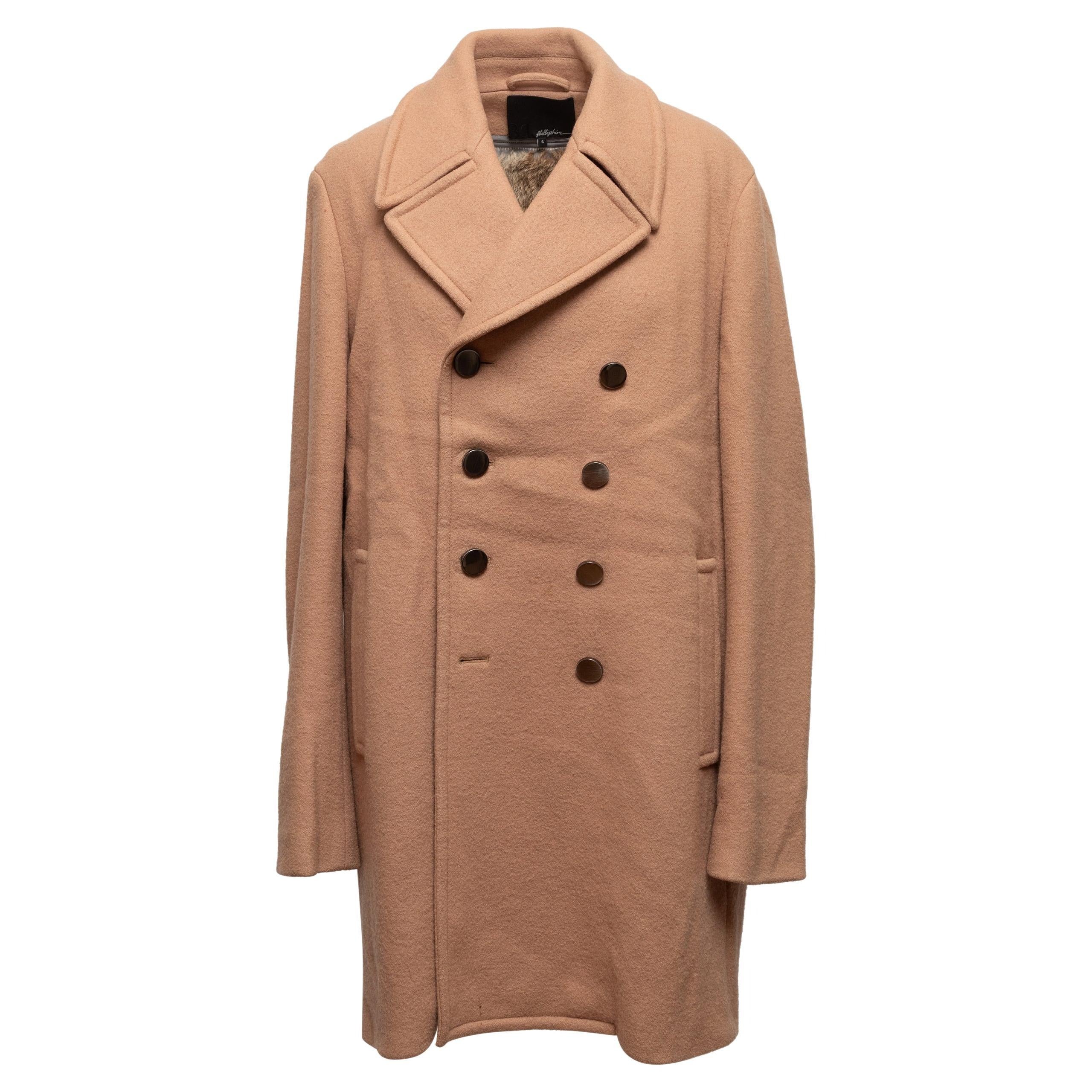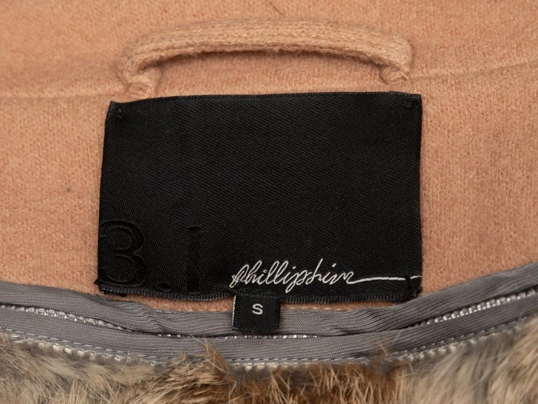 Product Details: Tan wool double-breasted coat by Phillip Lim. Detachable rabbit fur lining. Notched lapel. Dual hip pockets. Button closures at front. 40" bust, 20" shoulder width, 27" sleeve length, 36" length.