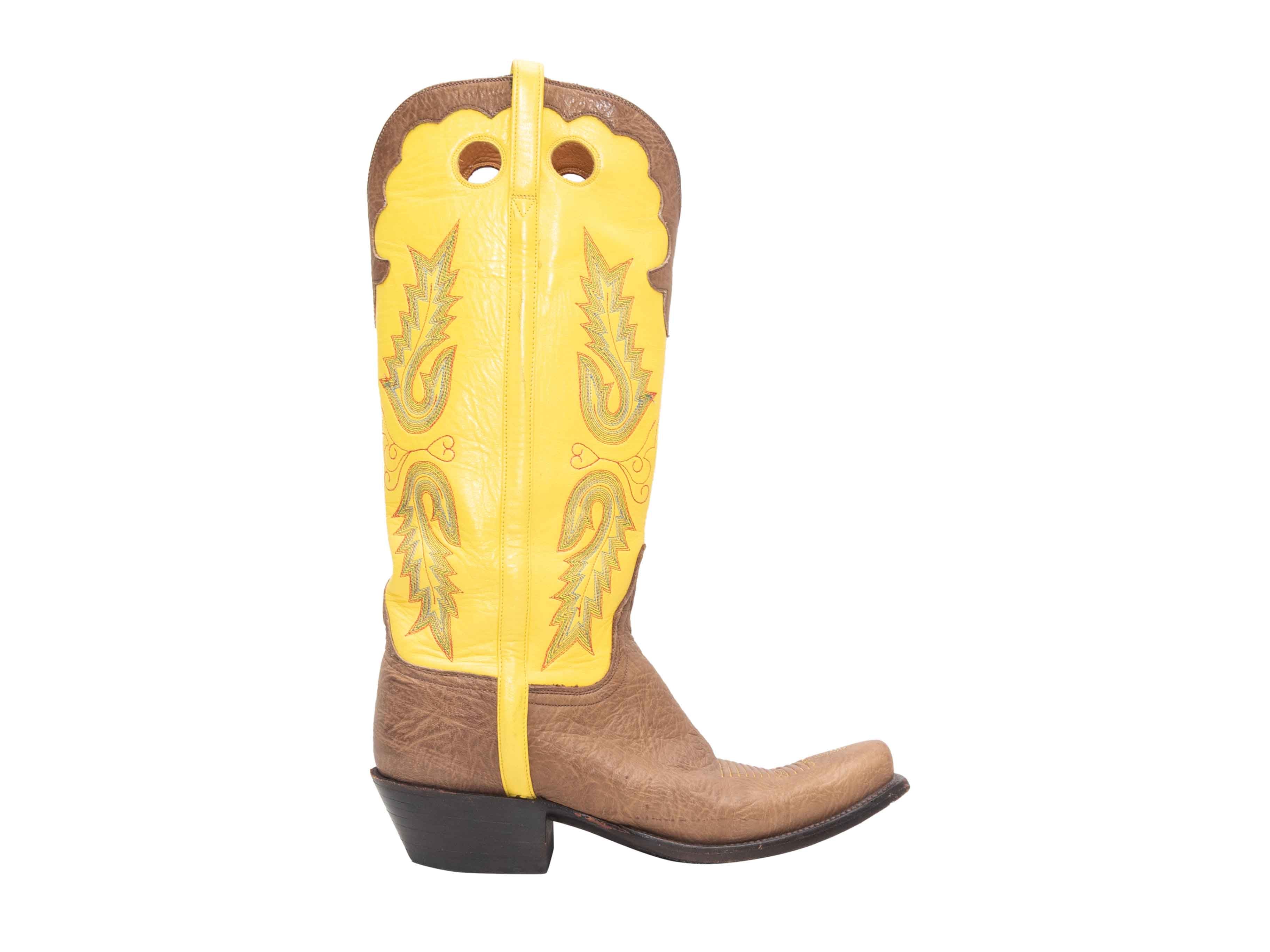Product Details: Yellow and brown knee-high leather cowboy boots by Lucchese. Stacked heels. 11.5" shaft height, 0.25" platform height, 2" heel height.