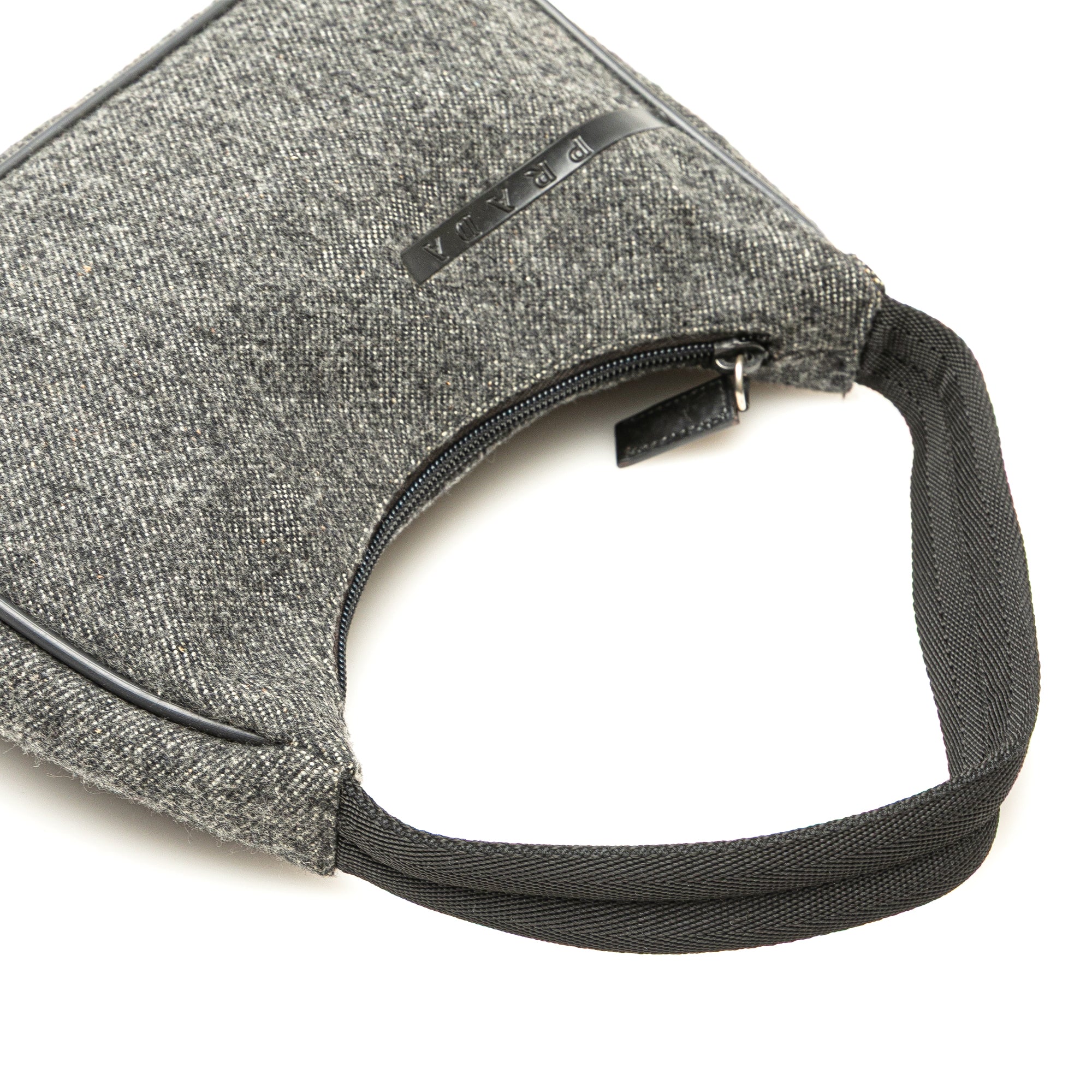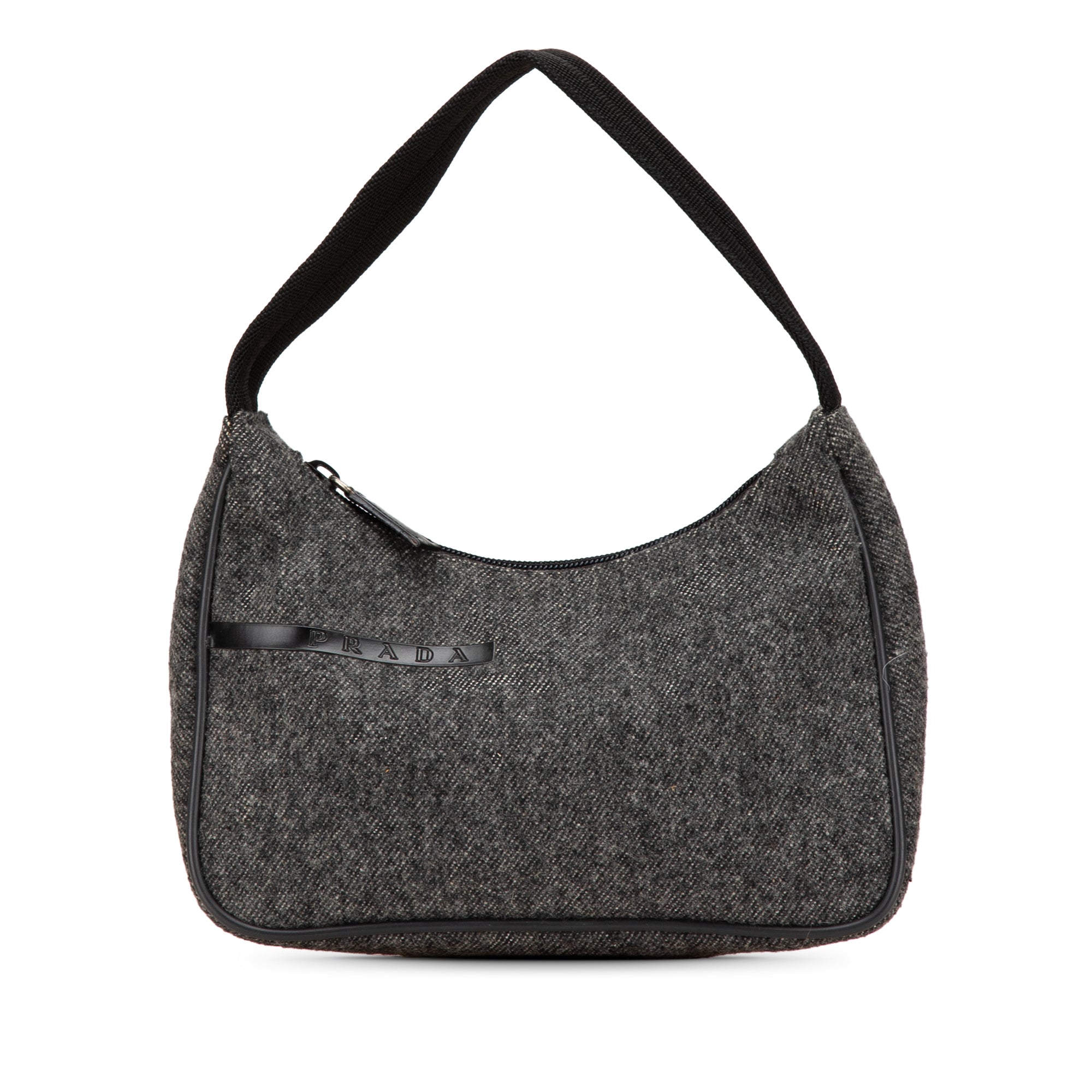 Product Details: Gray Prada Wool Shoulder Bag. This shoulder bag features a wool body with leather trim, a flat strap, and a top zip closure. 5.3" L x 9.1" W x 2.4" D, 5.5" drop.