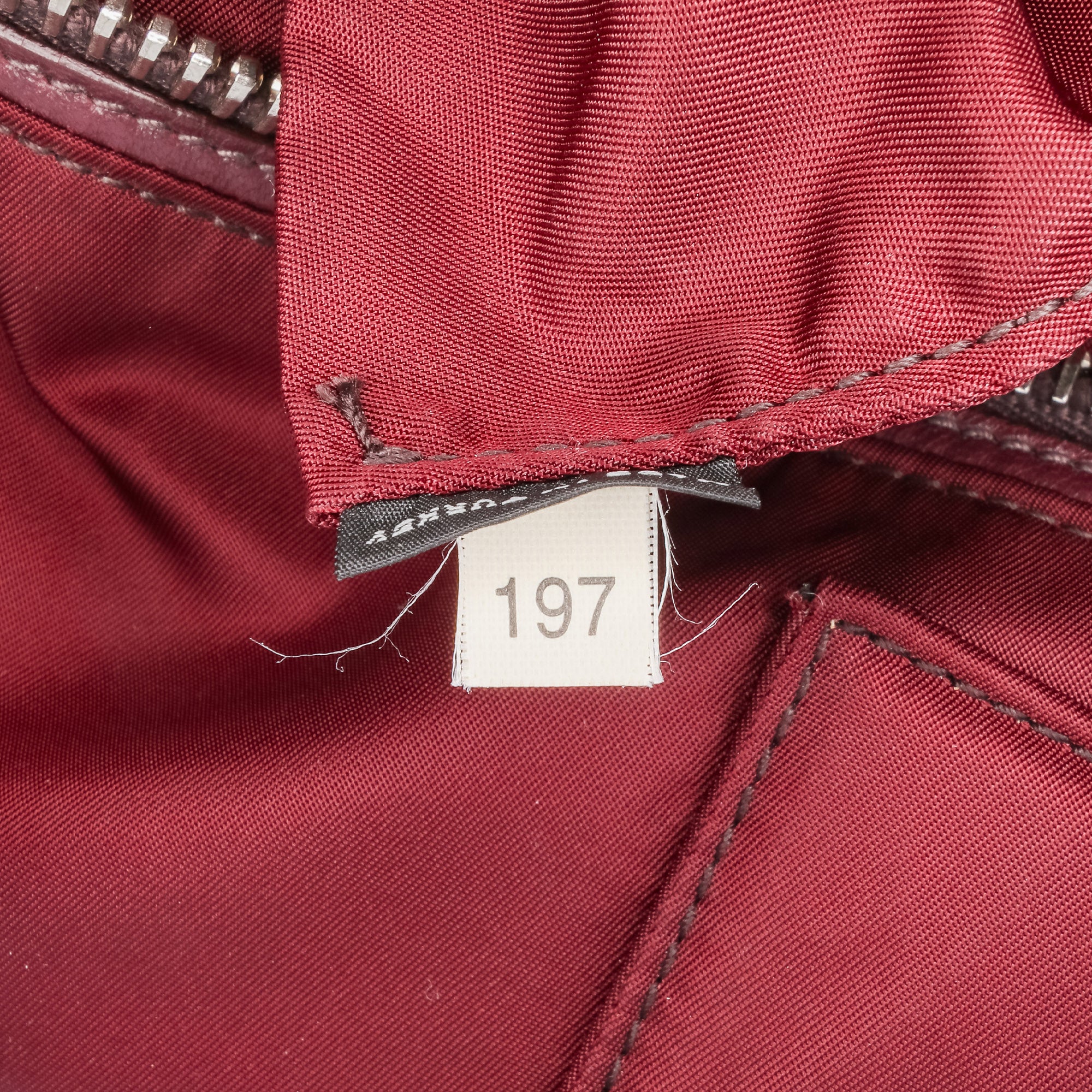Product Details: Red Prada Tessuto and Nappa Reversible Satchel. This satchel features a nylon and nappa leather body, rolled handles, a detachable flat shoulder strap, an open top, an exterior front zip pocket, and an interior zip pocket. 11.4" L x 12.4" W x 6.9" D, 5.1" drop. Serial number 197.