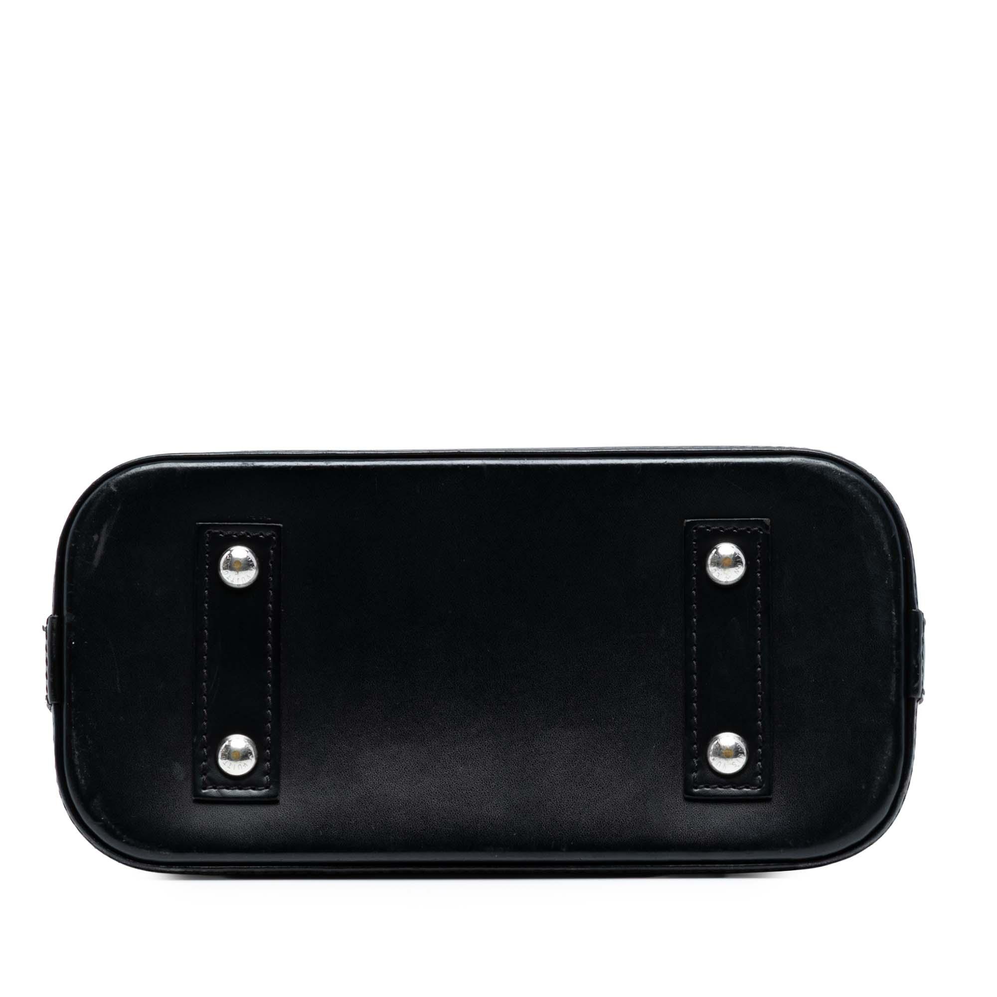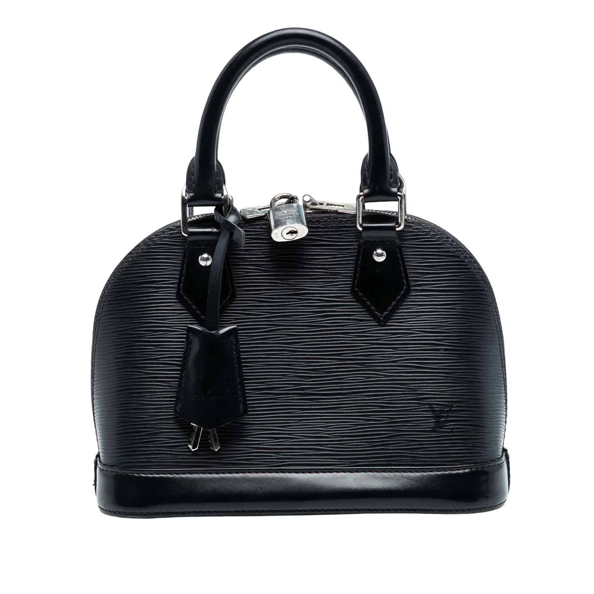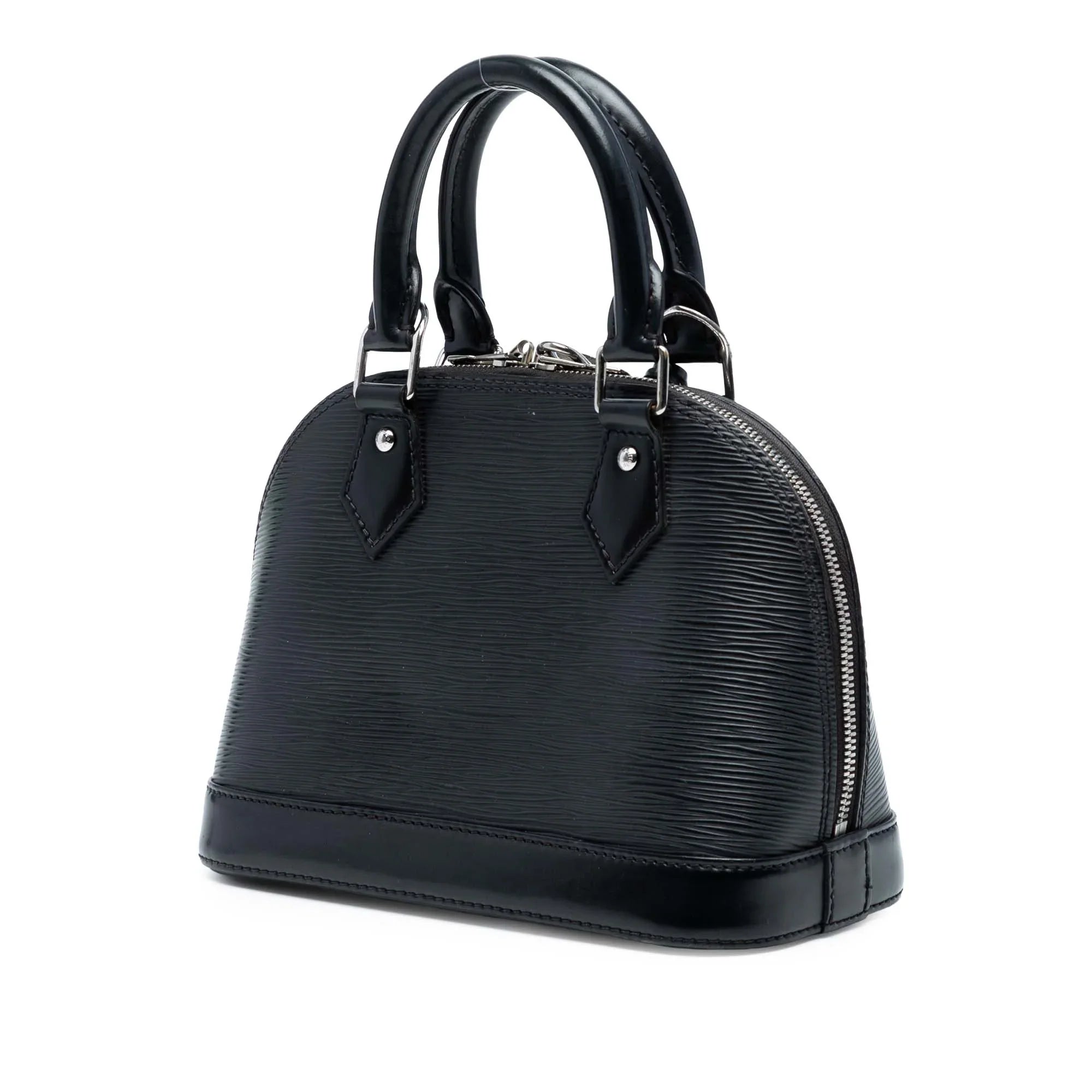 Product Details: Black Louis Vuitton Epi Alma BB Satchel. The Alma BB features an epi leather body, rolled leather top handles, a detachable flat leather strap, a top zip closure, and an interior slip pocket. 6.9" L x 9.3" W x 4.5" D, 3.9" drop. Serial number AA3270.