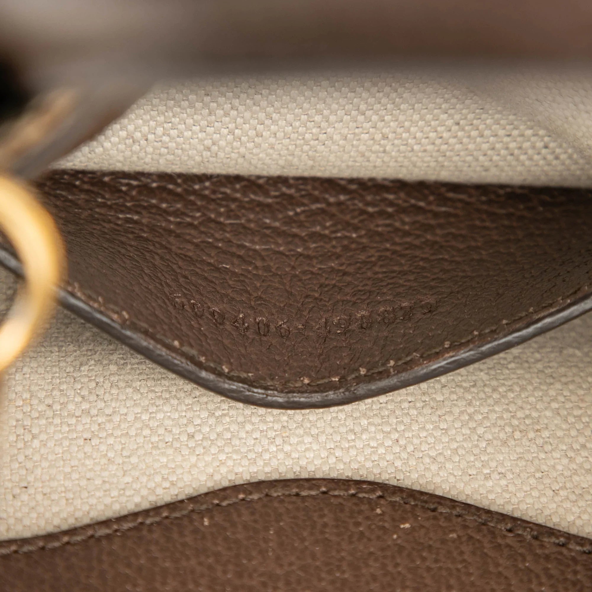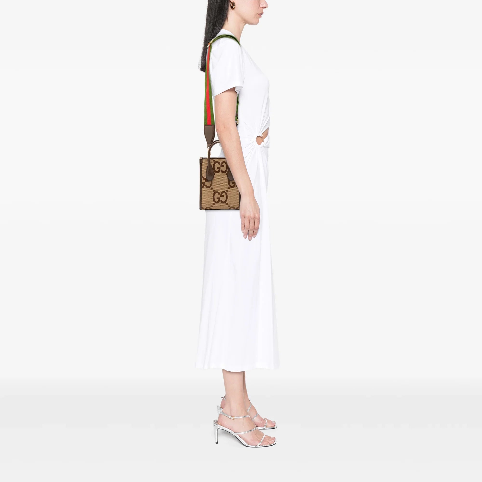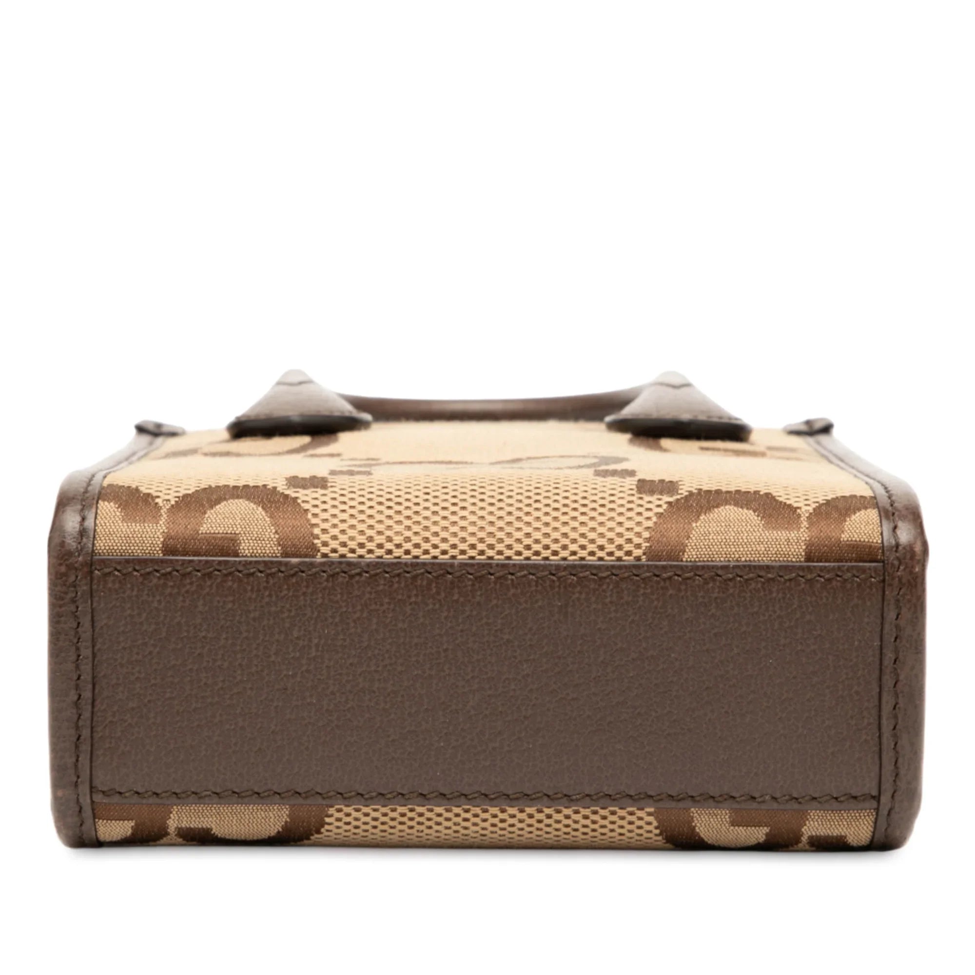 Product Details: Brown Gucci Mini Jumbo GG Canvas Web Satchel. This satchel features a canvas body with leather trim, rolled leather handles, a detachable web canvas strap, an open top, and an interior slip pocket. 7.5" L x 6.3" W x 2.6" D, 2.4" drop. Serial number 699406 498879.