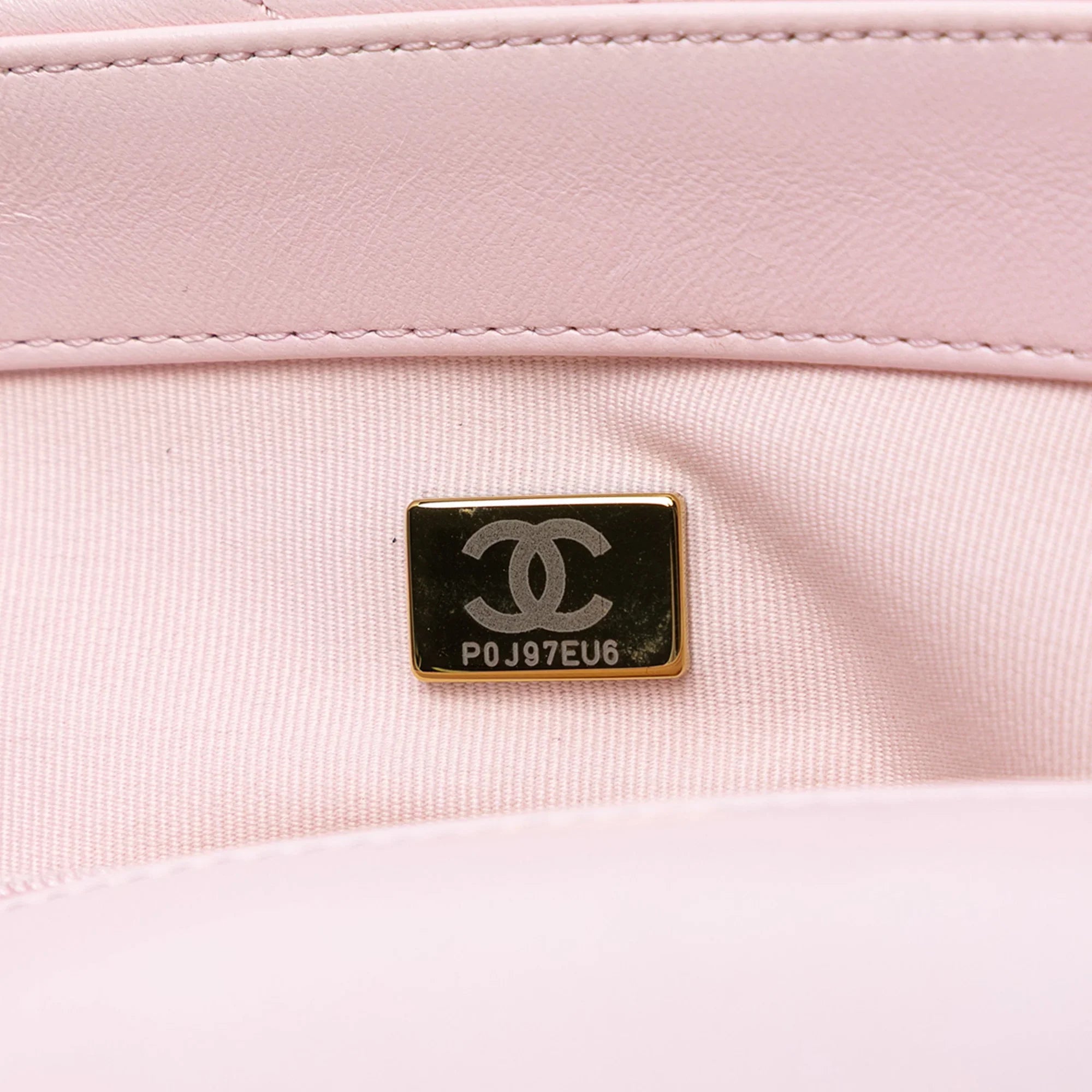 Product Details: Pink Chanel Medium Lambskin 19 Flap Satchel. The 19 Flap Bag features a quilted lambskin leather body, a chain link handle, a woven leather chain shoulder strap, a front flap with twist-lock closure, an exterior back slip pocket, and an interior zip pocket. 6.5" L x 9.8" W x 2.4" D, 3.3" drop. Serial number POJ97EU6.
