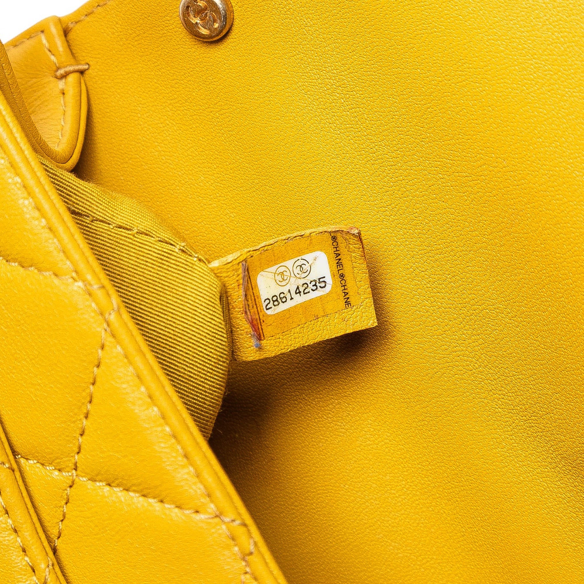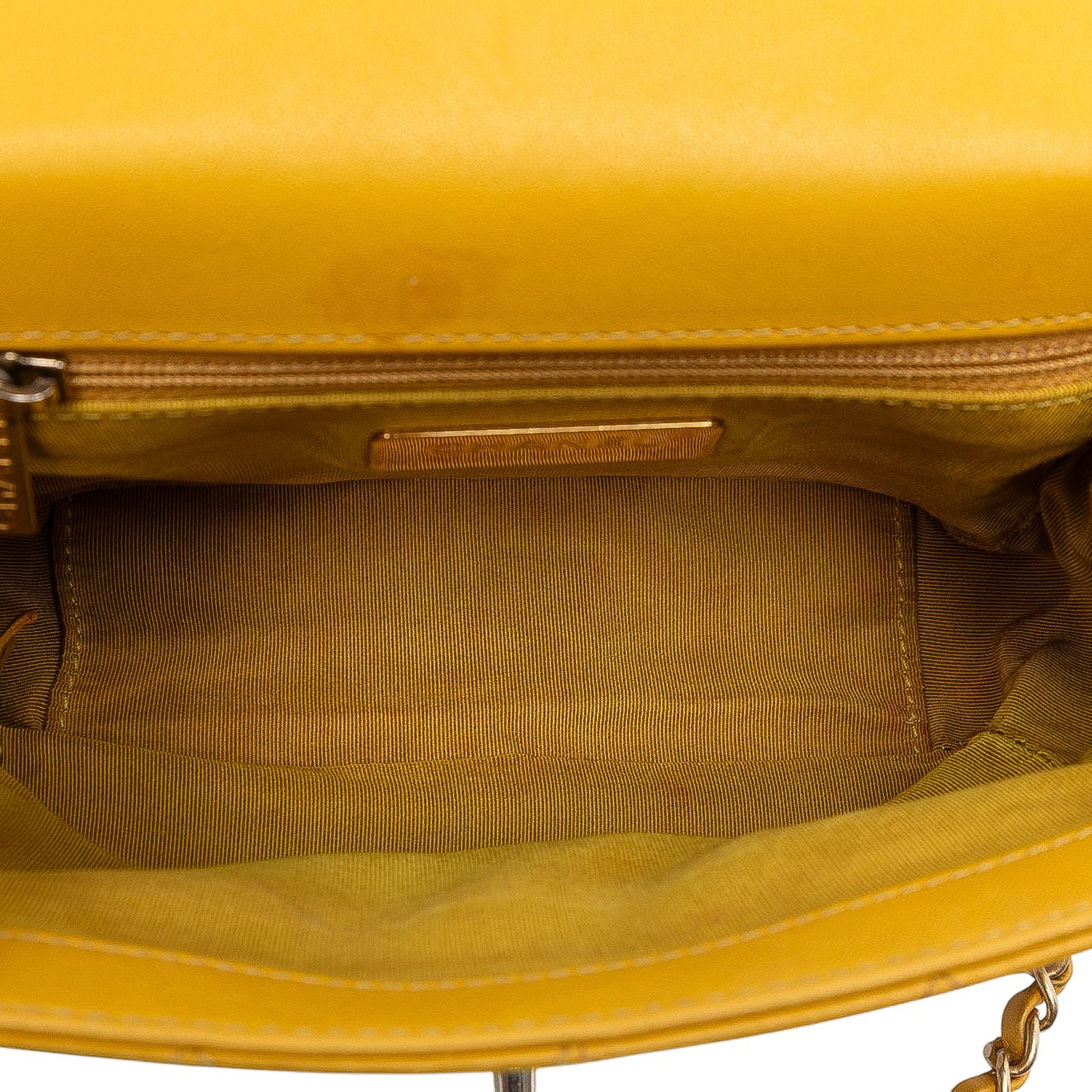 Product Details: Yellow Chanel Small Quilted Lambskin Chain Infinity Top Handle Bag Satchel. This satchel features a quilted lambskin leather body, a leather-woven chain top handle, a leather woven chain link strap with leather guard, a front flap with CC turn lock closure, an exterior back slip pocket, and an interior zip pocket. Exterior back and corners has been repainted. 5.3" L x 7.9" W x 2.4" D, 2.2" drop. Serial number 28614235.