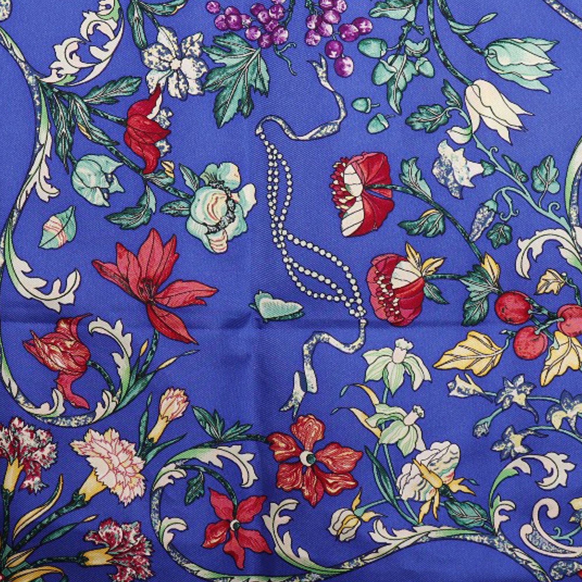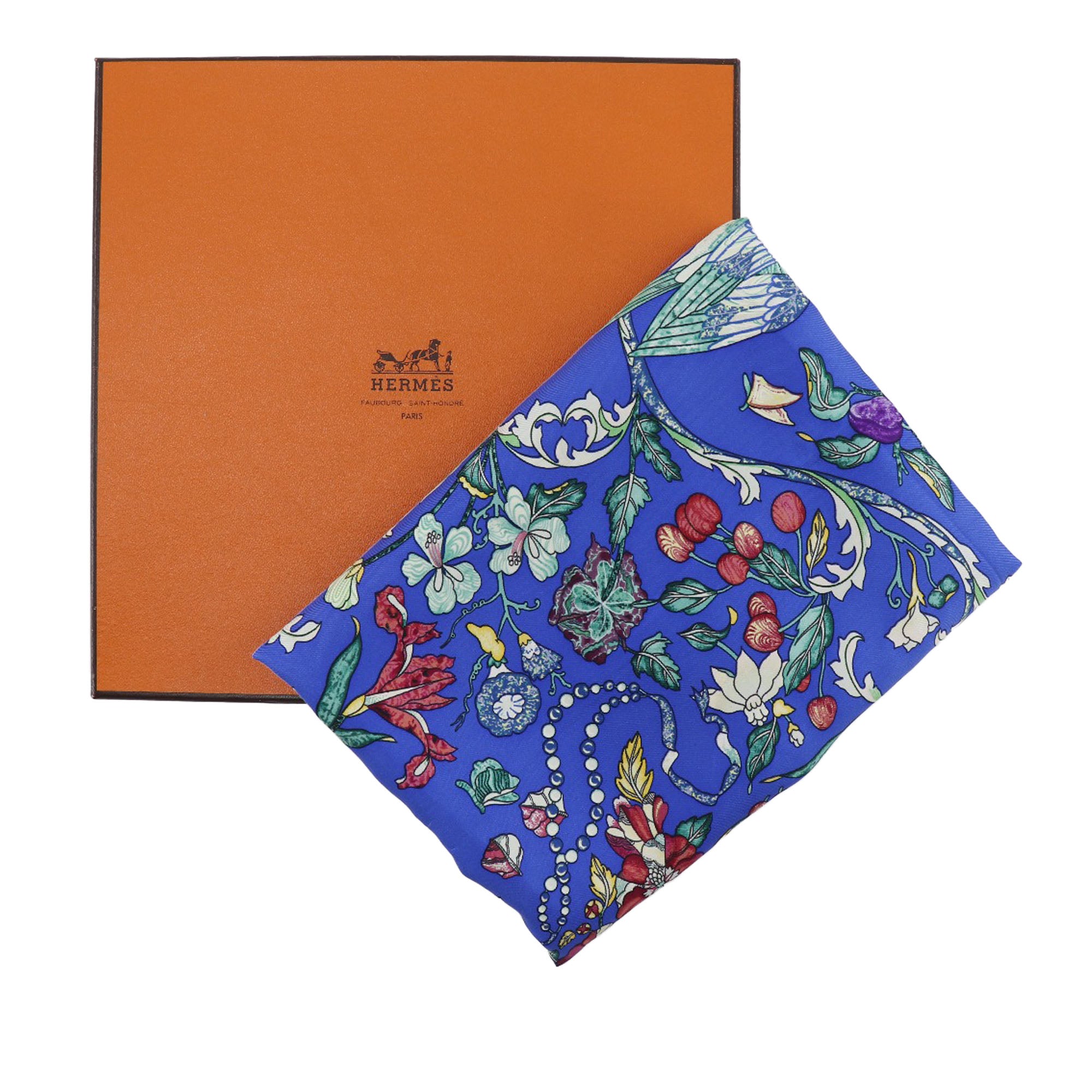 Product Details: Blue Hermès Pierres D Orient Et D Occident Silk Scarf 90 Scarves. This scarf features a Pierres D Orient Et D Occident print in 100% silk. 34.6" L x 35" W x 0" D.