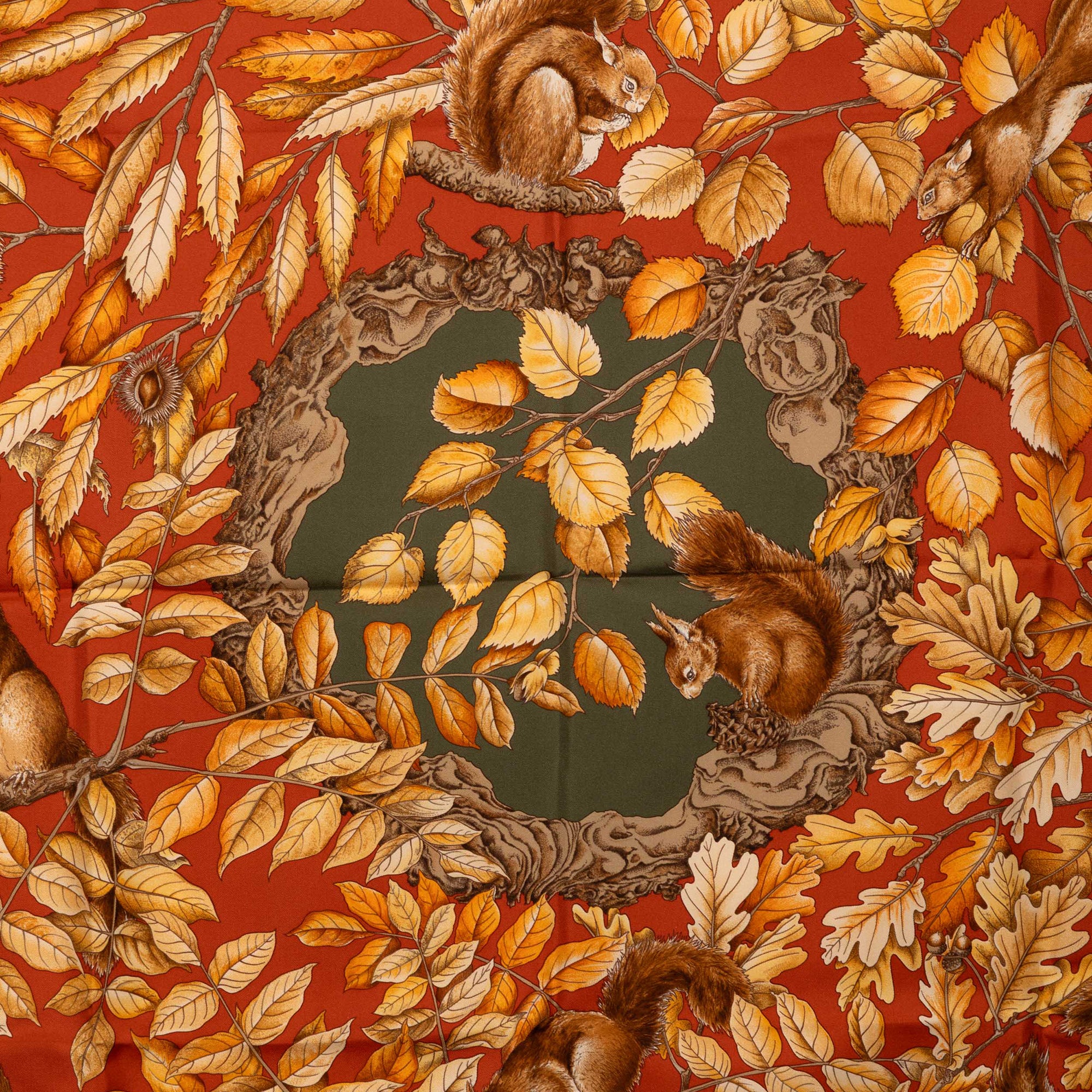 Product Details: Orange Hermès Casse Noisette Silk Scarf 90 Scarves. The Casse Noisette Silk 90 scarf features a 100% print on silk. 35" L x 34.8" W x 0" D.