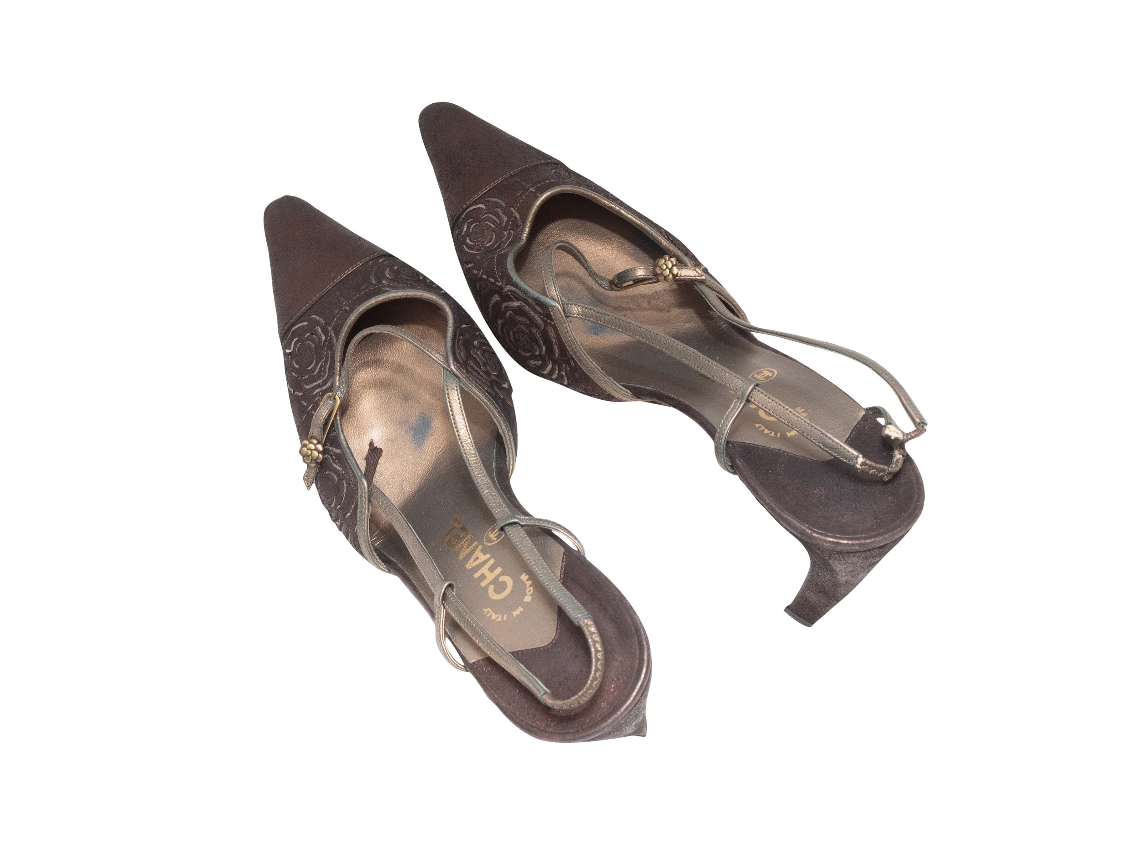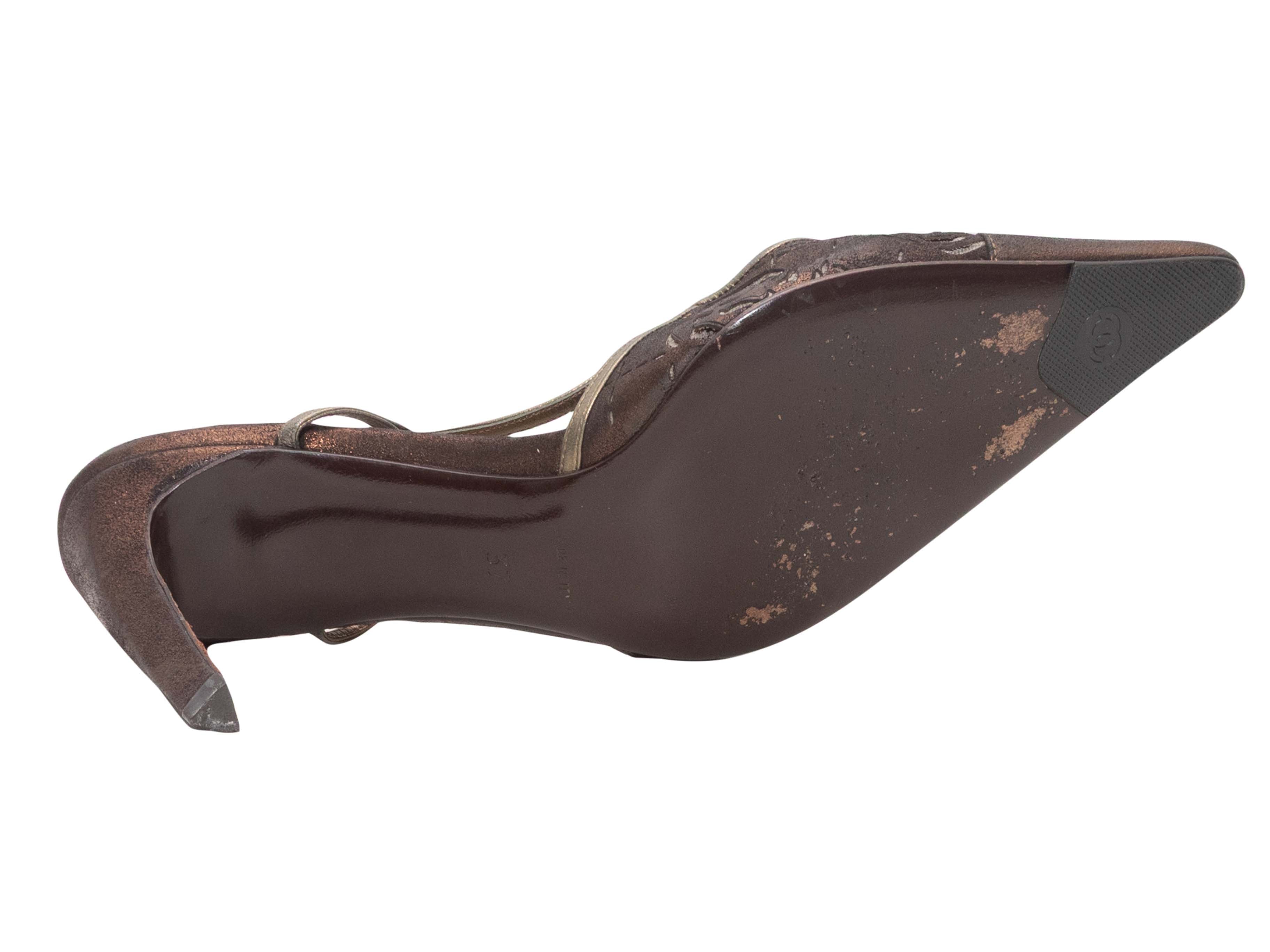 Product Details: Bronze and gold leather pointed-toe cutout slingbacks by Chanel. 3.5" heel height.