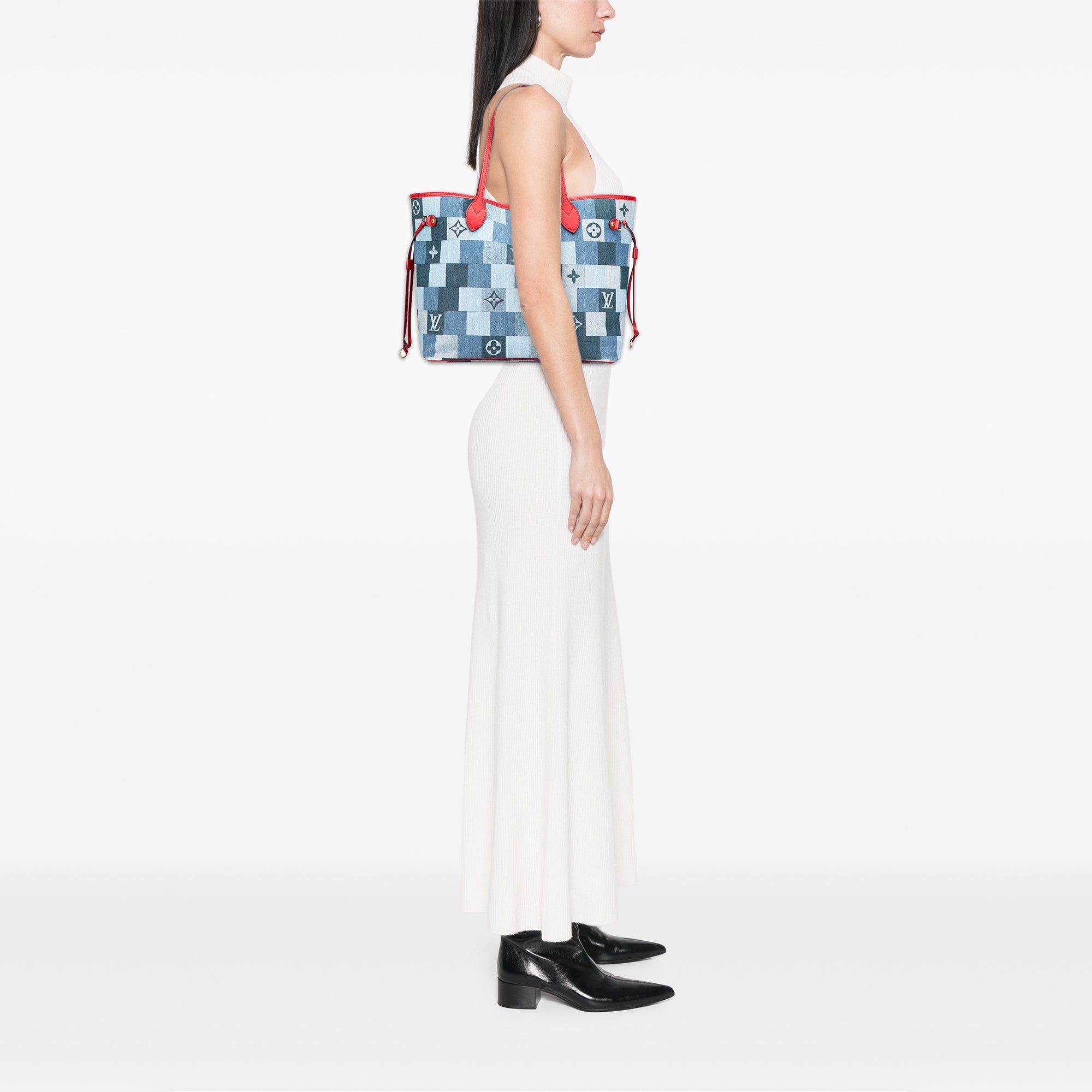 Product Details: Blue Louis Vuitton Monogram Denim Patchwork Neverfull MM Tote Bag. The Patchwork Neverfull MM features a denim body with leather trim, flat leather handles, an open top with a lobster clasp closure, an interior zip pocket, and a removable zip pouch. 11.4" L x 12.6" W x 6.3" D, 8.5" drop.