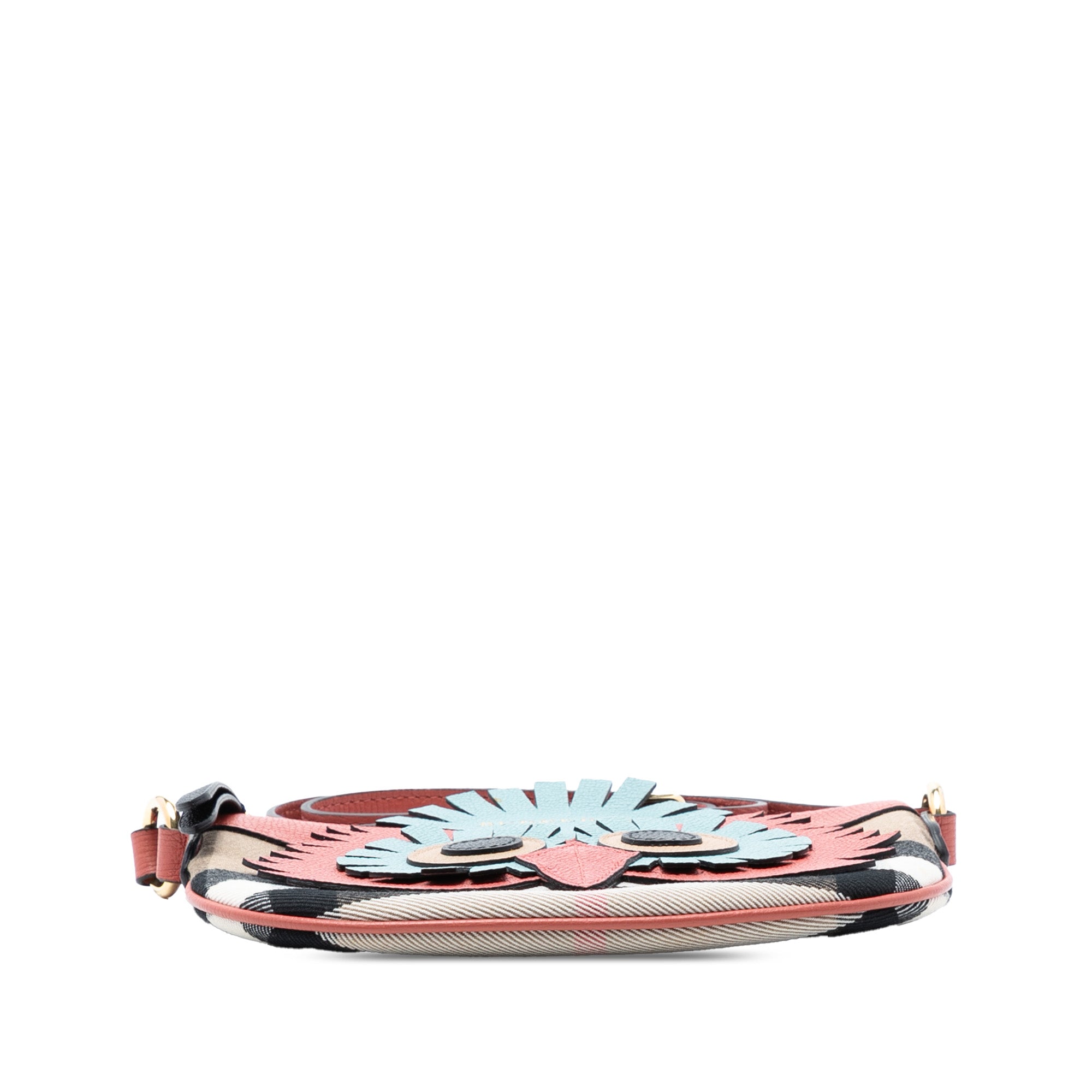 Product Details: Brown Burberry The Beast House Check Canvas and Leather Cocoa Owl Shoulder Bag. This shoulder bag features a canvas body with leather trim and motif, a flat canvas strap, a top zip closure, and an interior pocket. 5.5" L x 6.7" W x 0.6" D. Serial number TIVABB1285.
